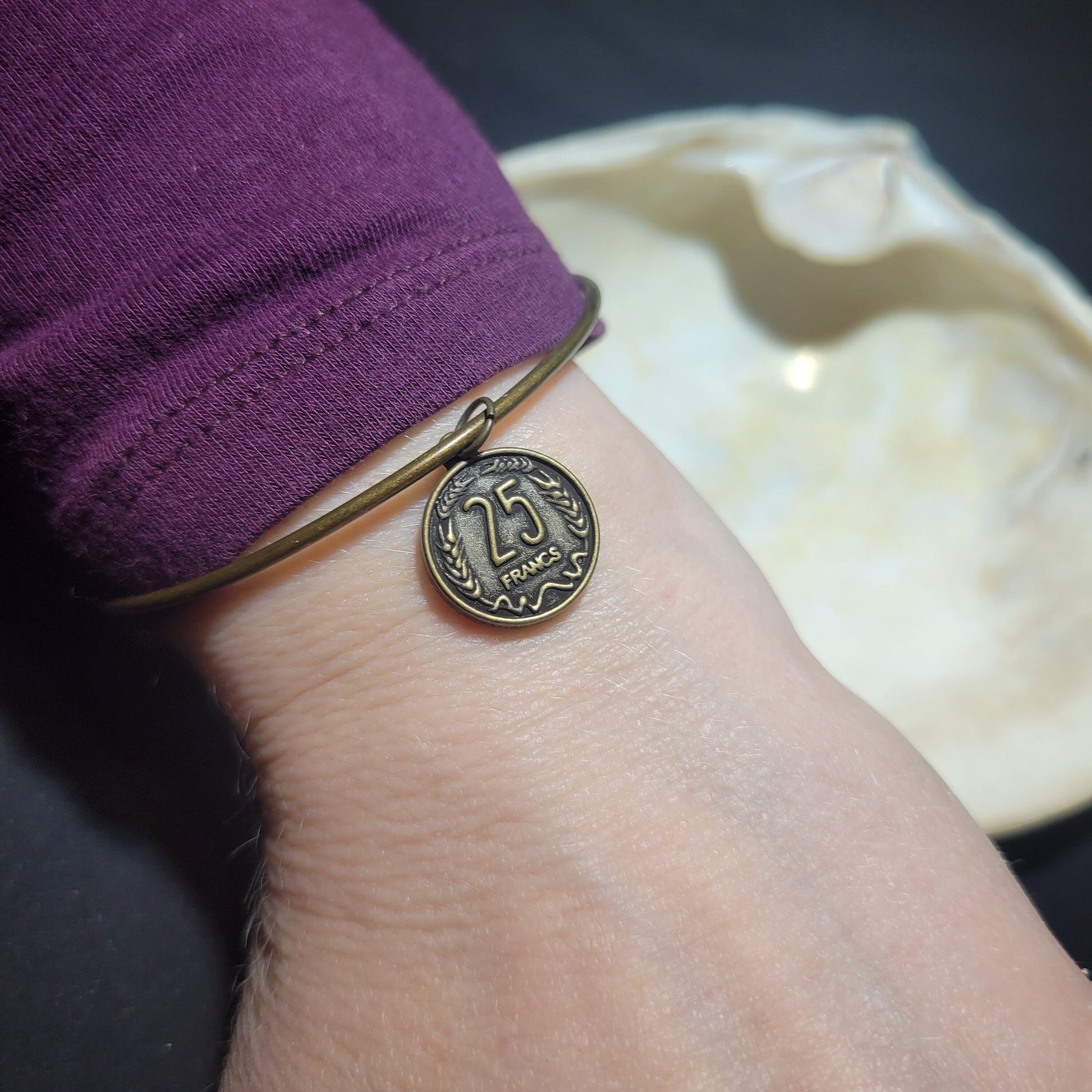 francs charm bracelet, charm bracelet, money charm bracelet, dangle bracelet, 25 francs, rigid bracelet