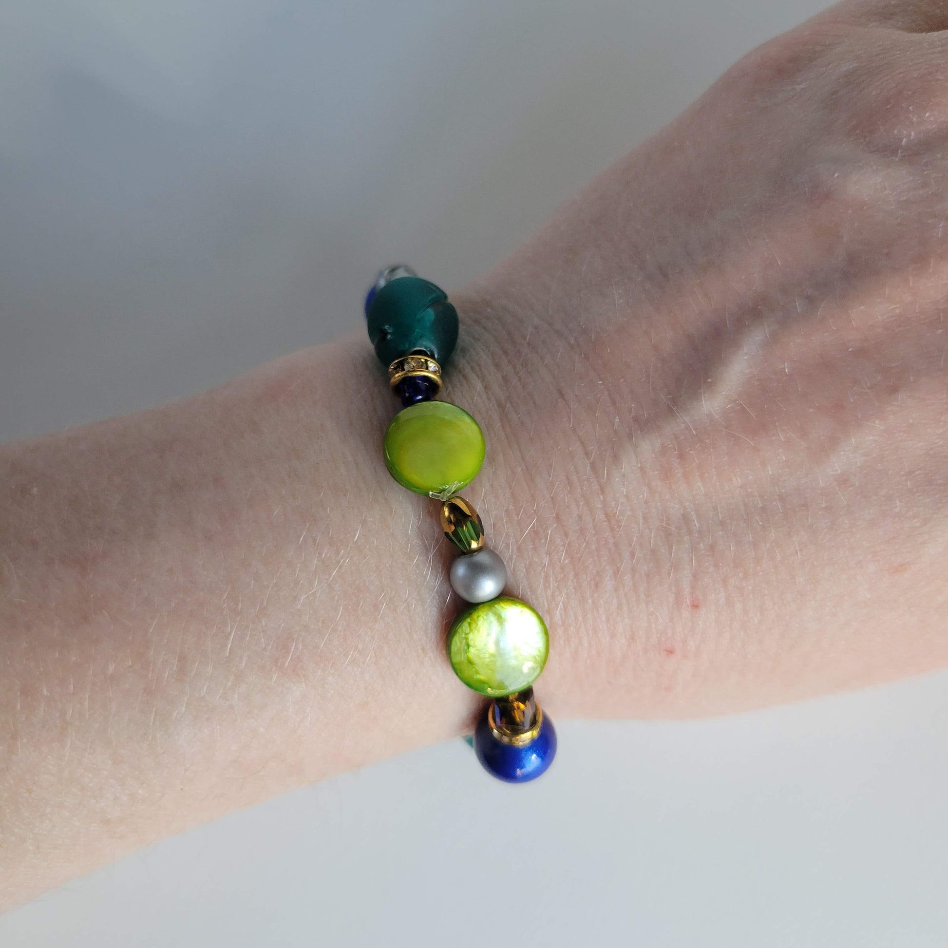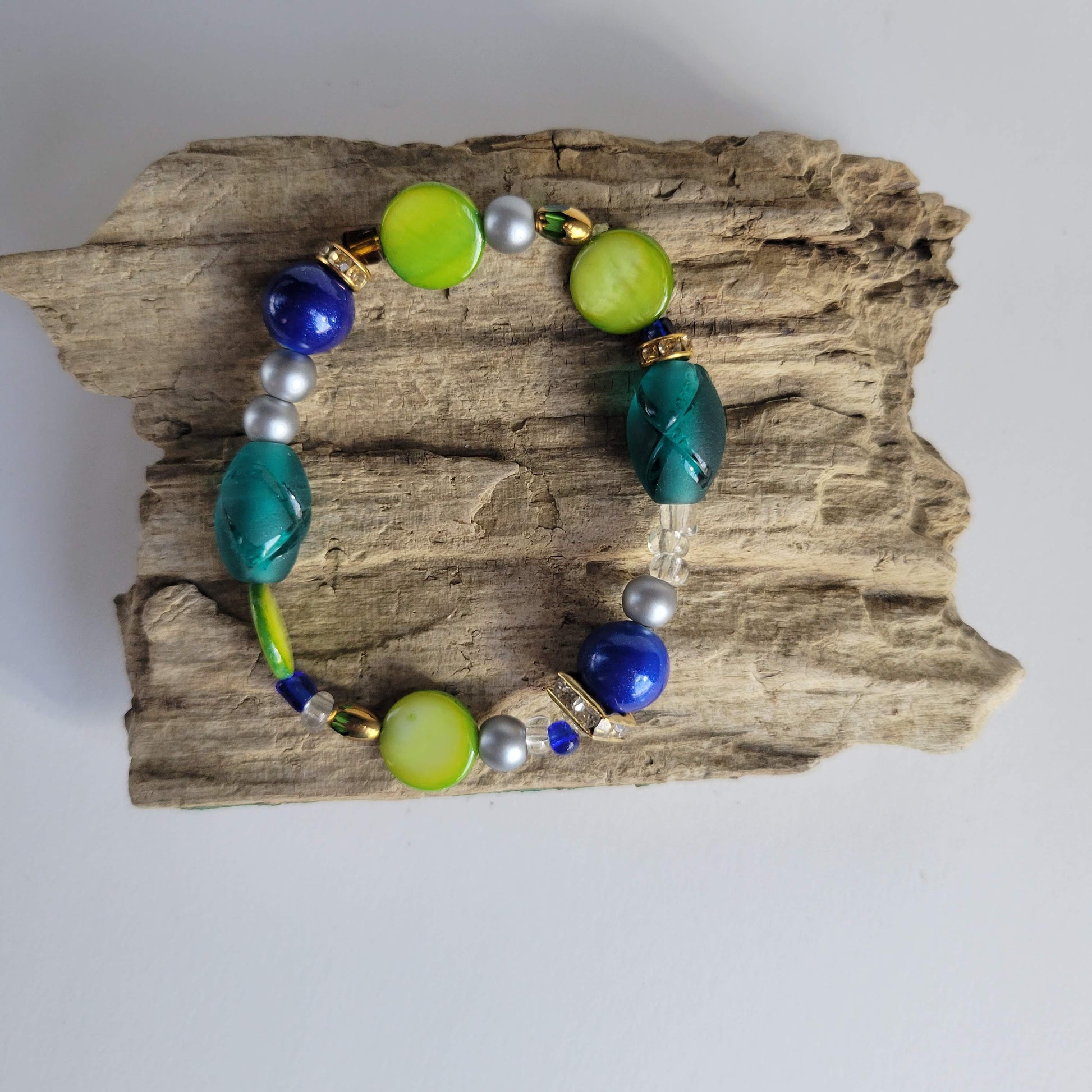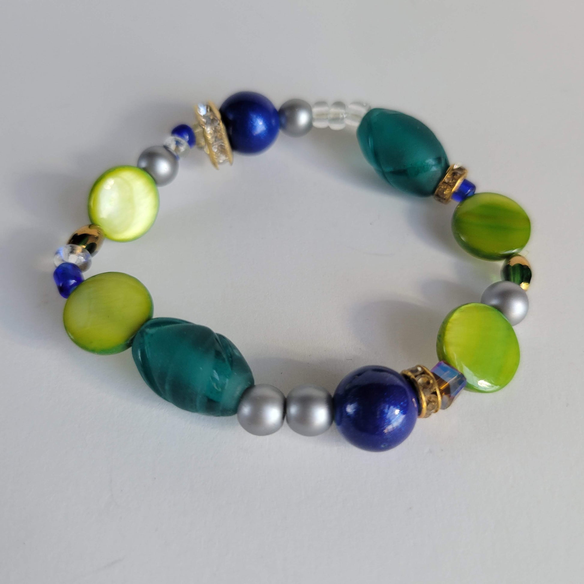 Stylishly accessorize your outfit with this beautiful beaded bracelet! Featuring green, blue, and grey beads on a stretch bracelet and finished with luxe gold rondelles, this accessory will add a splash of color to your look. Perfect for the fashion-forward trendsetter!