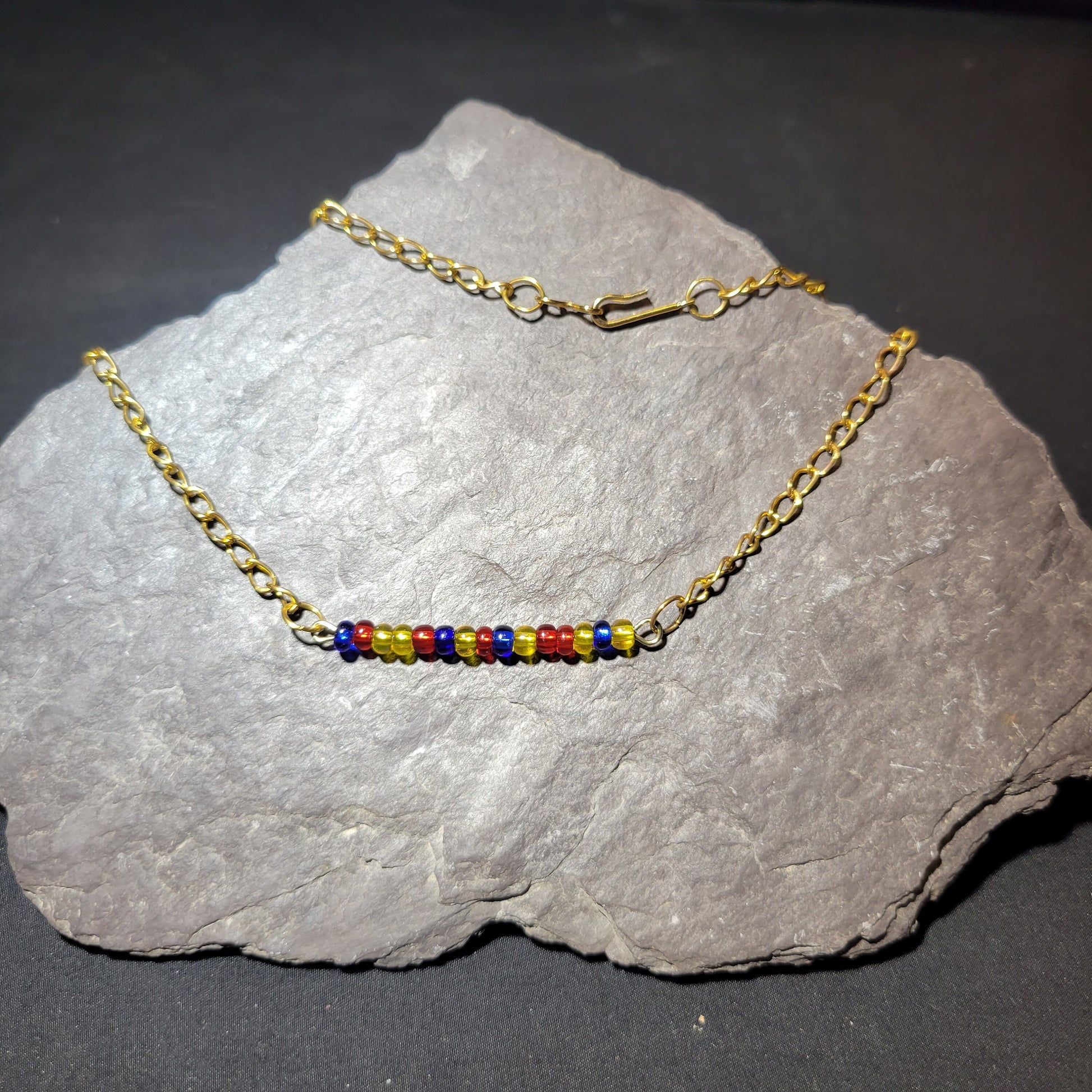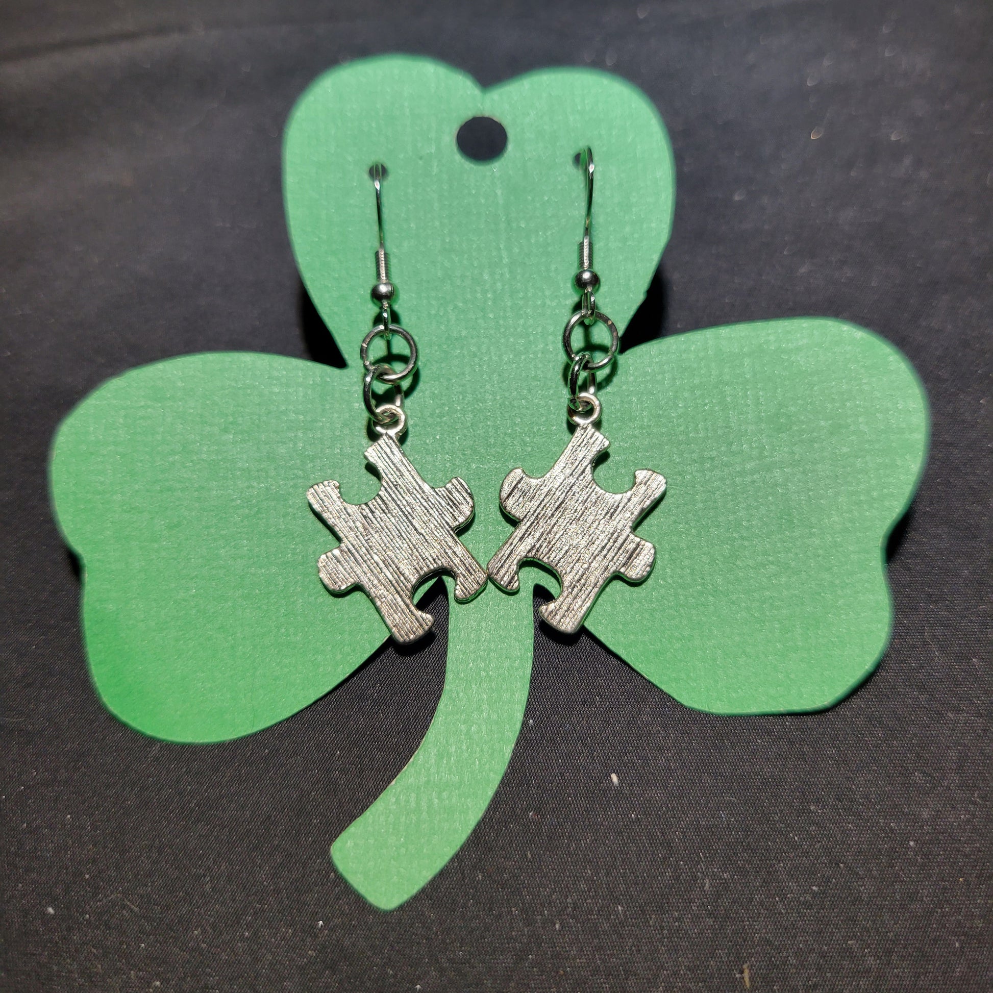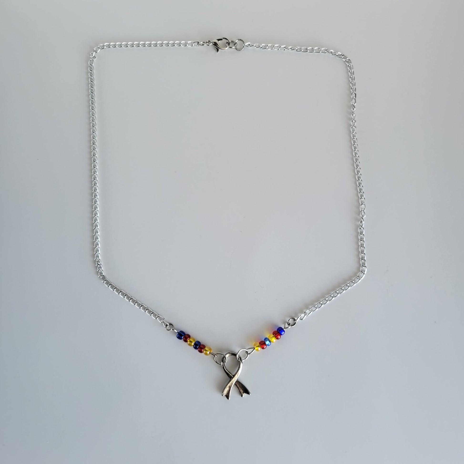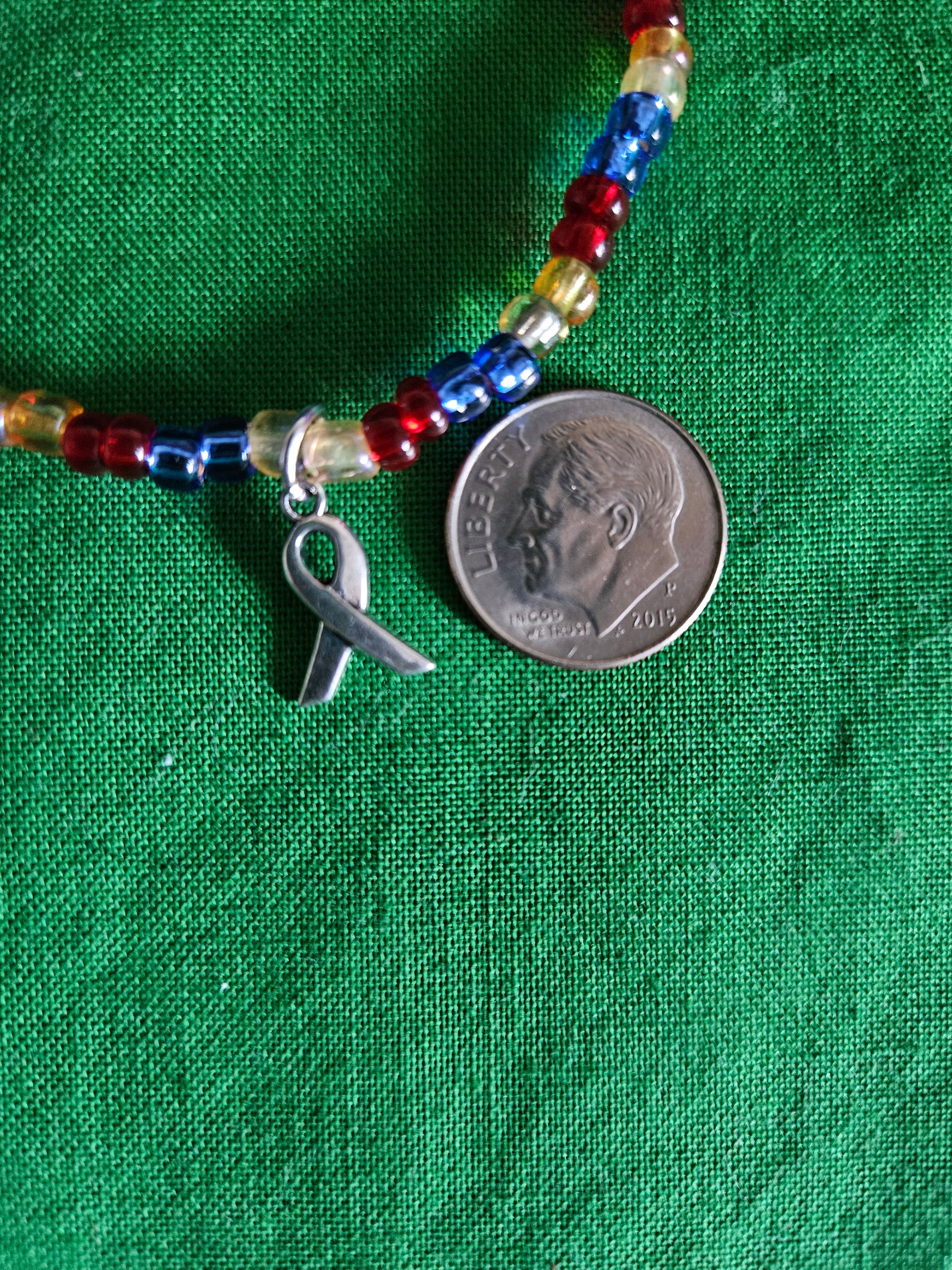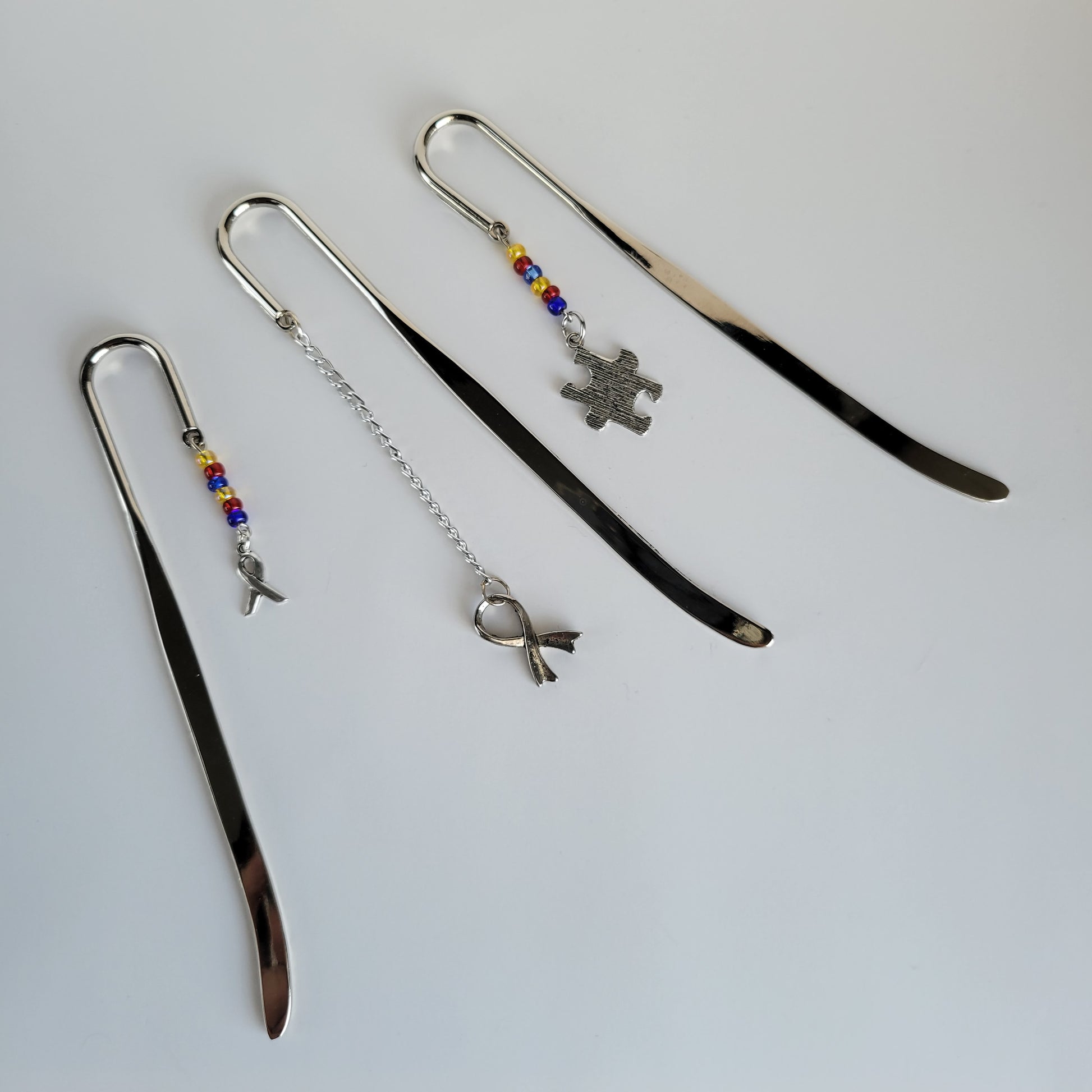 Beaded Autism awareness jewelry pieces available. Beaded bracelets in kid and adult sizes available. Silver ribbon charms on beaded bracelet or chain bracelet. Dangle earrings with ribbons and rainbow beads or plain silver puzzle piece earrings. Puzzle piece charms can be added to beaded earrings if desired. Bar necklaces are available in silver or gold colored chain and can be customized with ribbon or puzzle piece charms. Rainbow beads are blue, yellow, and red. Key chains come in O or D-shaped rings.