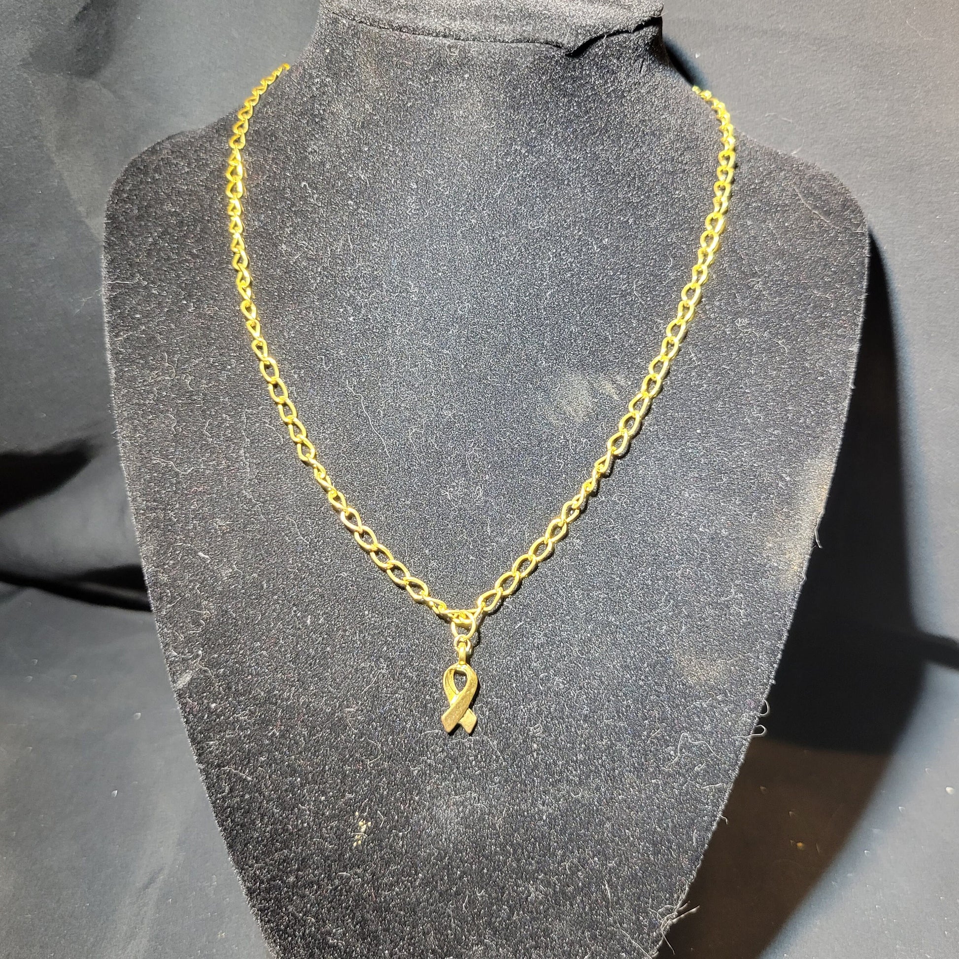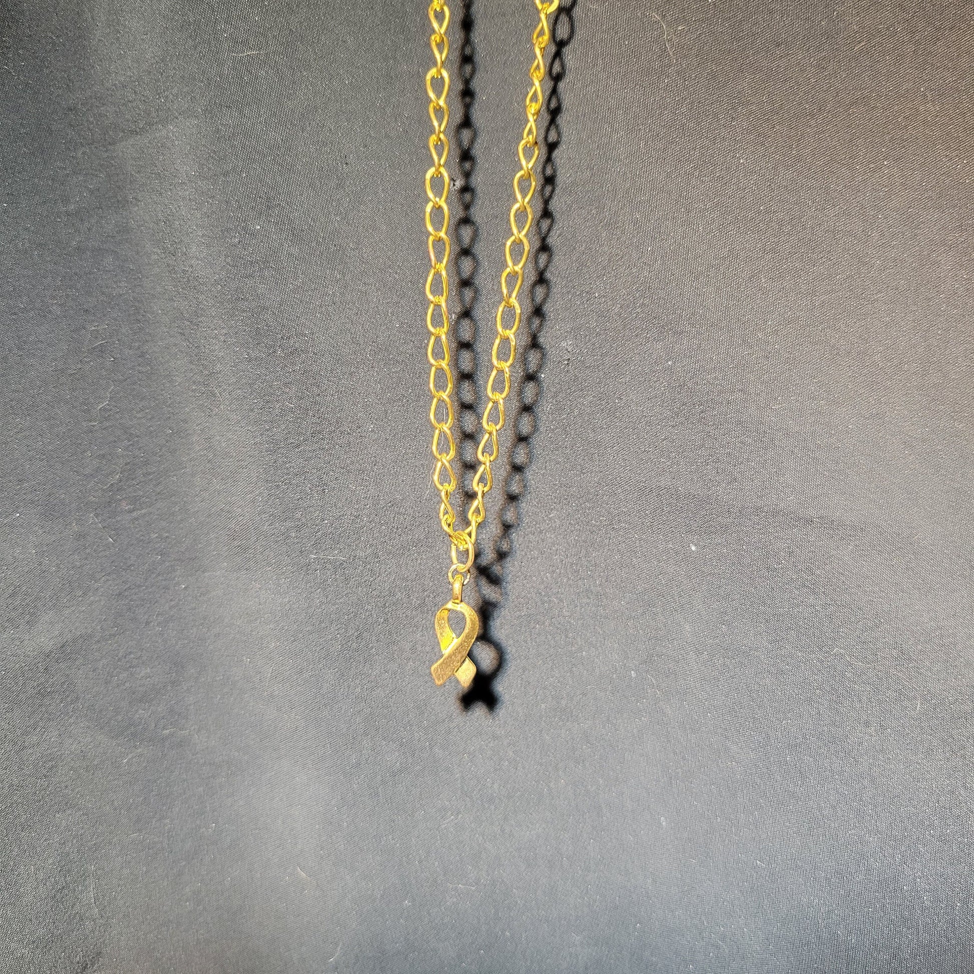 The charm is a 0.5-inch gold awareness ribbon and hangs on a 16-inch chain with a hook and eye clasp.Materials: awareness ribbon charm, curb chain, hook and eye clasp