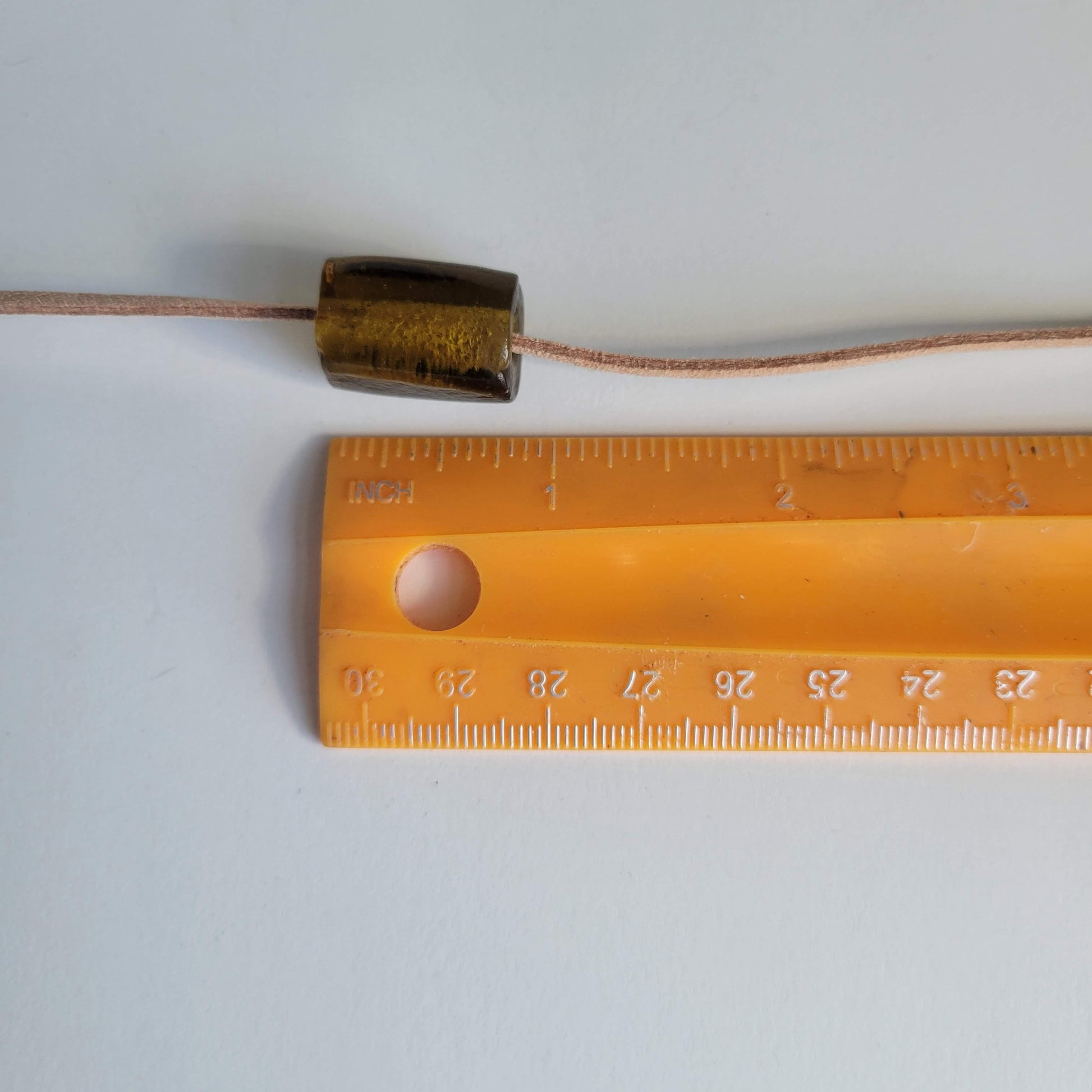 A rectangle black cube glass bead strung on 27" leather rope with hook clasp.