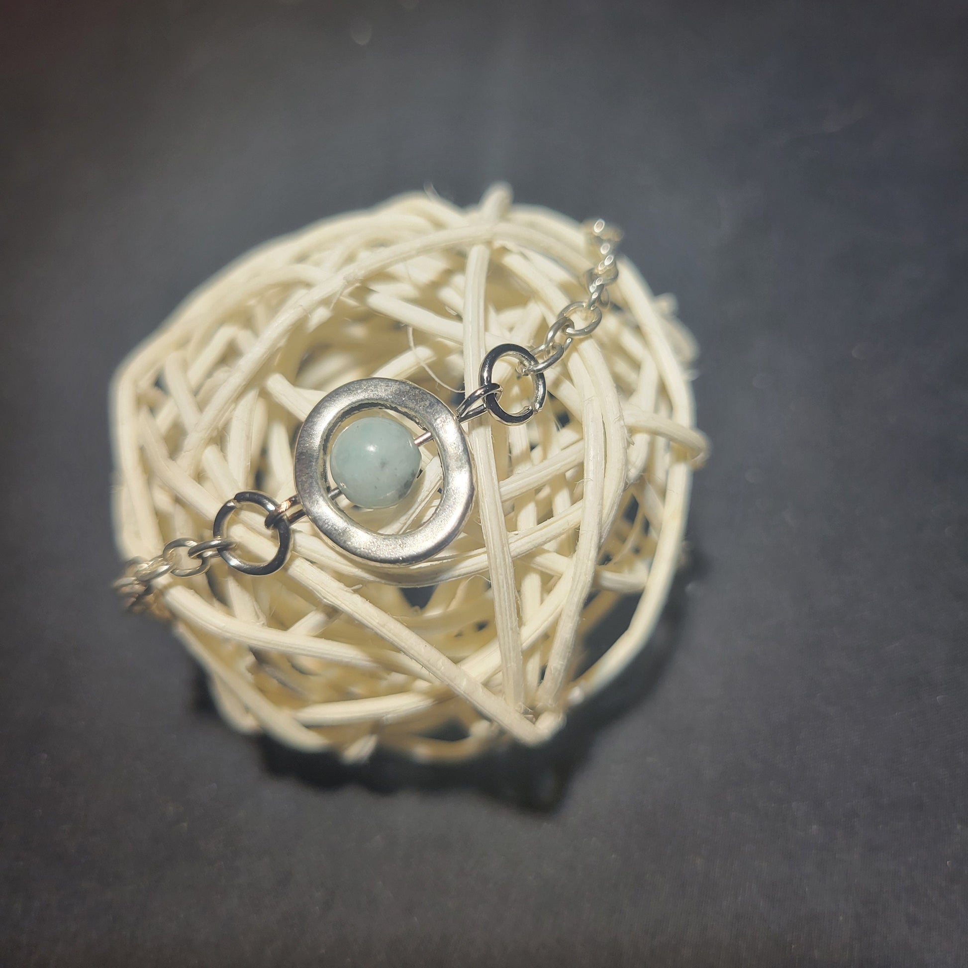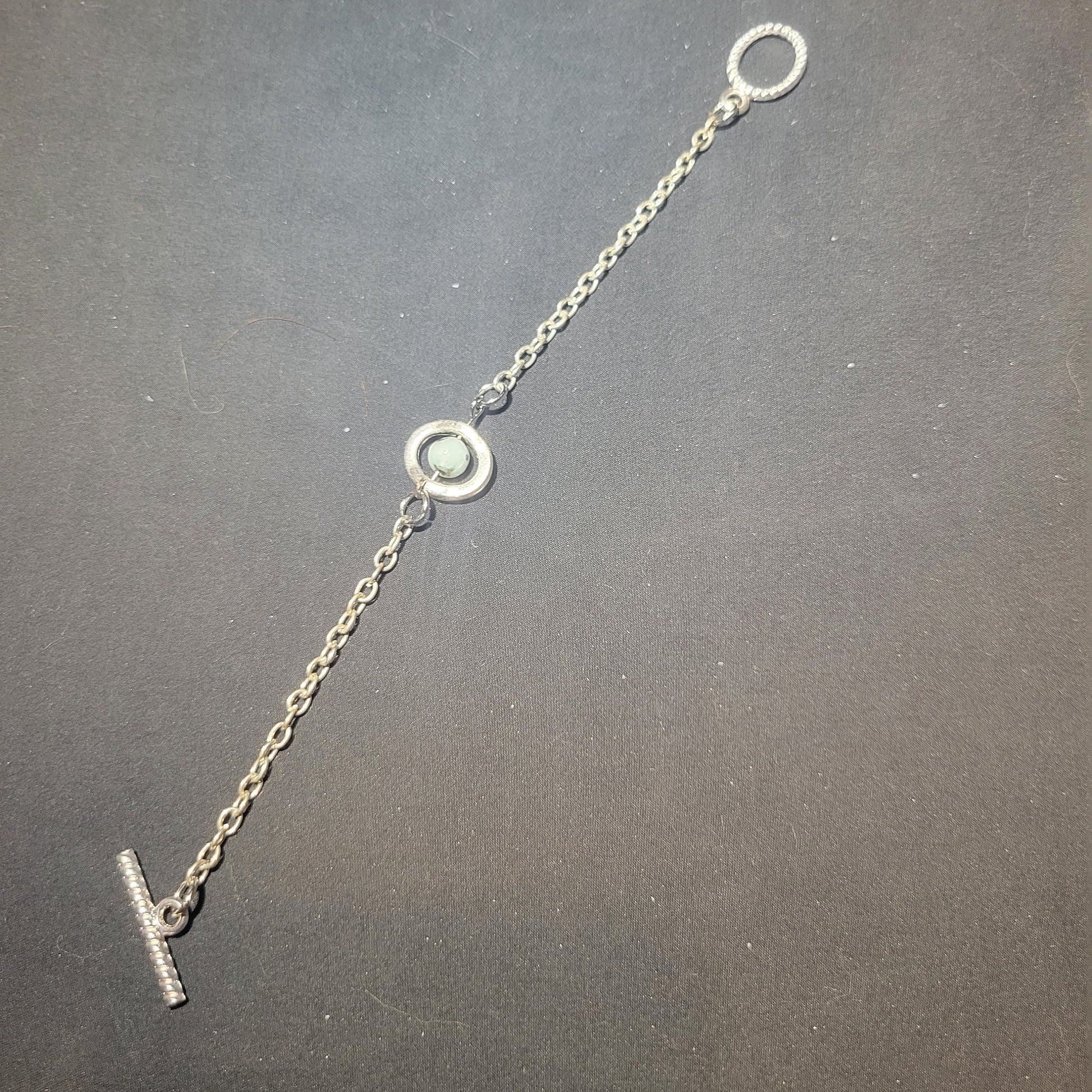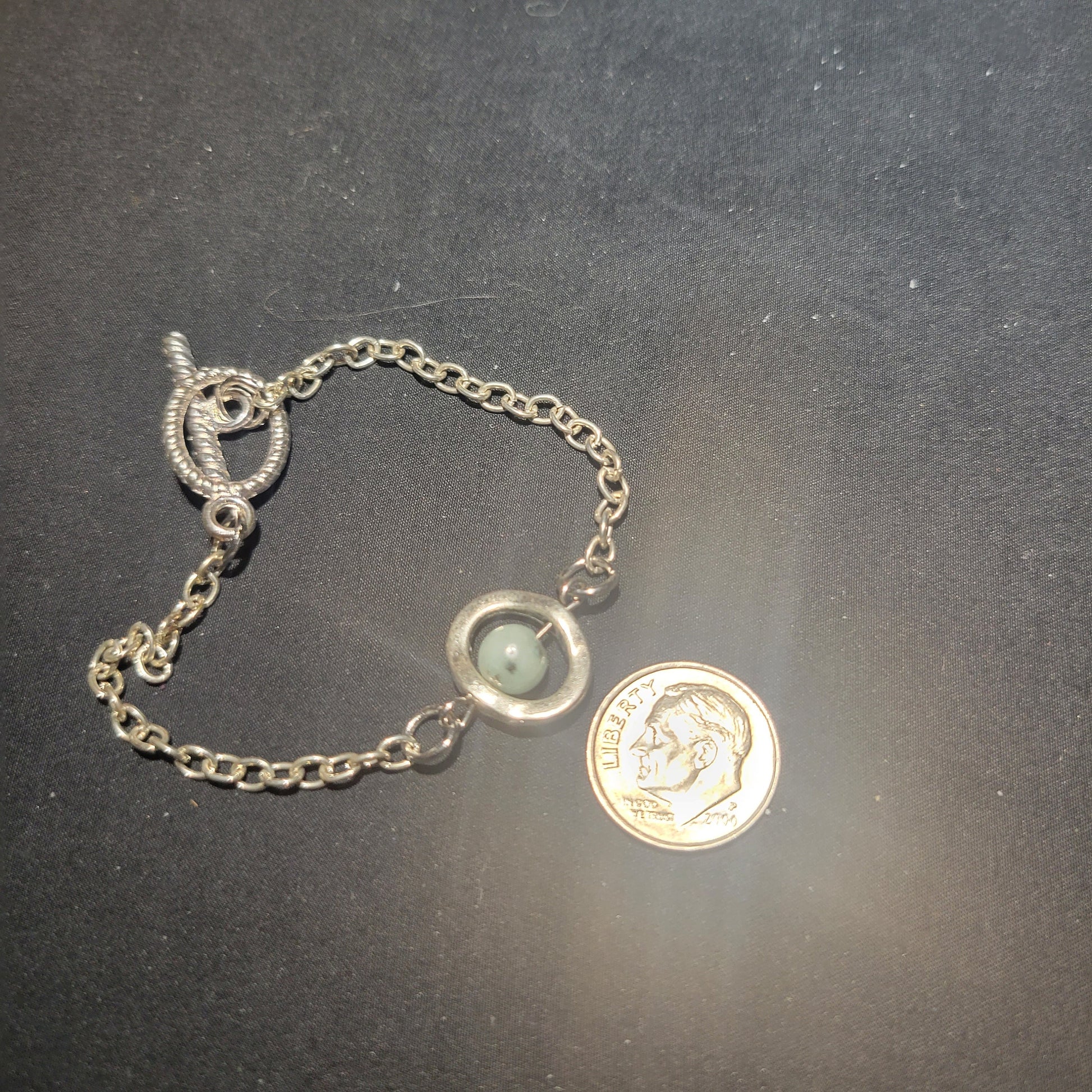 The chain bracelet closes with a toggle clasp. The circle encasing the bead is smaller than the size of a dime and the chain of the bracelet is a round link.Materials: light green bead, circle connector, round link chain, toggle clasp