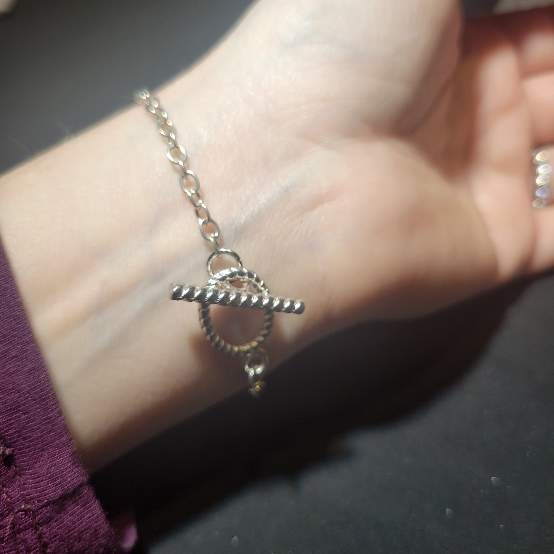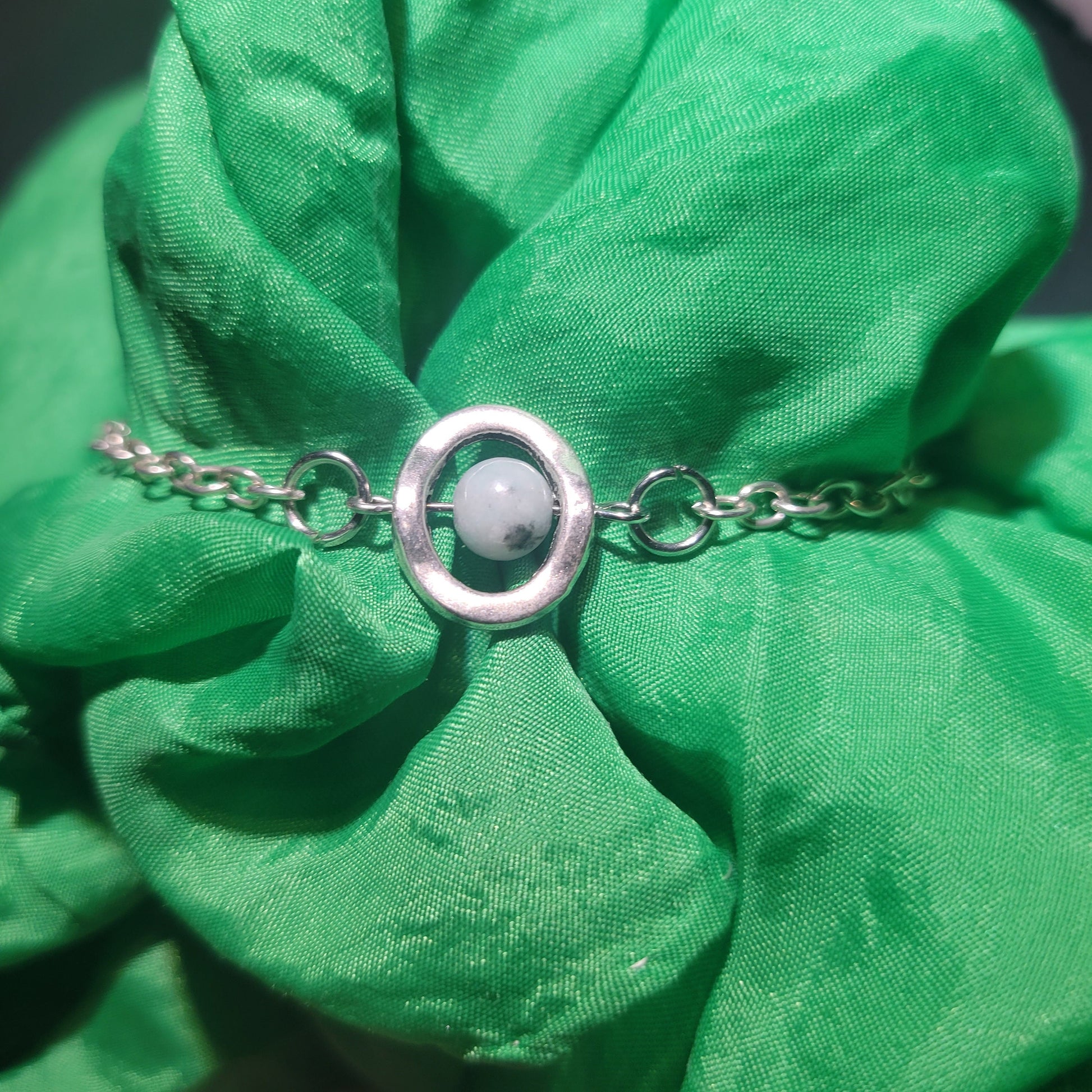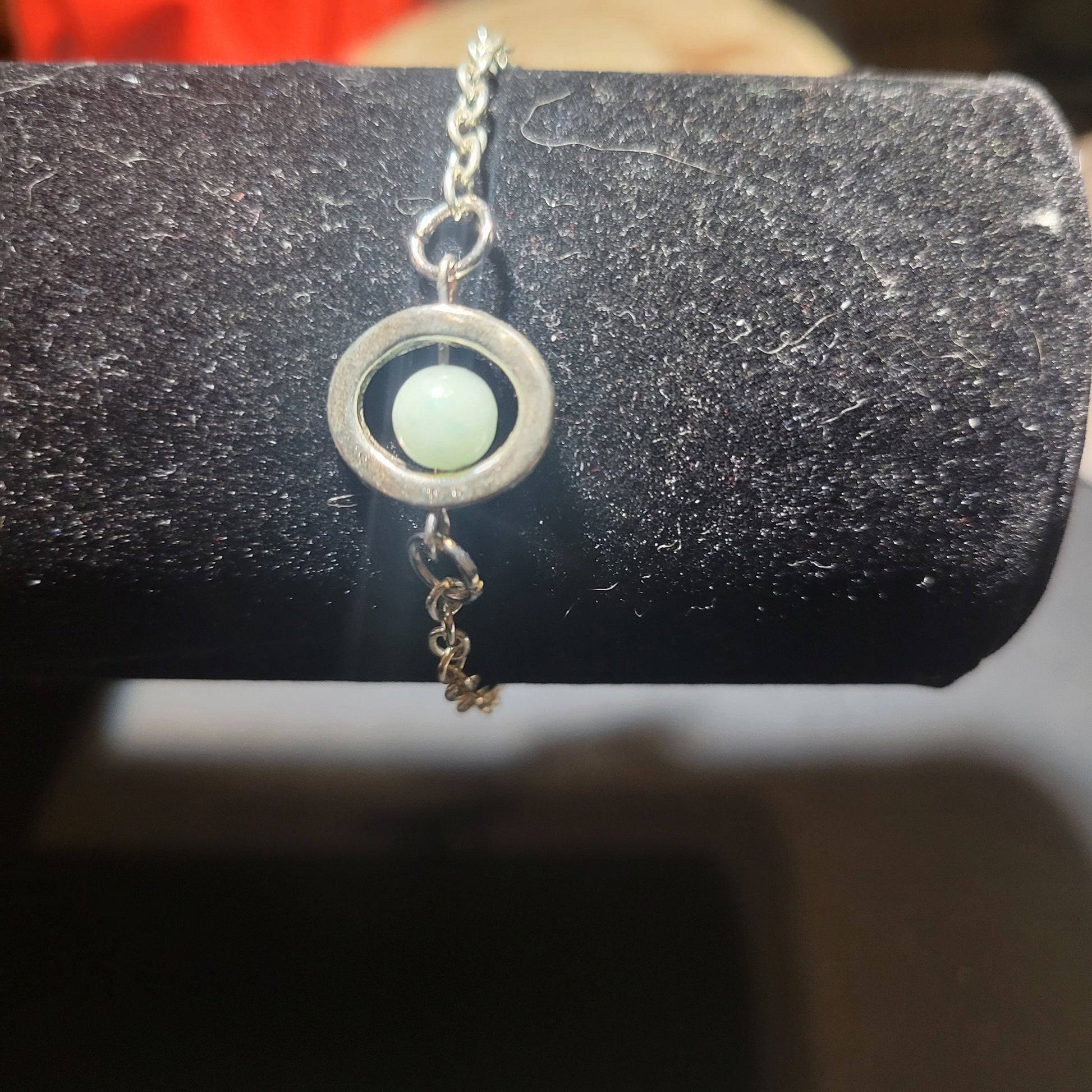 The chain bracelet closes with a toggle clasp. The circle encasing the bead is smaller than the size of a dime and the chain of the bracelet is a round link.Materials: light green bead, circle connector, round link chain, toggle clasp