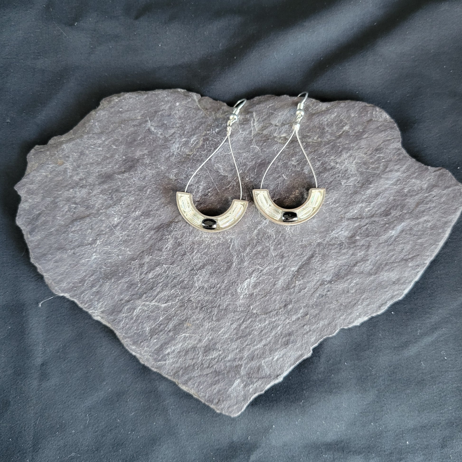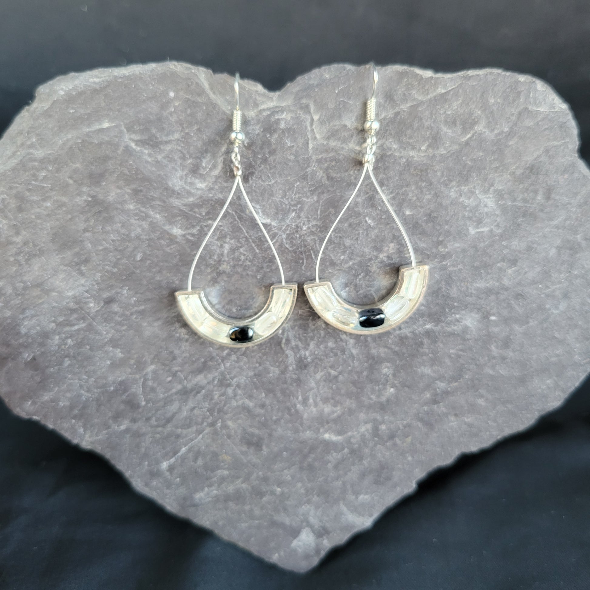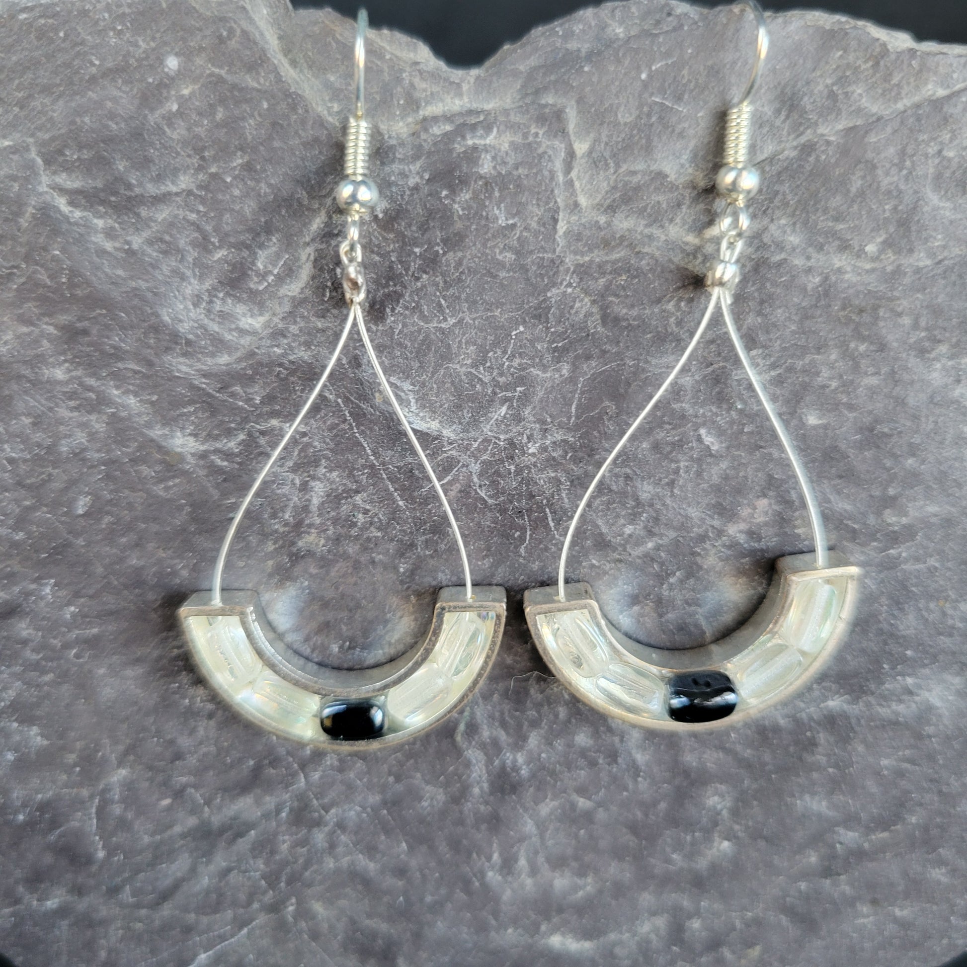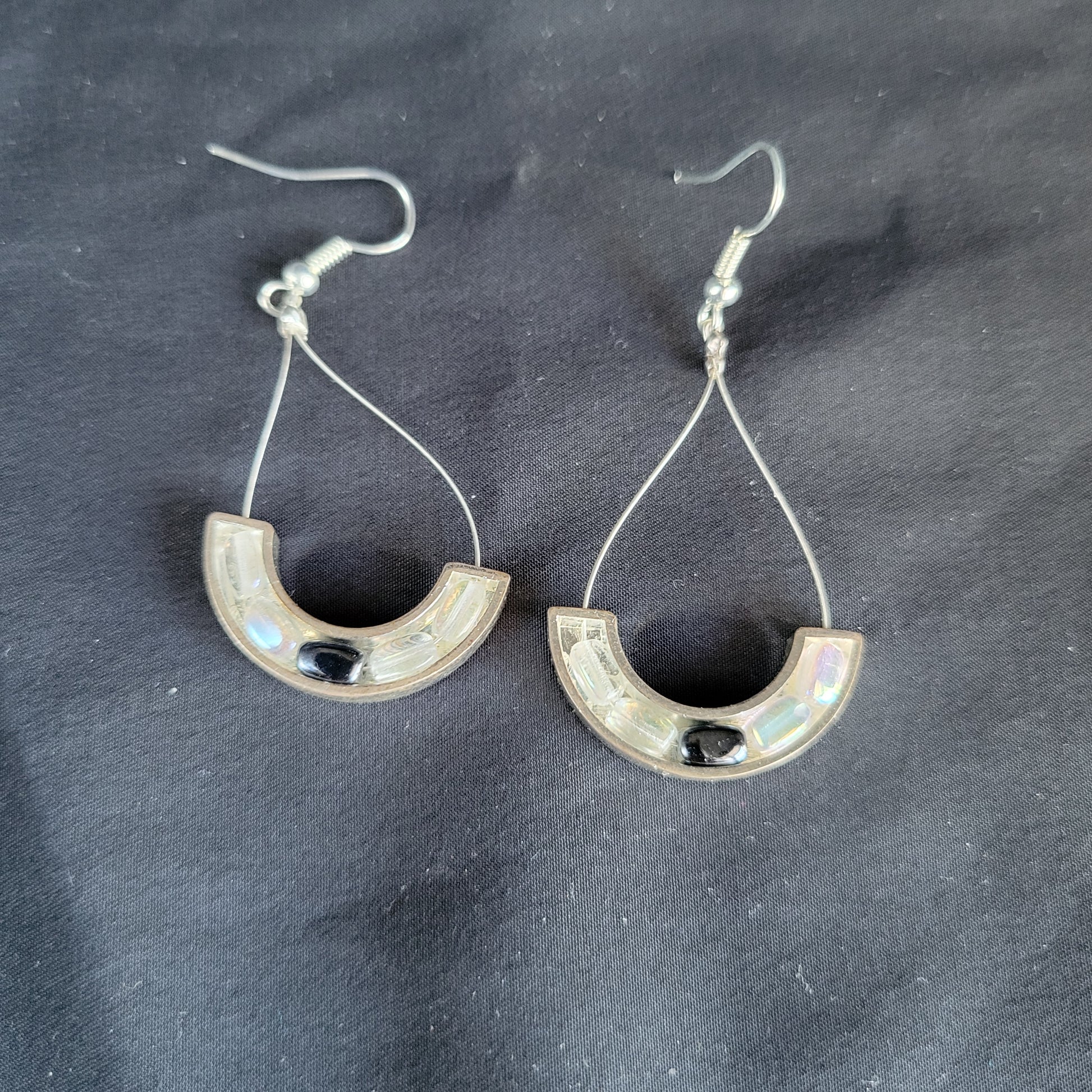Expertly crafted, these Beaded Metal Crescent Teardrop Earrings feature clear and hematite oval beads delicately strung in a hollow metal crescent. The result is a stunning combination of sparkle and shine, perfect for adding a touch of elegance to any outfit. With their unique design and quality materials, these earrings are sure to make a statement.