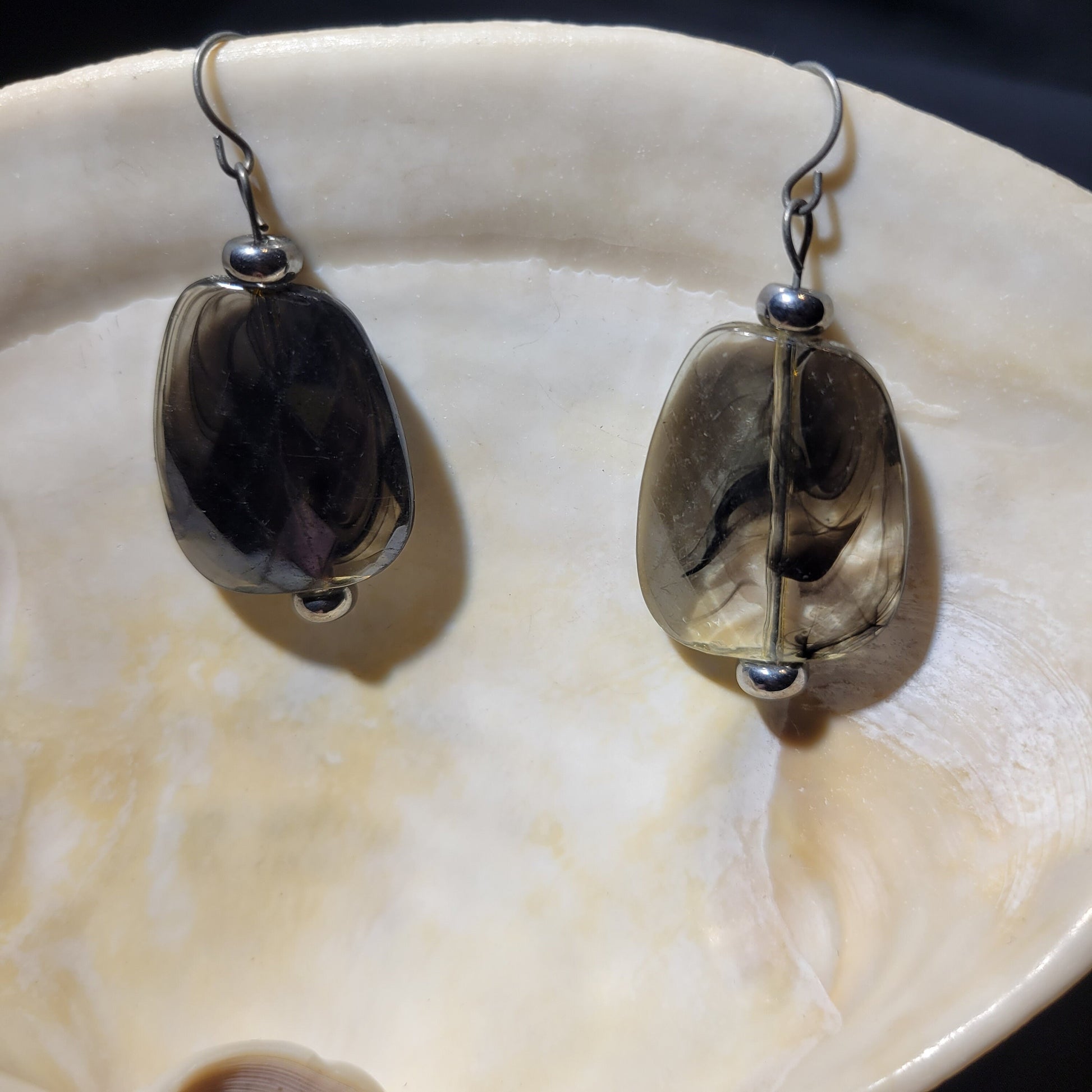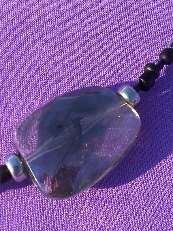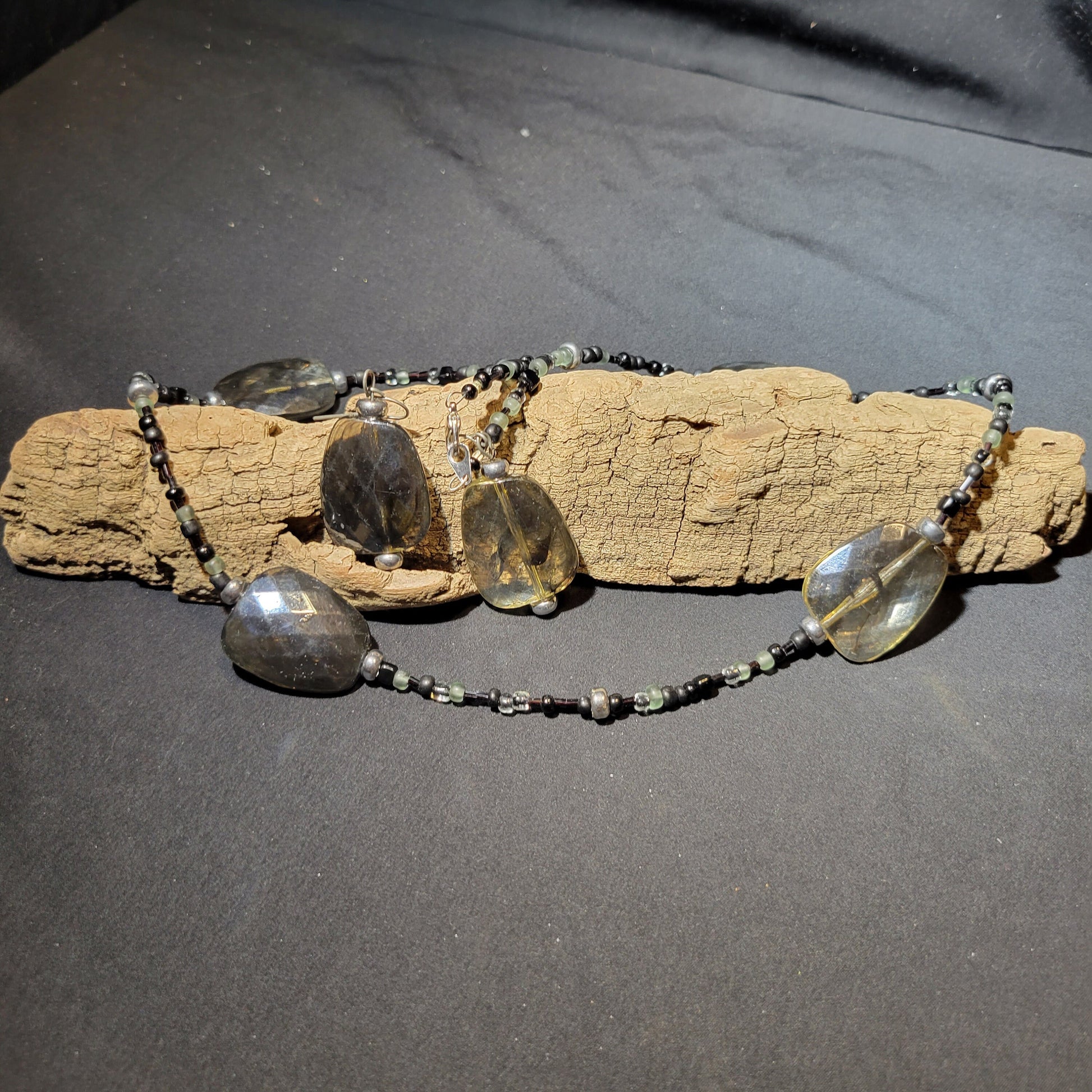 This simple, lightweight beaded necklace measures at approximately 20". Earrings match large beads and are about 1" on a hook earring.Materials: acrylic beads, seed beads, brushed nickel, lobster clasp, metal accent beads, wire