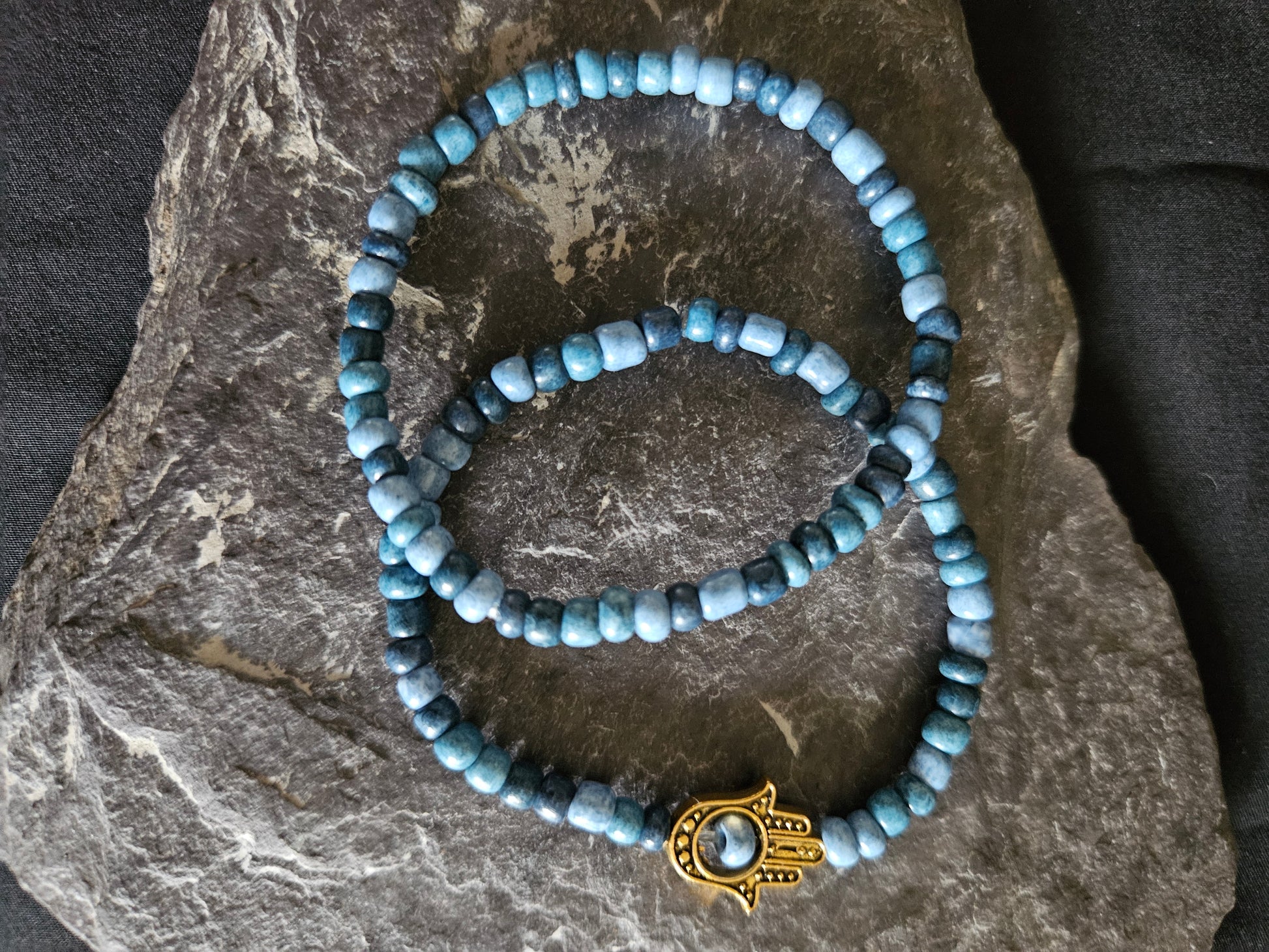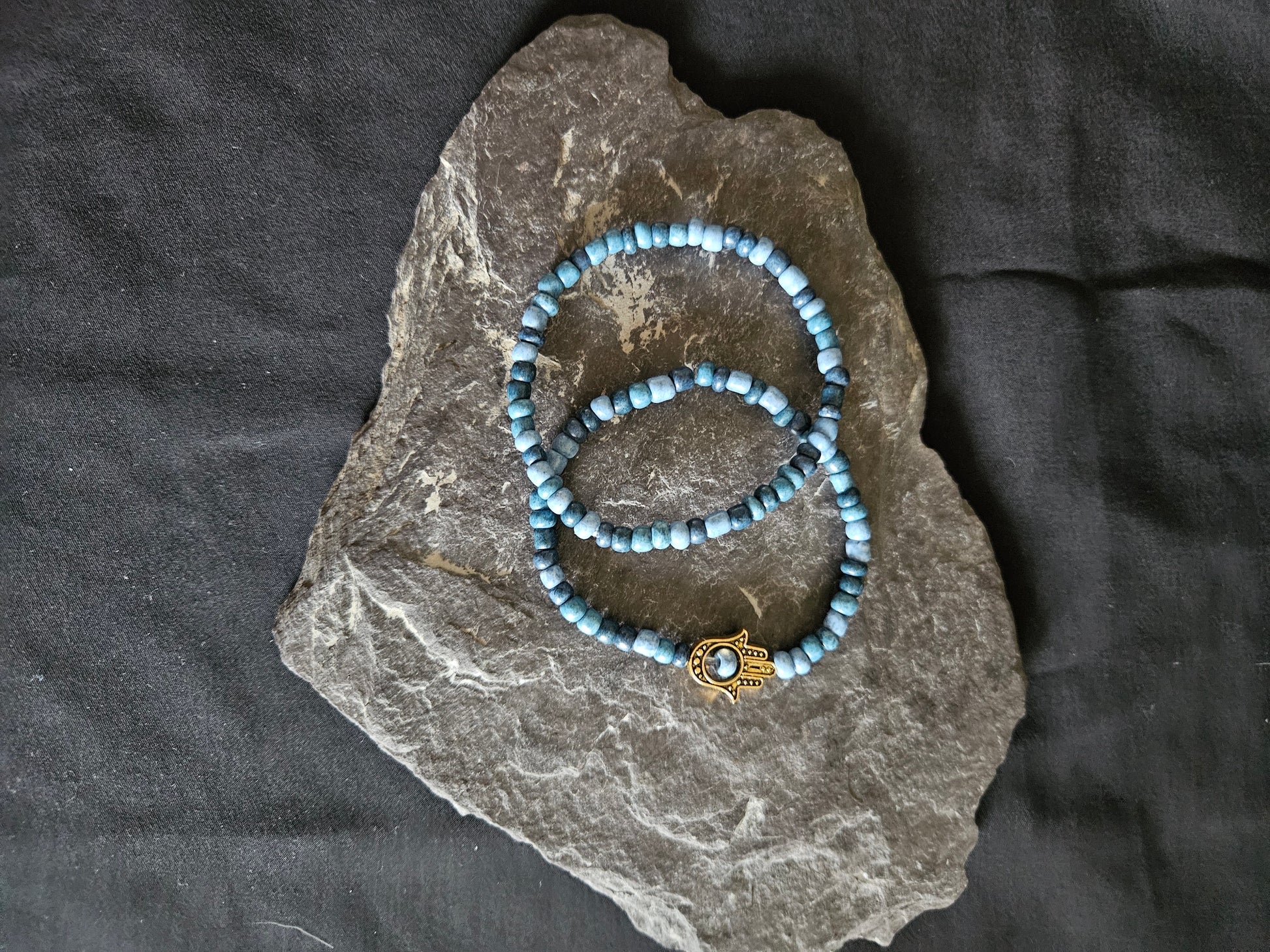 This stunning set features two blue beaded bracelets. One blue beaded bracelet adds a touch of color and texture, while the other features a hollow hamsa hand charm for added symbolism and protection. Add a touch of fashion and meaning to your wardrobe with our Blue Hamsa Hand Beaded Set!