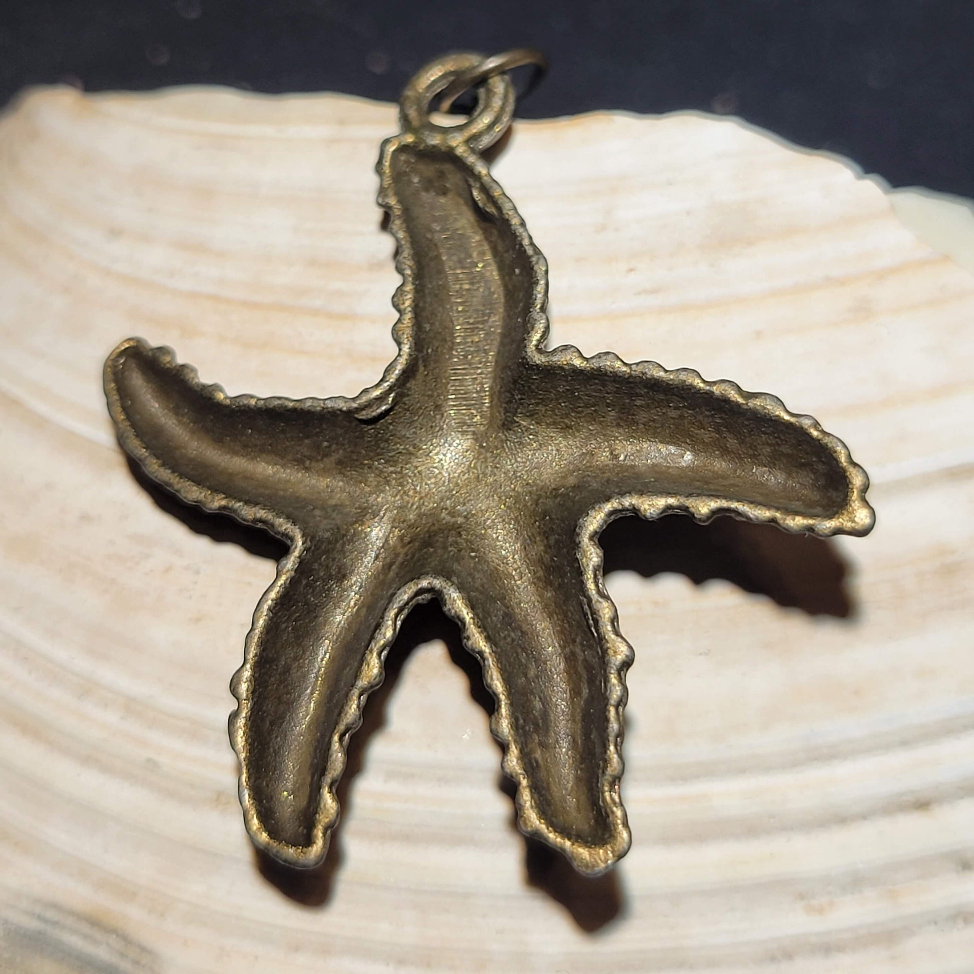 This pendant necklace is great for the ocean life lover in your life. It is comprised of a bronze starfish measuring about 1.25 inches hanging on 19 inches of bronze chain closed with a lobster clasp.Materials: bronze starfish pendant, bronze curb chain, lobster clasp, jump rings