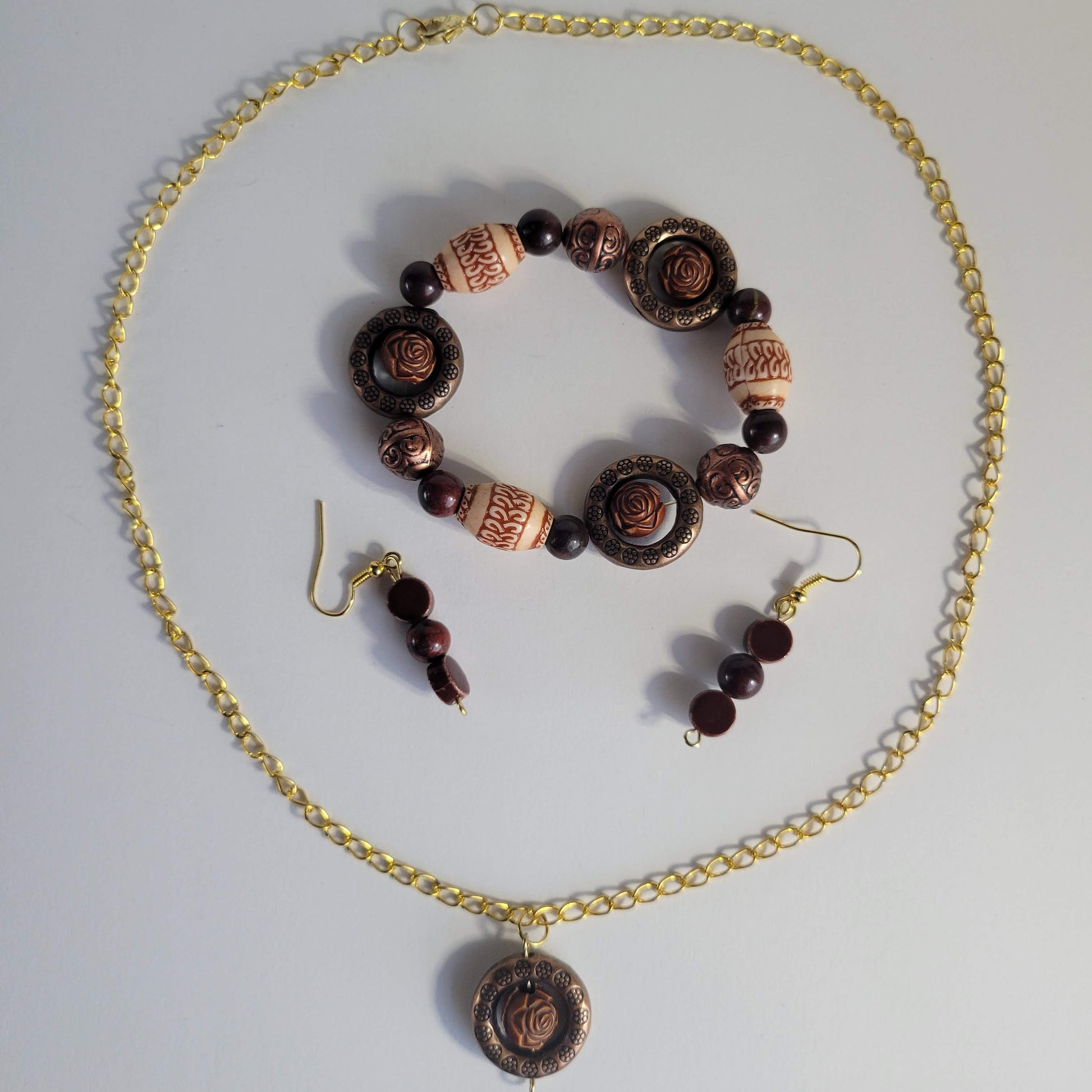 This beautiful Brown and Copper Jewelry Set is the perfect accent to any outfit. Embellished with stunning copper and brownish-red beads on a gold chain necklace, a beaded bracelet on elastic, and small beaded earrings on gold hooks, this set is sure to put a sparkle in your style. Get it now and be dazzled!