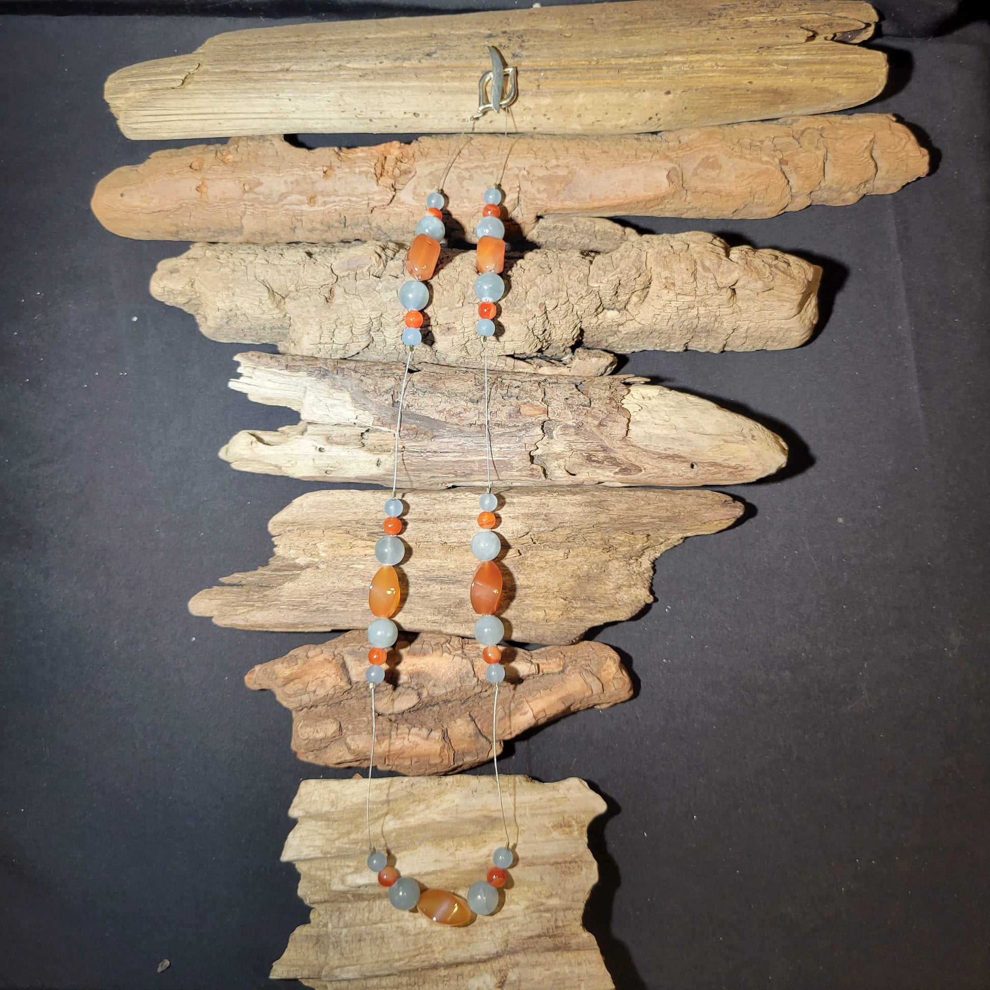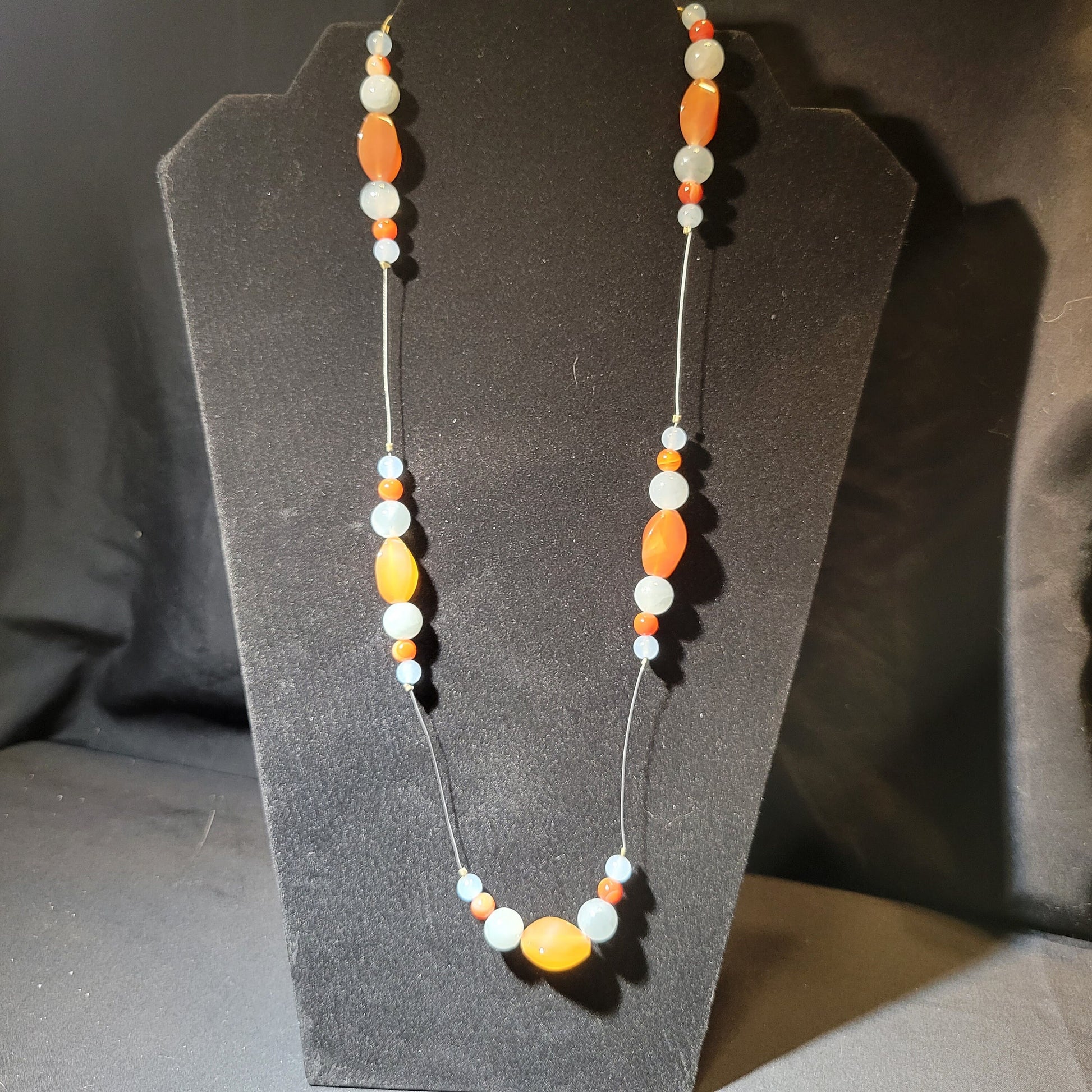 This simple beaded necklace of burnt sienna and light blue beads may make you think of nature instead of the office when you wear it. The symmetric design alternates blue and sienna glass beads with some breathing room in between. The necklace measures about 20" or more but is as light as air with a simple toggle clasp.