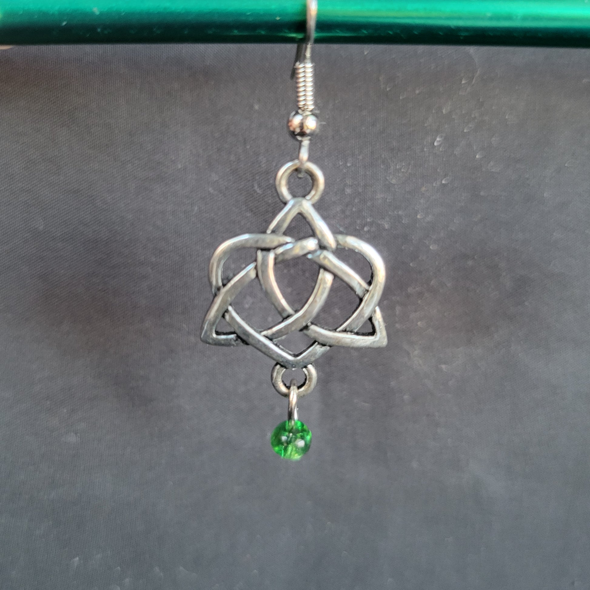These earrings feature a beautiful green bead hanging beneath a traditional Celtic heart knot. Crafted with precision and symbolism, these earrings are perfect for those seeking a unique and meaningful accessory. Add a touch of Celtic heritage to your wardrobe with these elegant earrings.