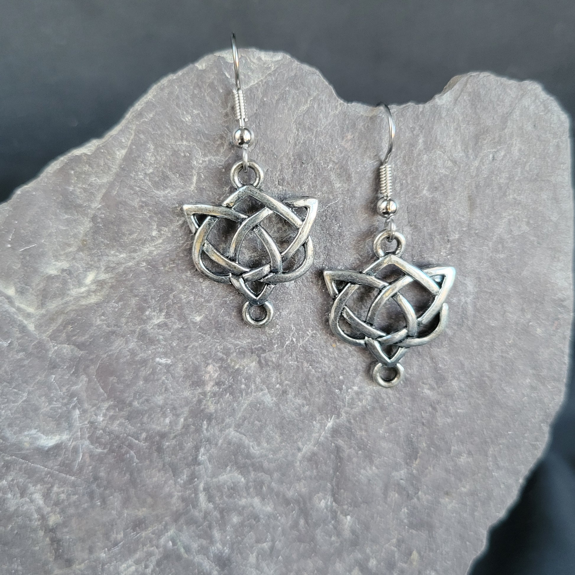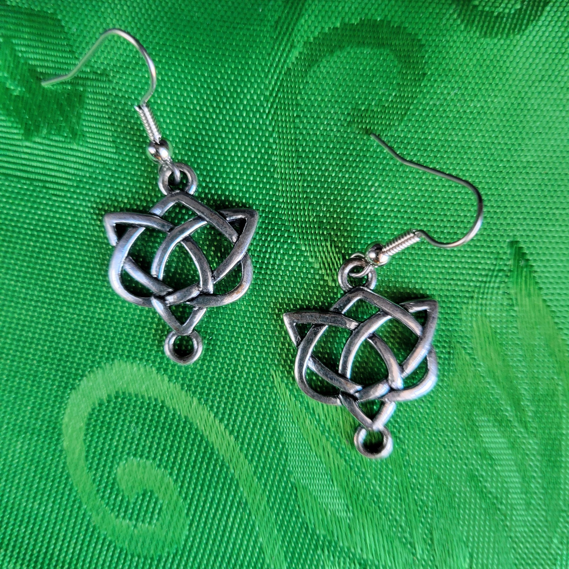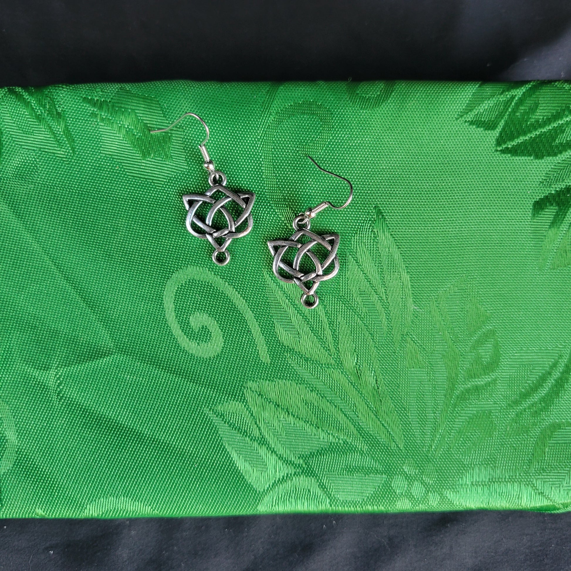 Add a touch of Celtic charm to your look with our Gunmetal Celtic Knot Earrings! These earrings feature a beautifully intricate Celtic knot design intertwined with an upside-down heart, making them a unique and eye-catching accessory. Made with earring hooks for easy wear, these earrings are perfect for any occasion. Enhance your style with these elegant and meaningful earrings.