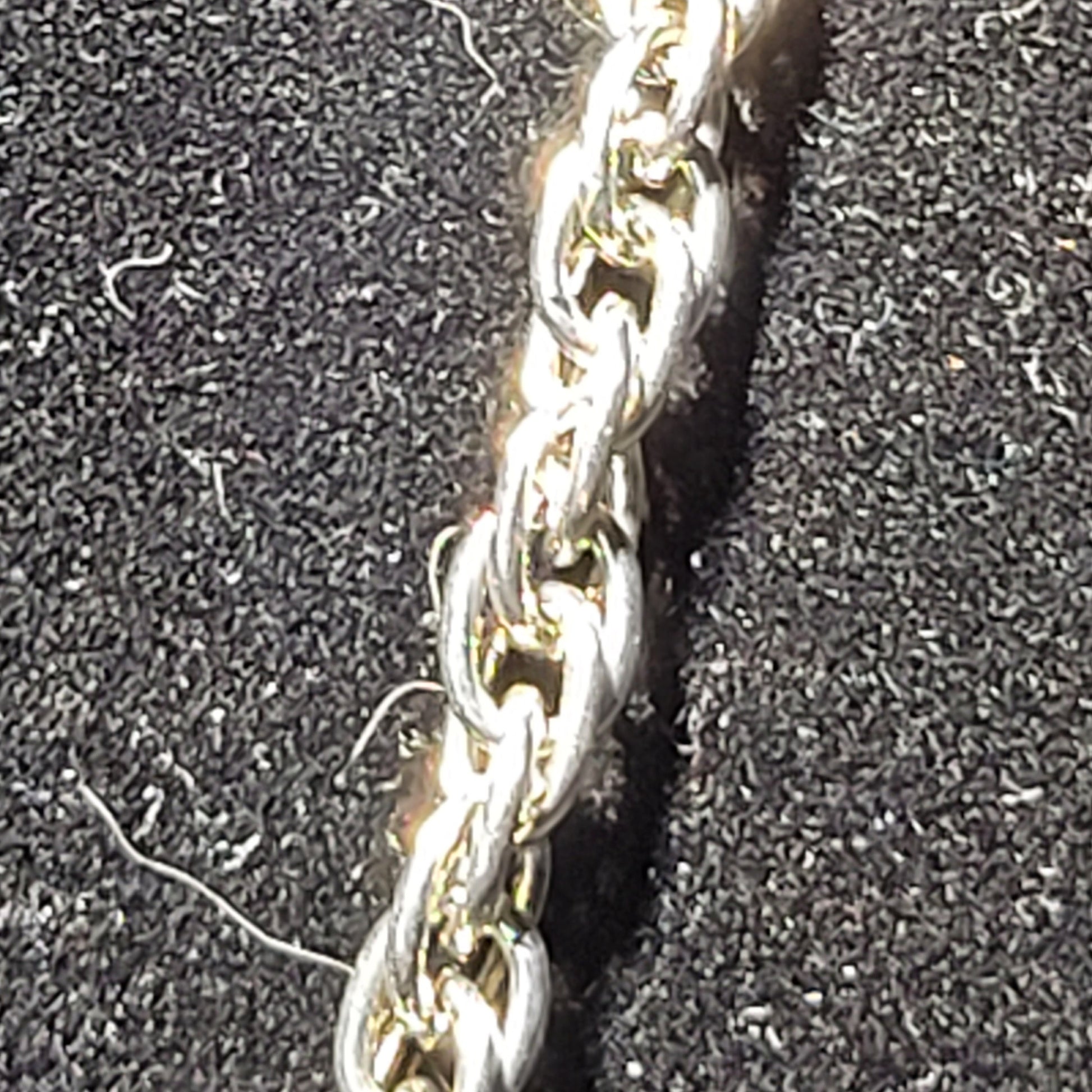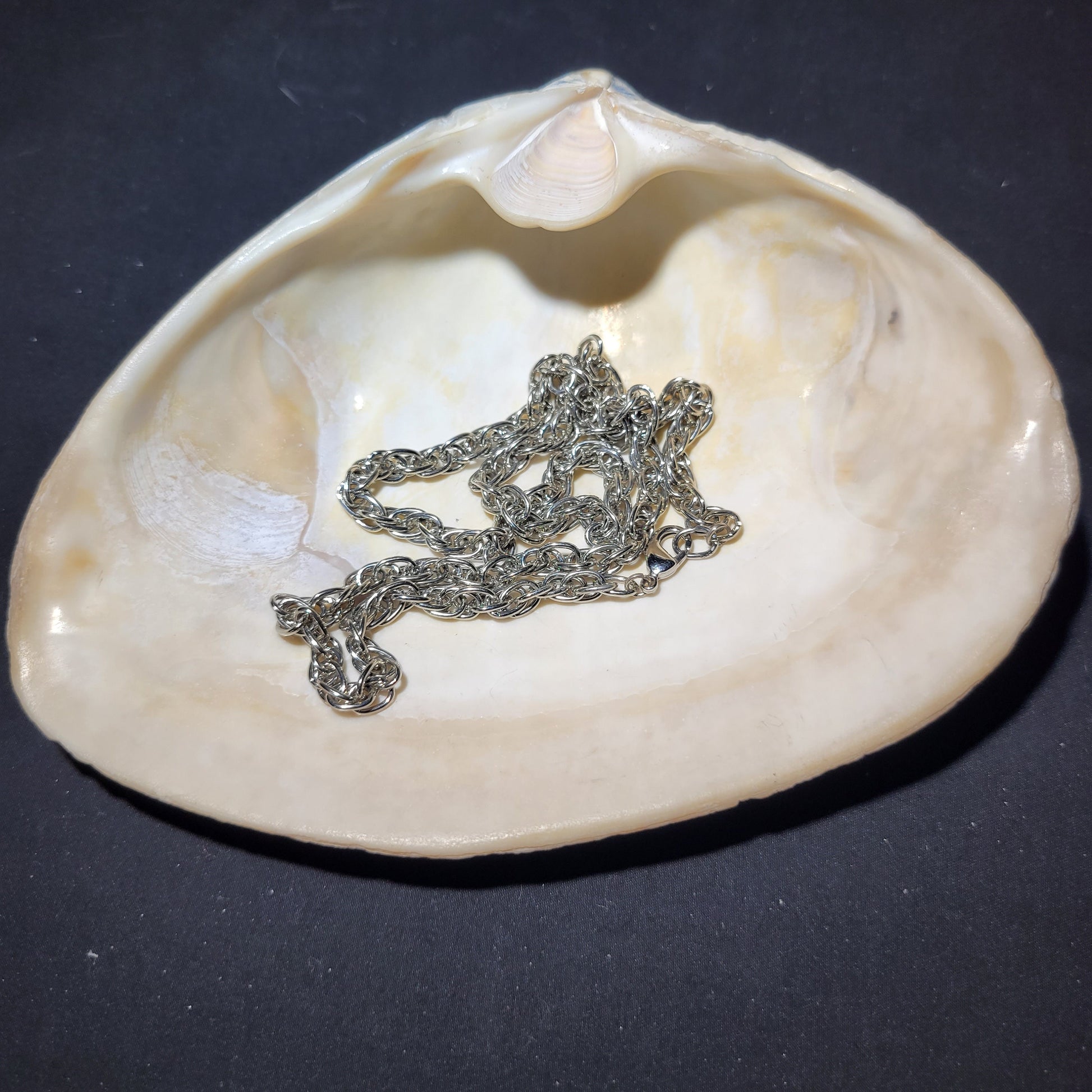 The chain is 19 inches long and closes with a lobster claw clasp.Materials: rope chain, lobster clasp, jump rings
