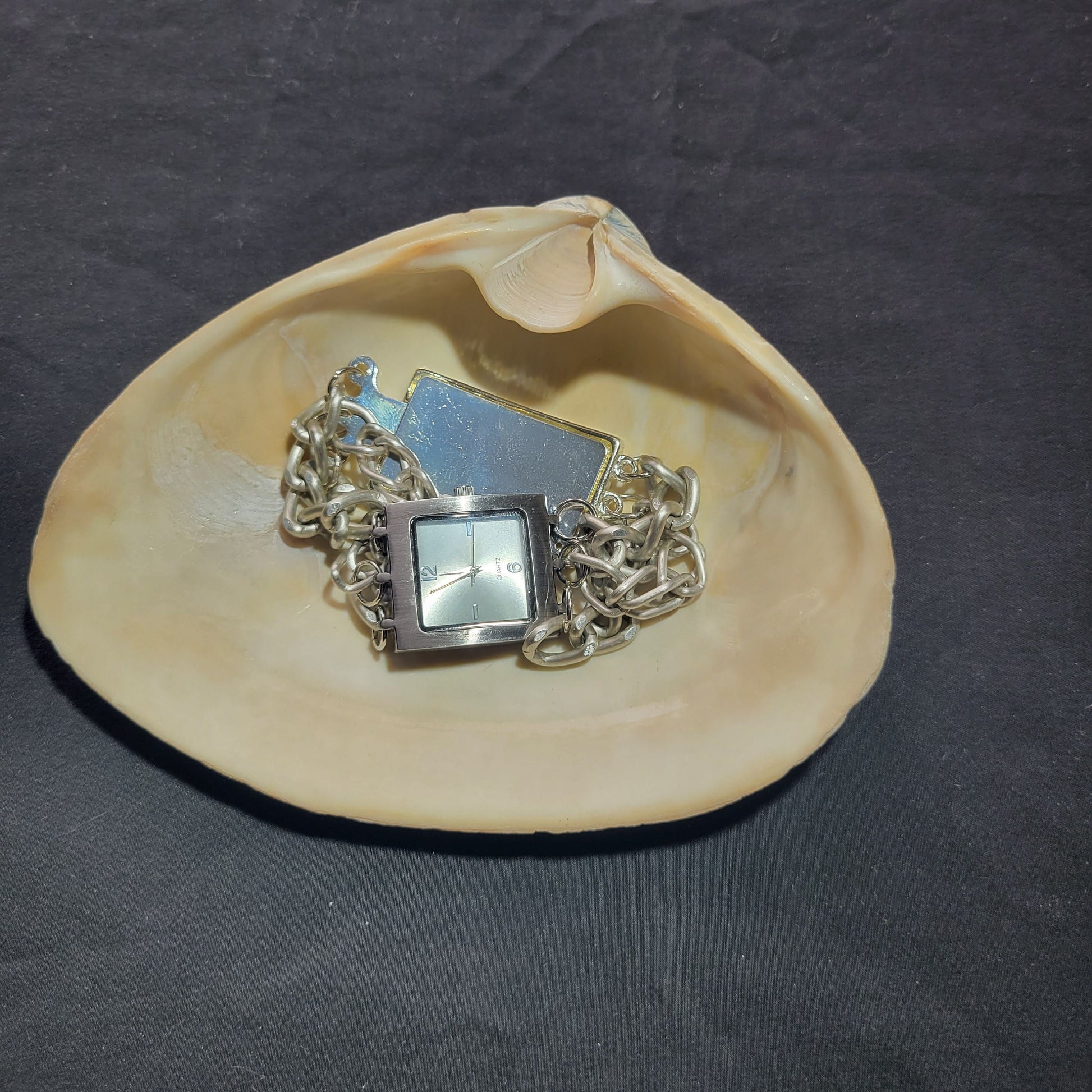 Introducing the Chain Watch with Large Clasp, a luxurious accessory for your wrist. Combining a timeless watch face with a sophisticated chain band, this piece is sure to become an elegant focal point of your ensemble. Adorned with a stunning blue face, this piece is perfect for elevating any look with its classic design and robust presence.