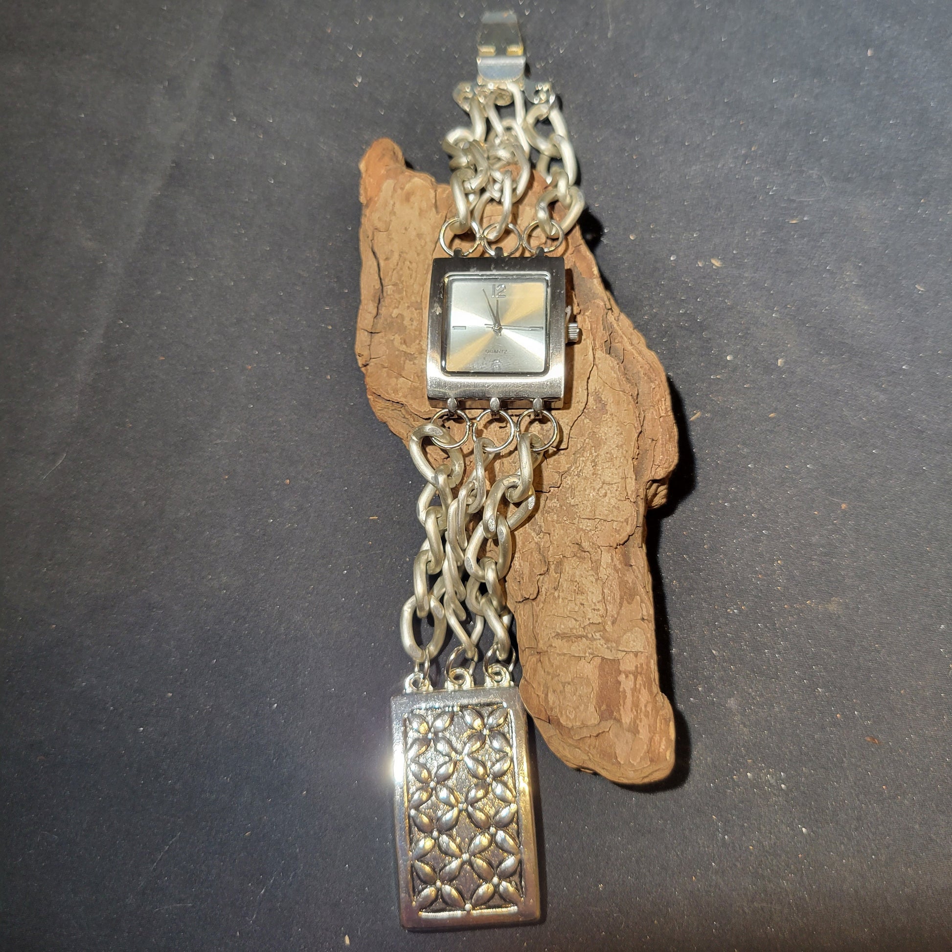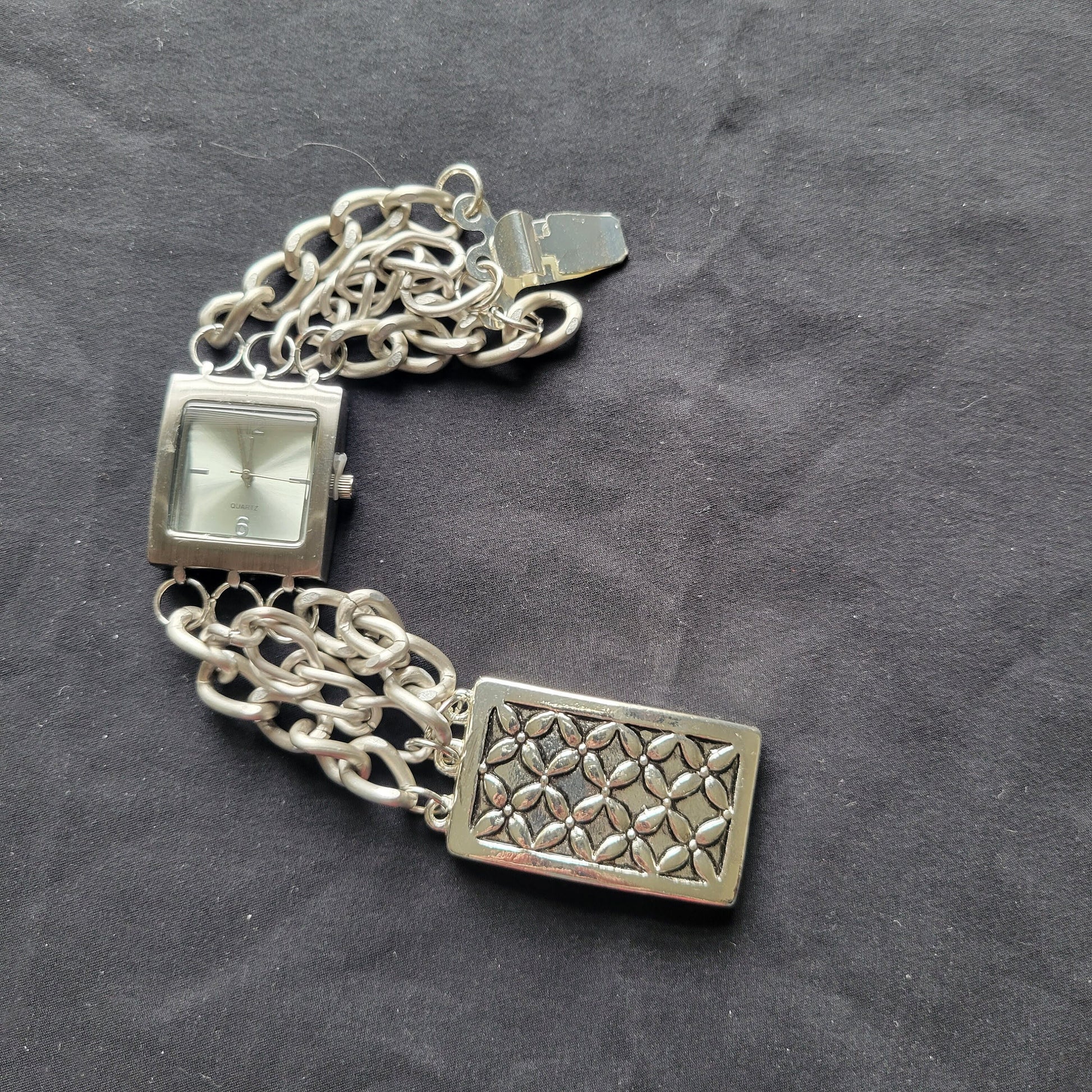 The total length of the watch, band, and clasp is 7 inches. The rectangle slide clasp offers balance to the square face and is decorated with x-shaped flowers.Materials: silver-colored chains, watch face, slide clasp