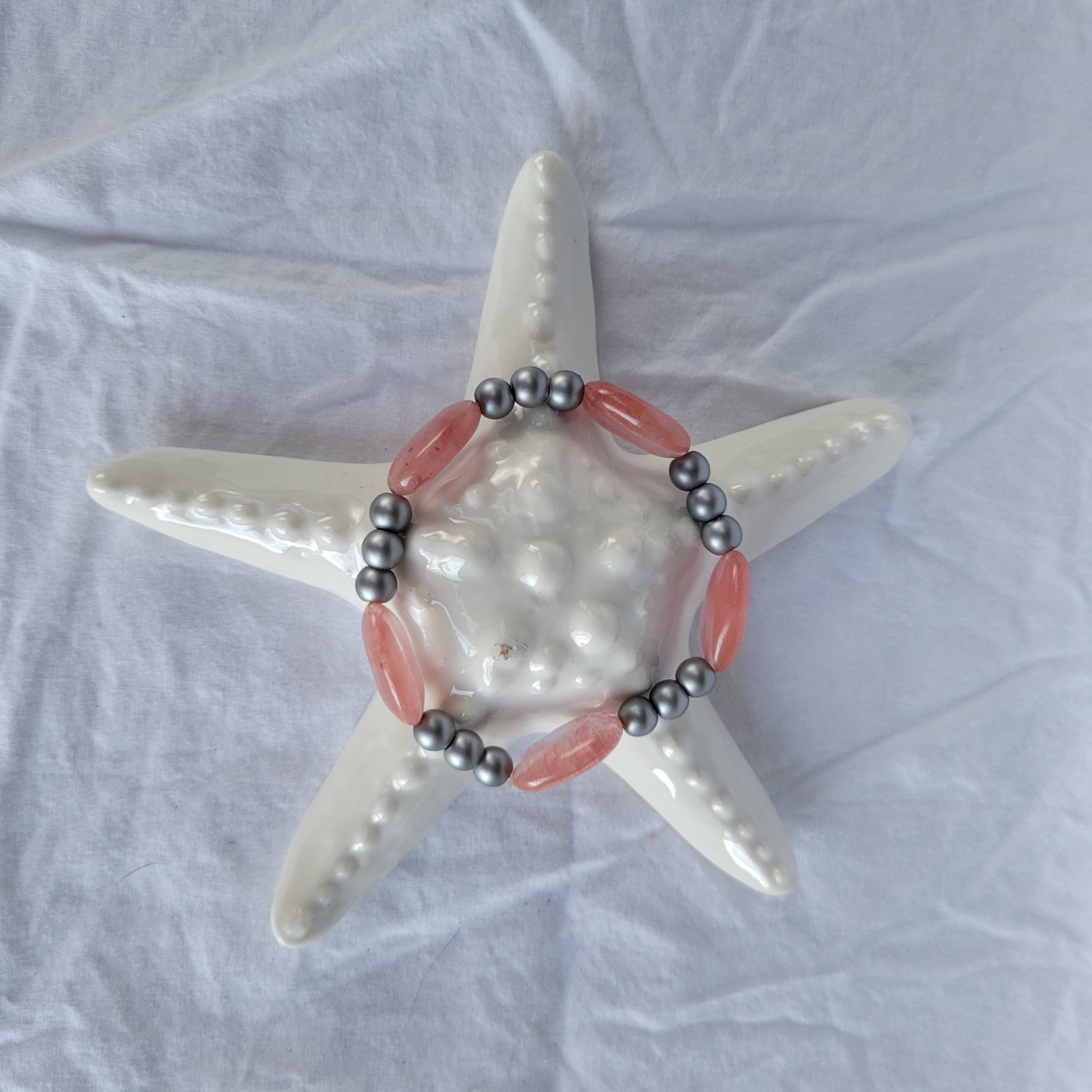 Add the perfect final touch to any outfit with this stunning beaded bracelet. Featuring charcoal round and pink oval glass beads on elastic, this eye-catching bracelet is sure to elevate your look!