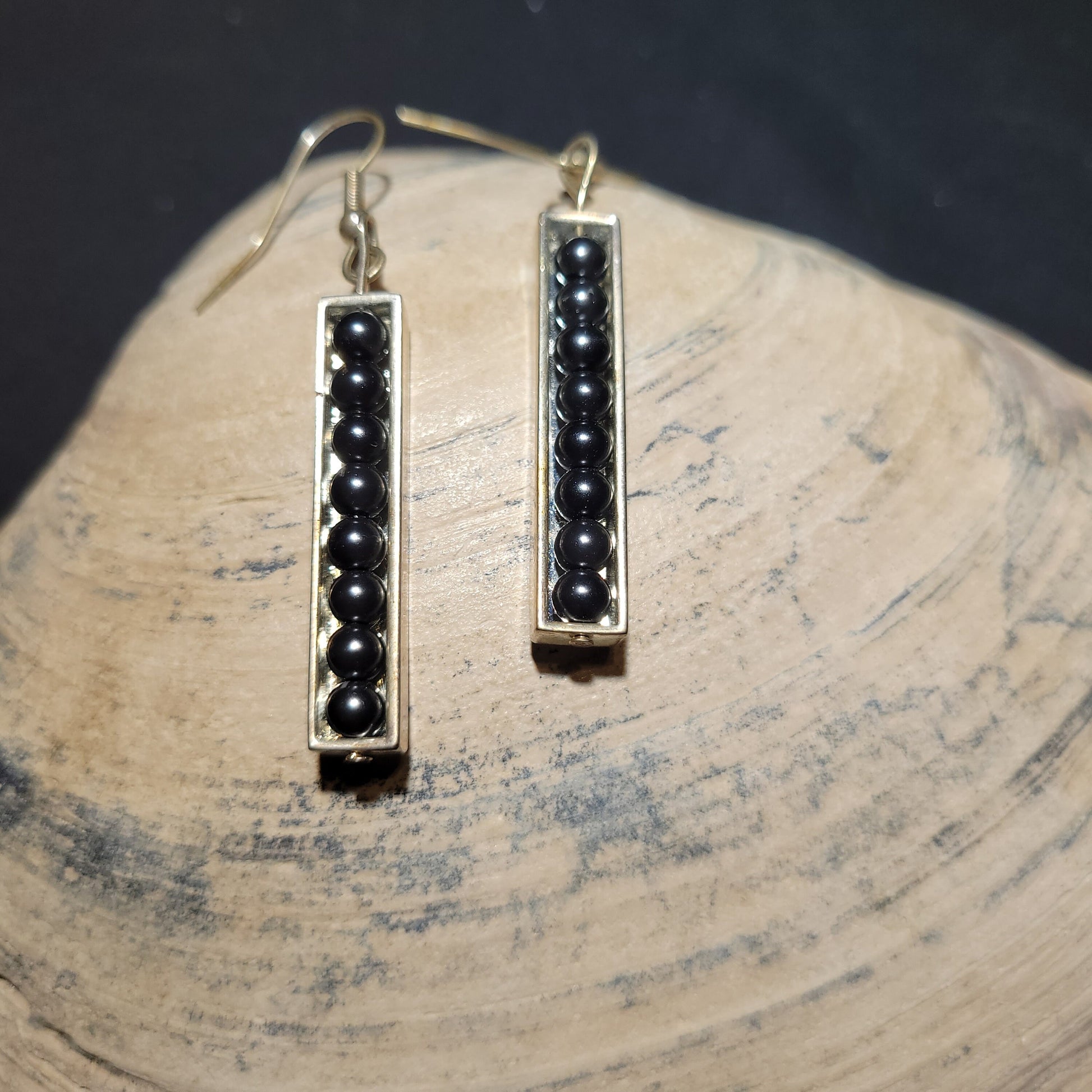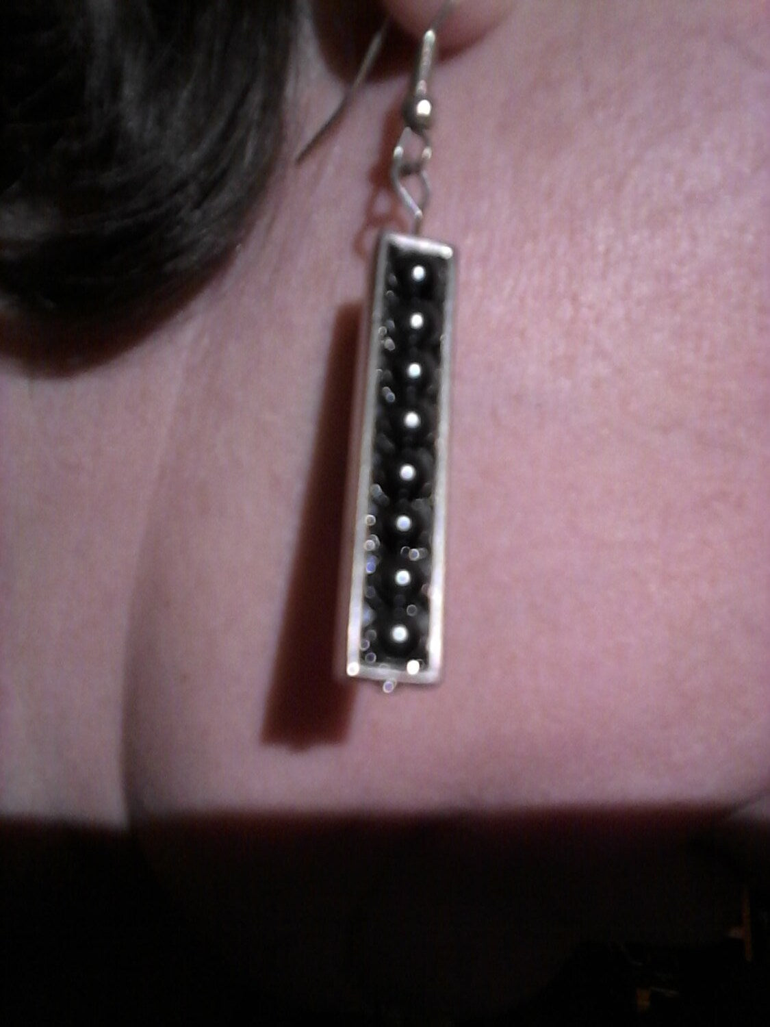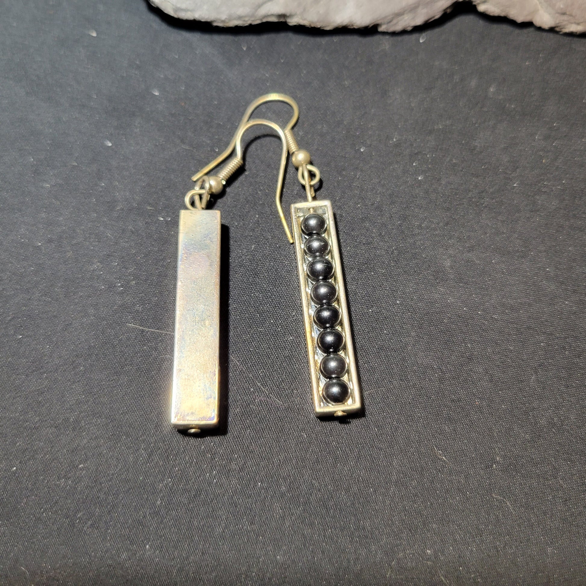 Round charcoal grey beads fitted in hollow silver rectangles attached to a hook earring. There is a slight weight to these earrings but they are definitely one of a kind. Good for the office, a date night, a rock concert, or whatever you fancy.Materials: hook earrings, charcoal beads, silver rectangle, wire