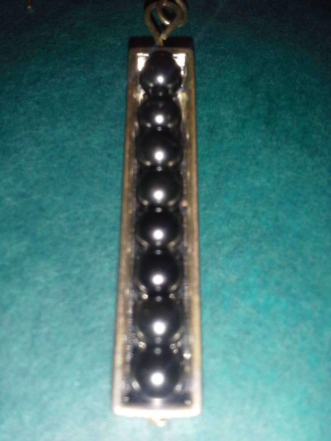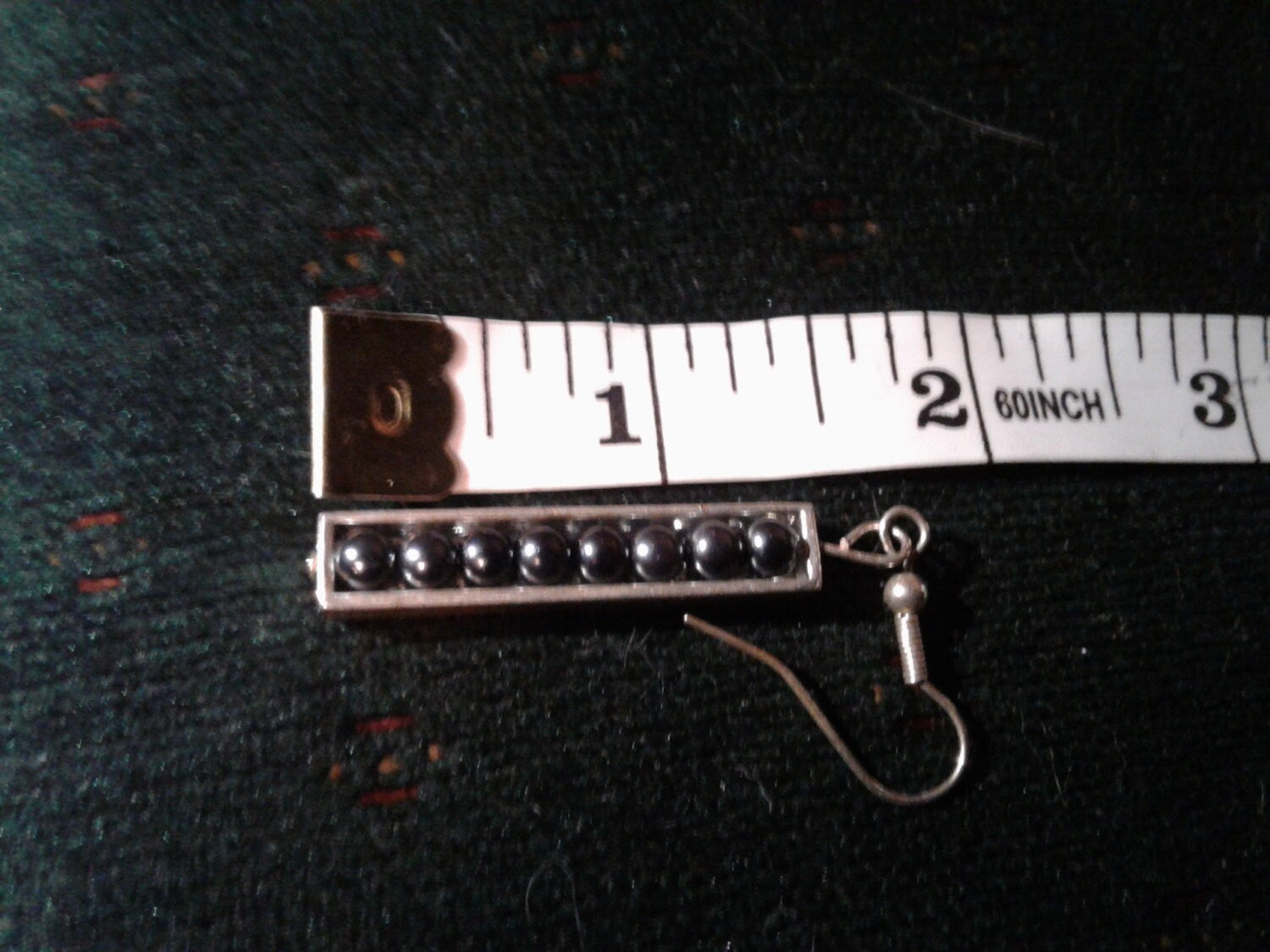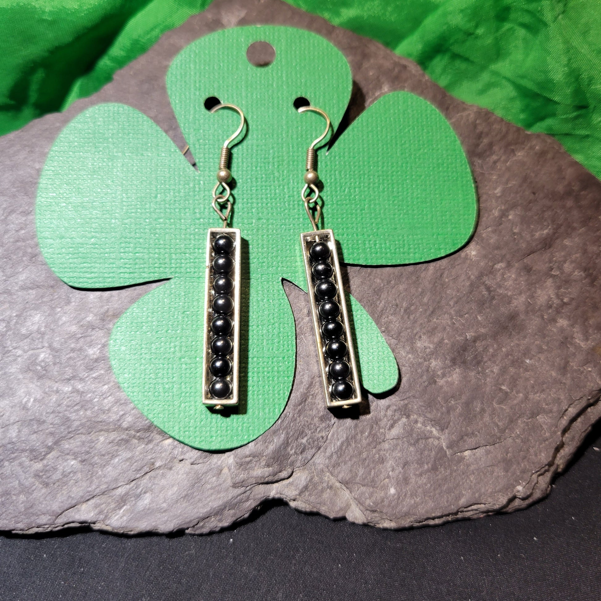 Round charcoal grey beads fitted in hollow silver rectangles attached to a hook earring. There is a slight weight to these earrings but they are definitely one of a kind. Good for the office, a date night, a rock concert, or whatever you fancy.Materials: hook earrings, charcoal beads, silver rectangle, wire