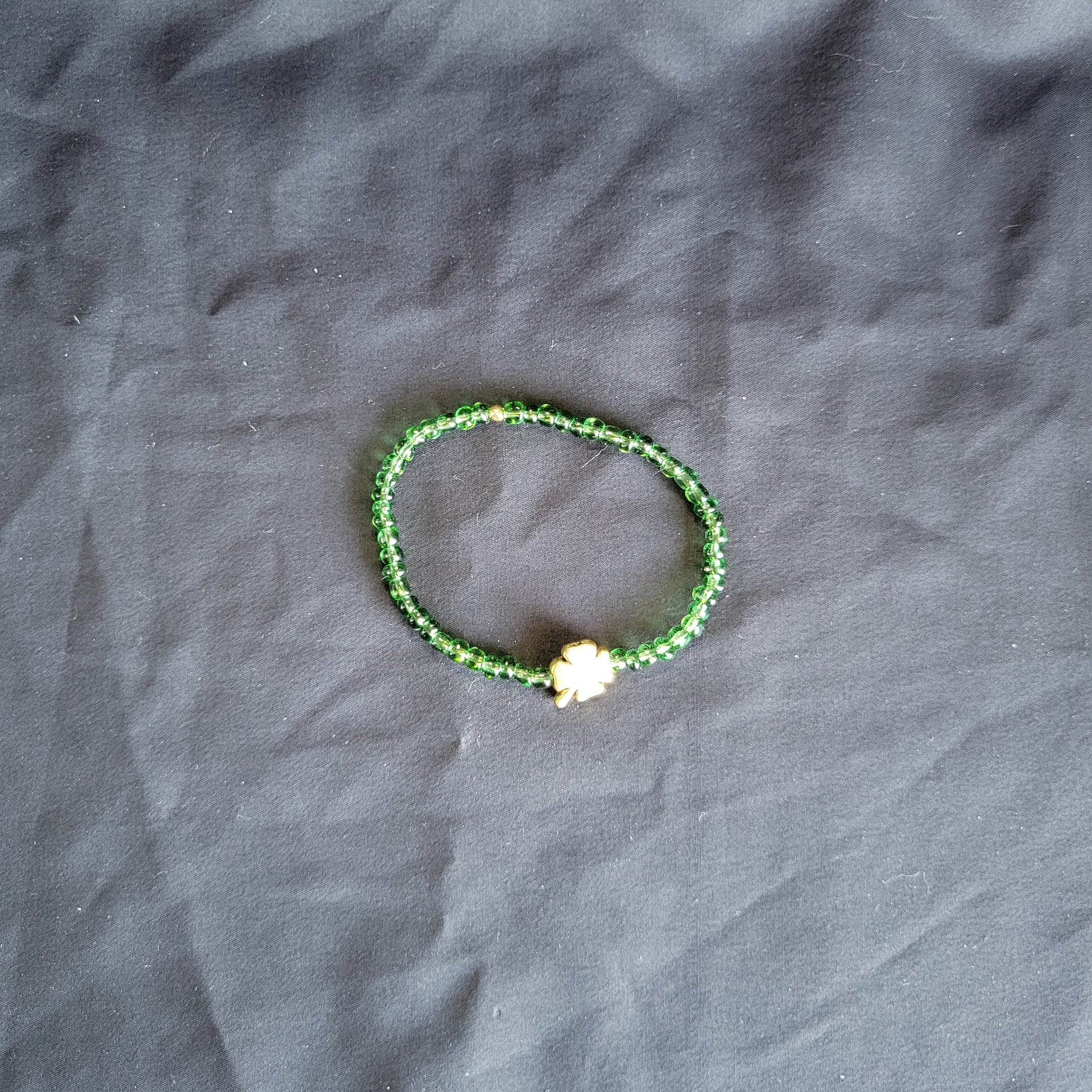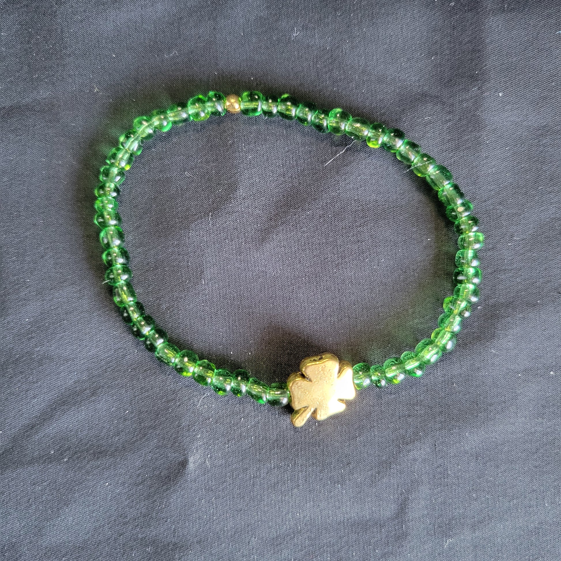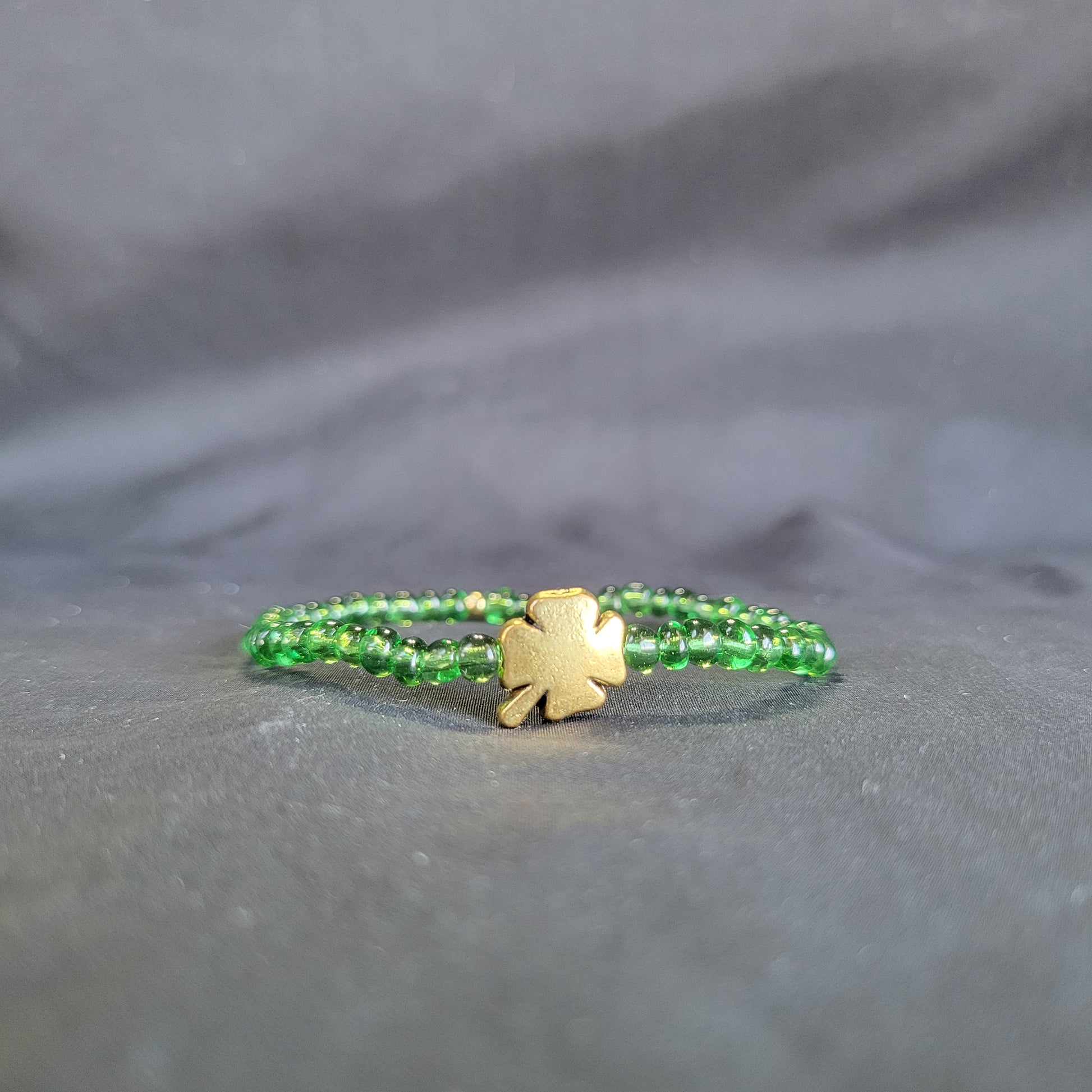 Add a touch of luck to your style with our Clover Green Beaded Bracelet. Elasticized with green beads and a gold four-leaf clover charm, this playful accessory is sure to bring good fortune (and compliments) your way.