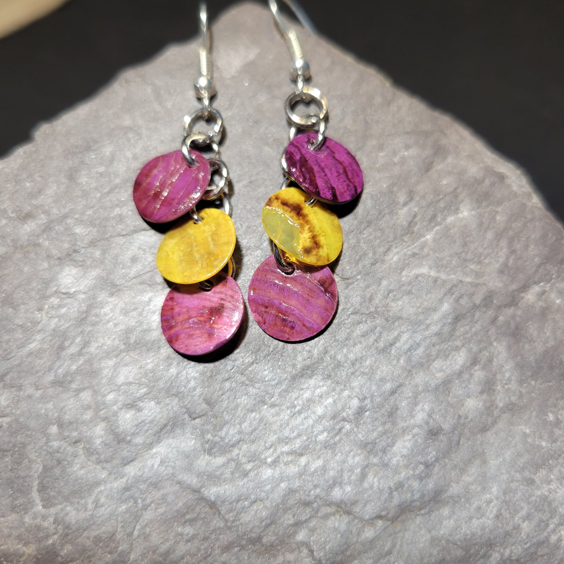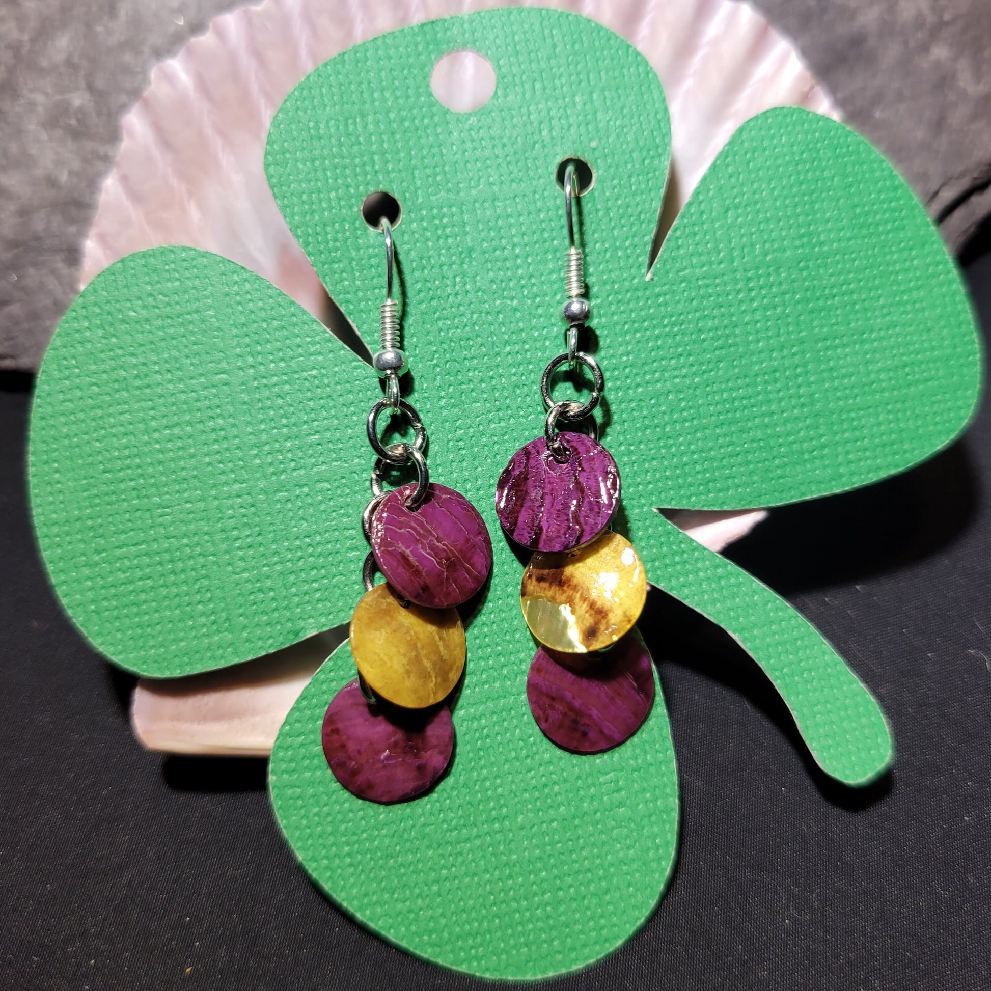 Take a few pieces of the beach with you everywhere every day with these dyed shell disc earrings. The colors are vibrant and beautiful in these simple dangle earrings. The shell discs are delicate and make these earrings lightweight.