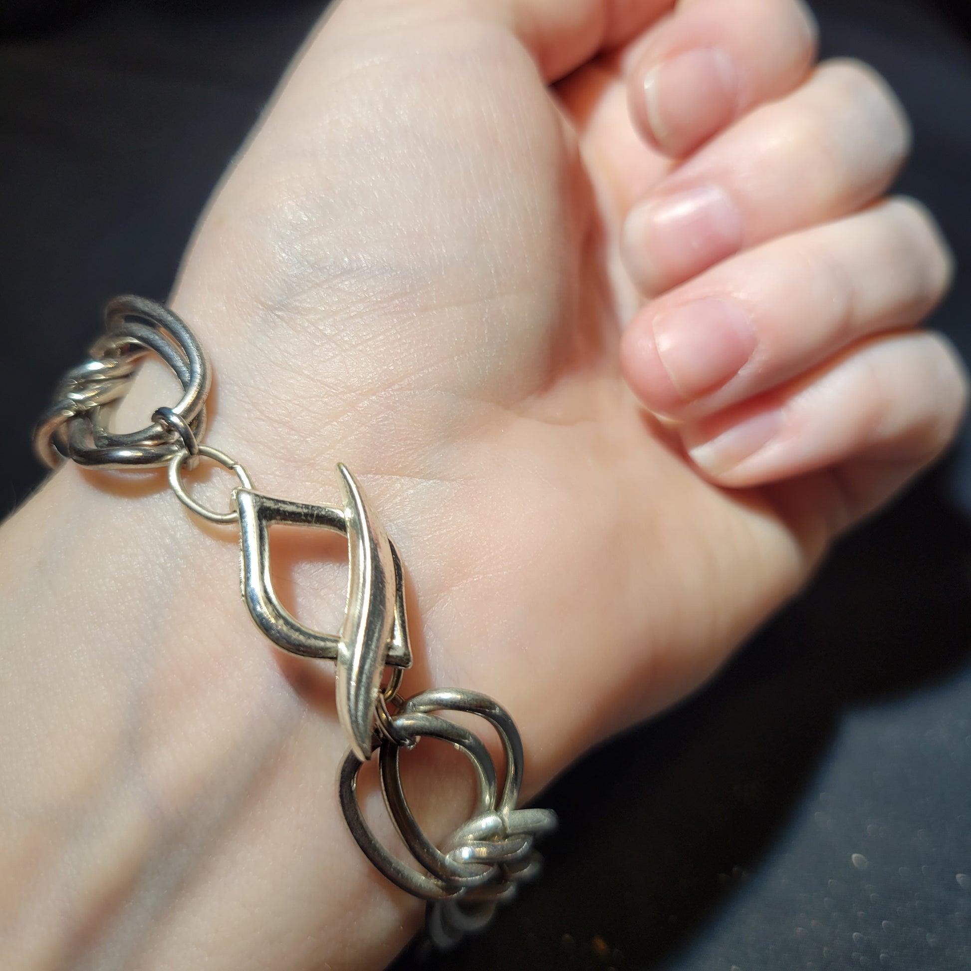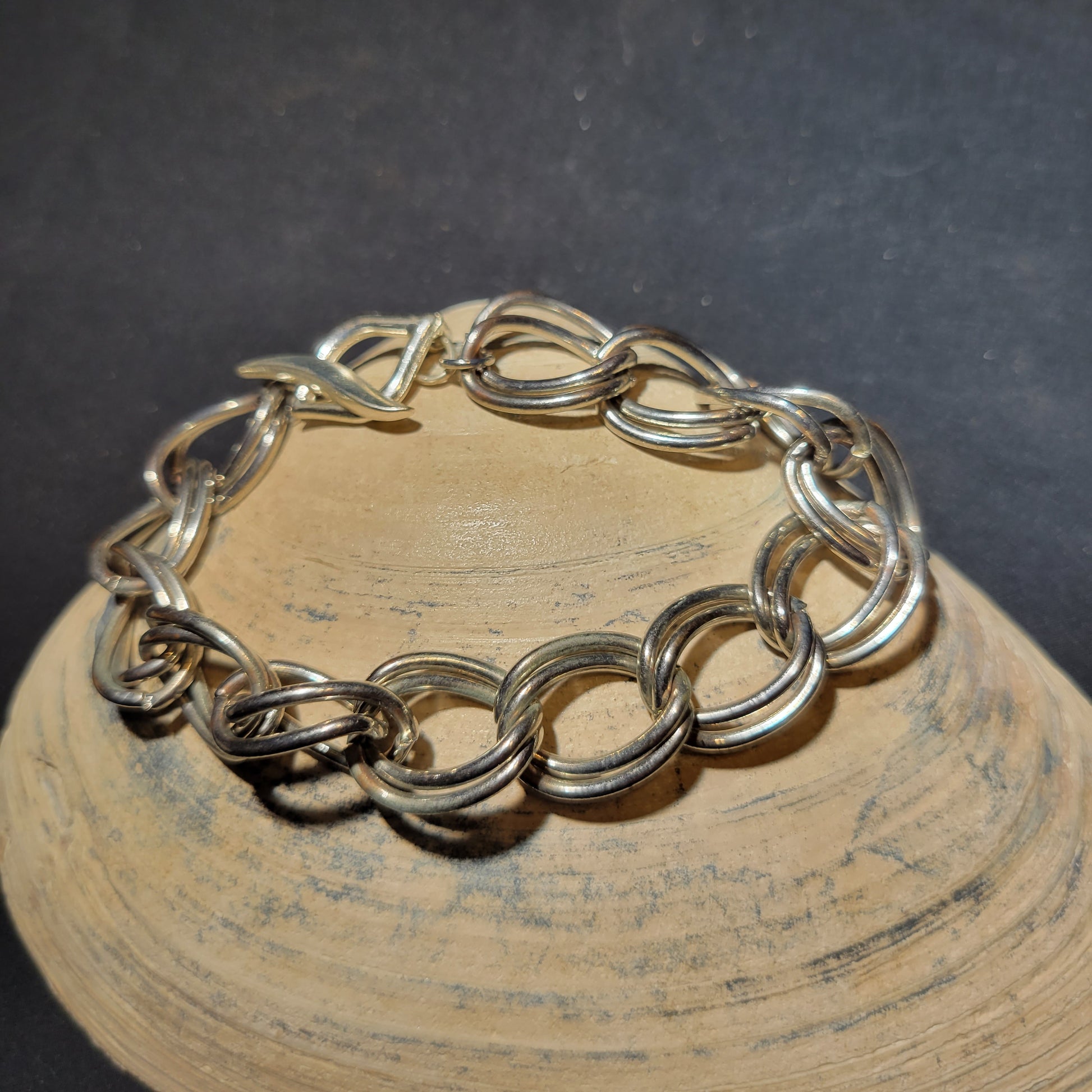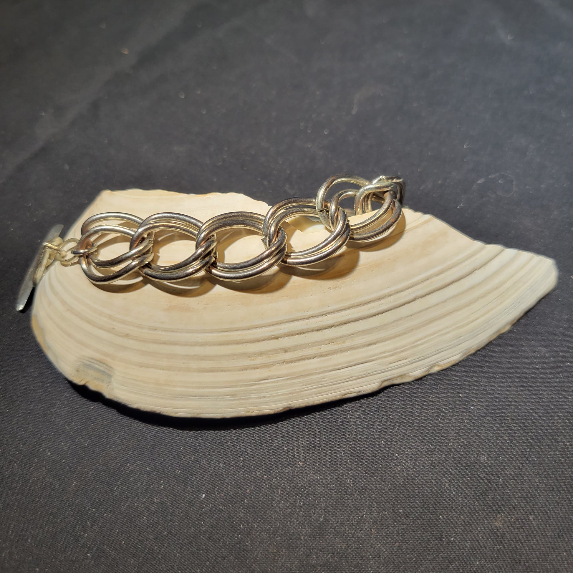 This silver double chain link bracelet is 8 inches in length and is finished with an elliptical toggle clasp.