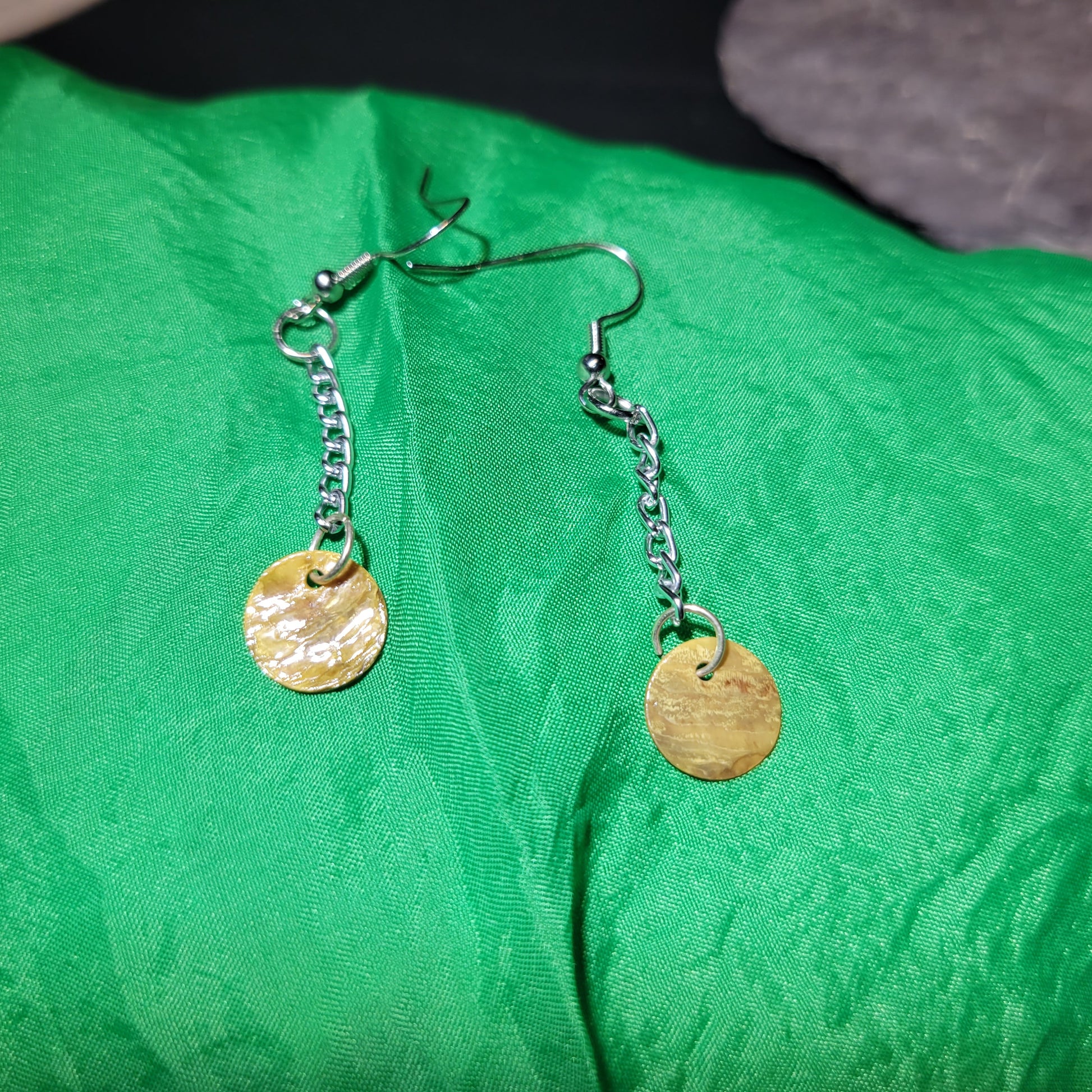 Imagine the setting sun when you wear these round shell disc earrings. Feel the peace of sitting on the beach at sun rise or sunset. These earrings have round yellow shell discs hanging from silver chains attached to ear wire hooks.
