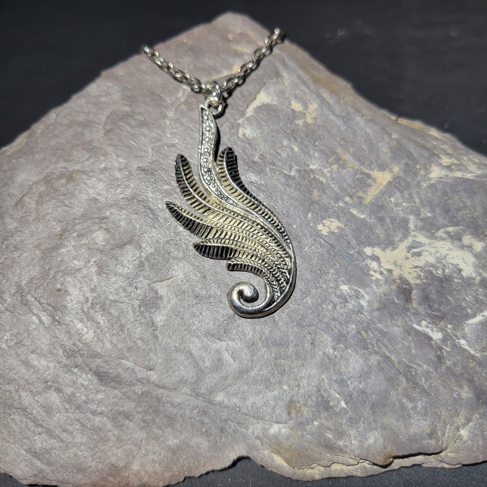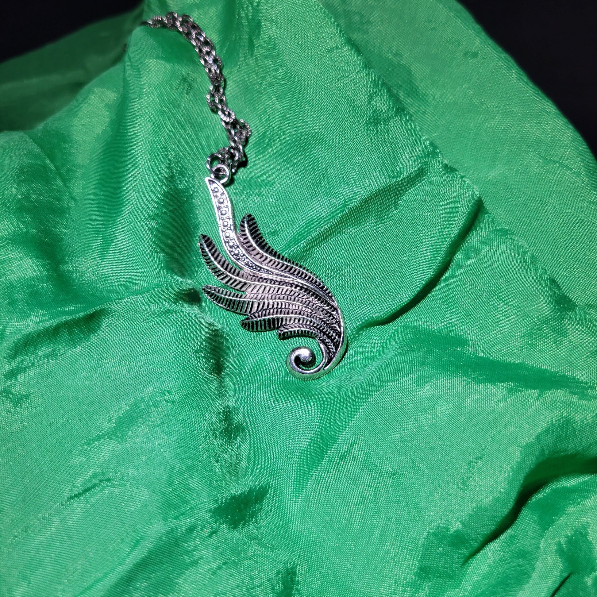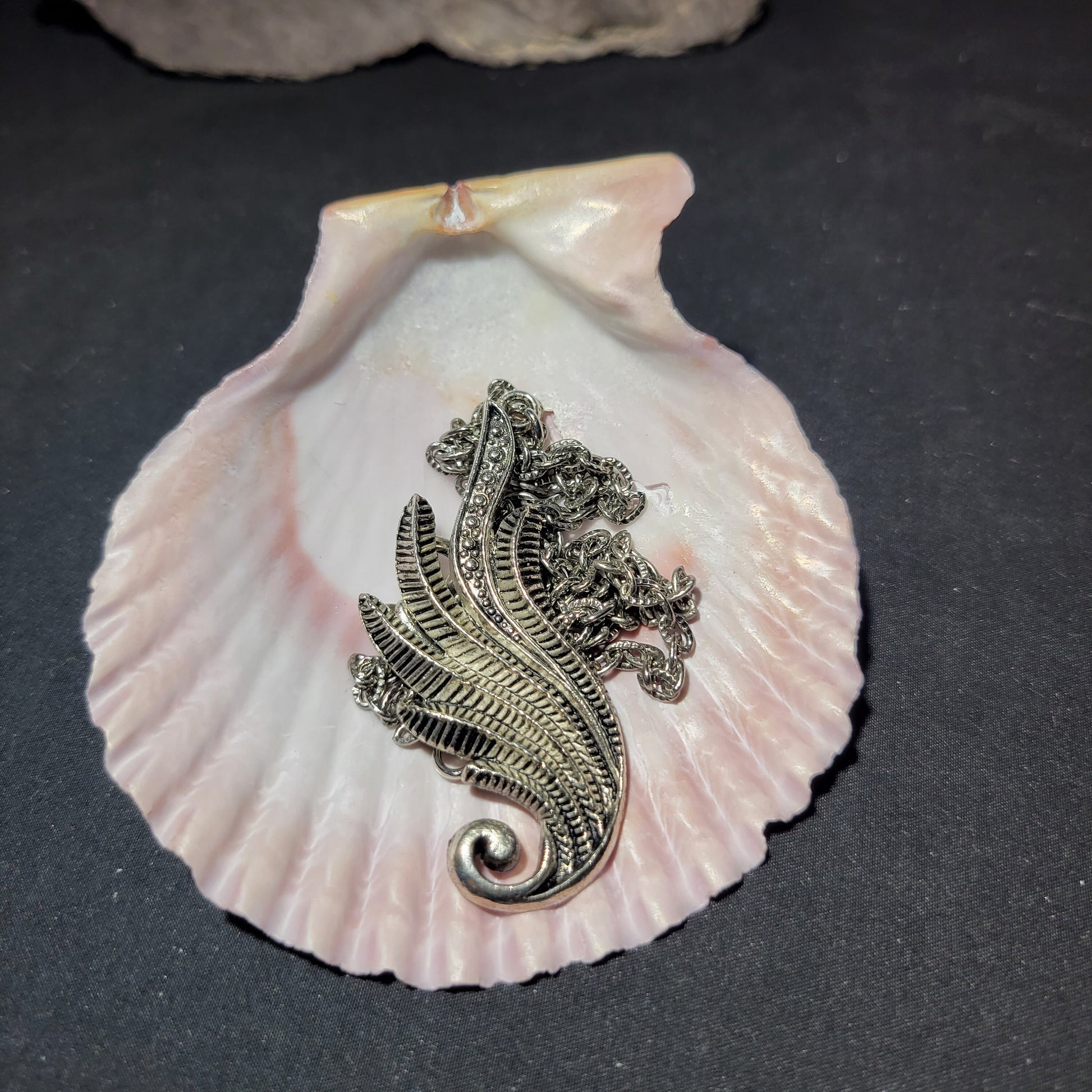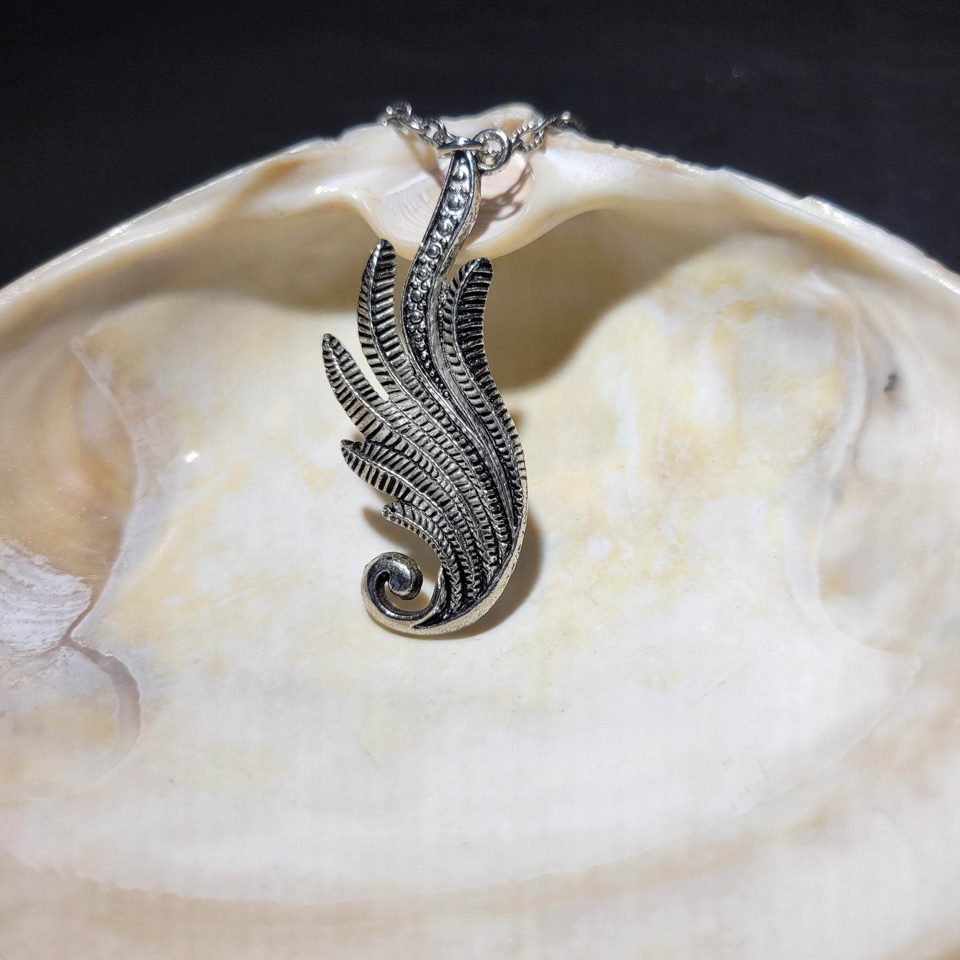 Wear this feather opera necklace as your next statement piece of jewelry. The chain is 20 inches long with a 2-inch high pendant that looks like a feather, swirl, or whatever you envision.Materials: cable chain, feather pendant, swirl pendant, hook and eye clasp