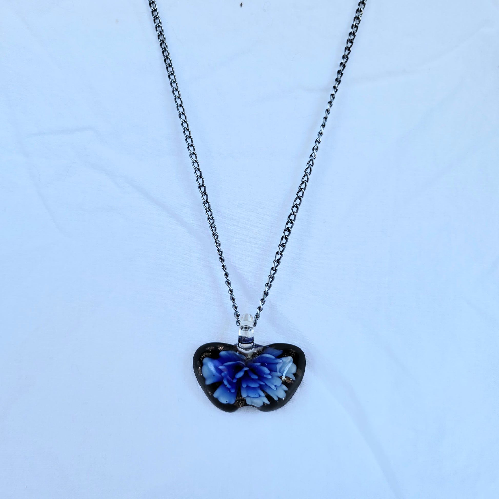Adorn your look with this exquisitely crafted Flower Butterfly Necklace. Its beautiful blue flower in dark blown glass and 21" gunmetal chain with lobster clasp will add a touch of elegance to any outfit. Make a statement today!