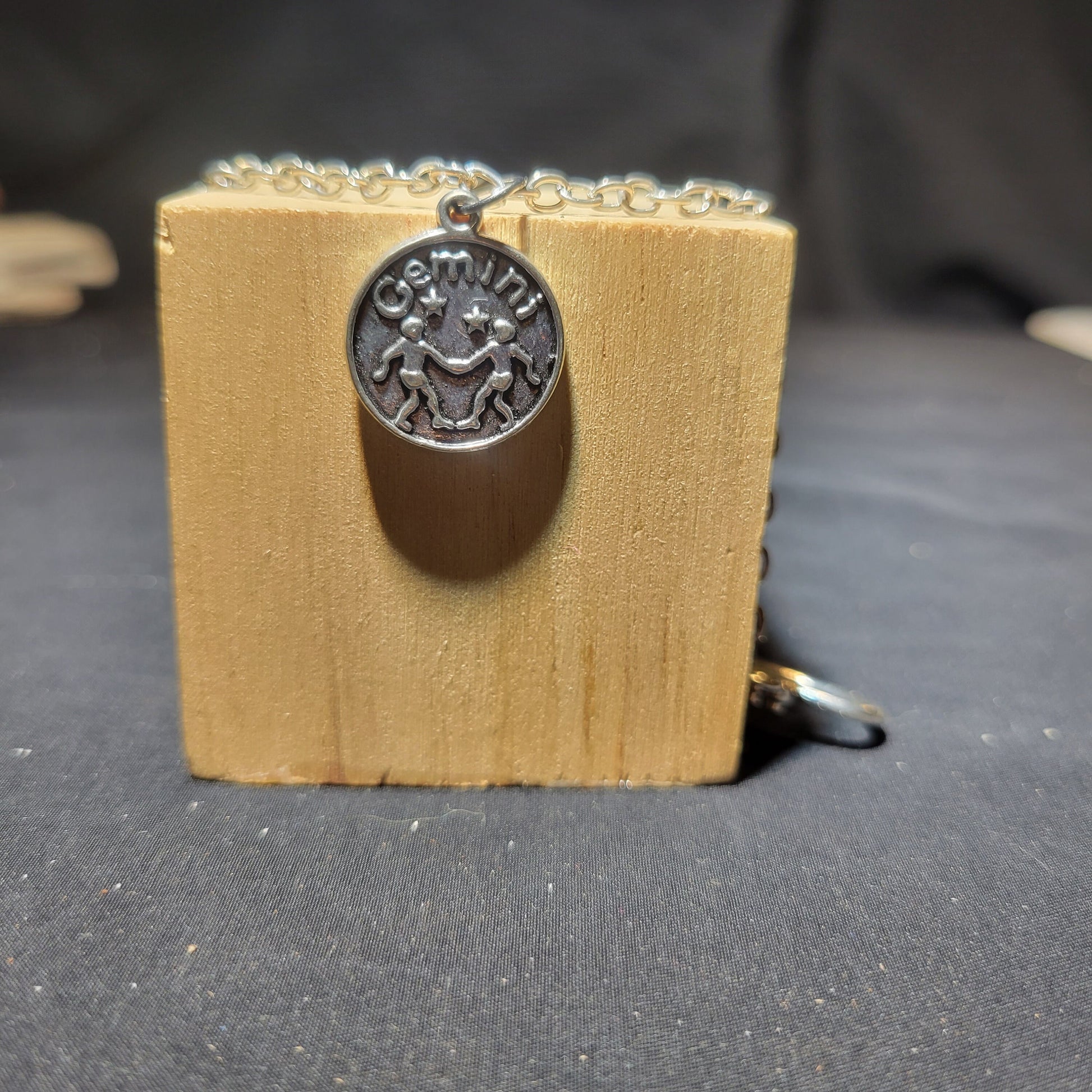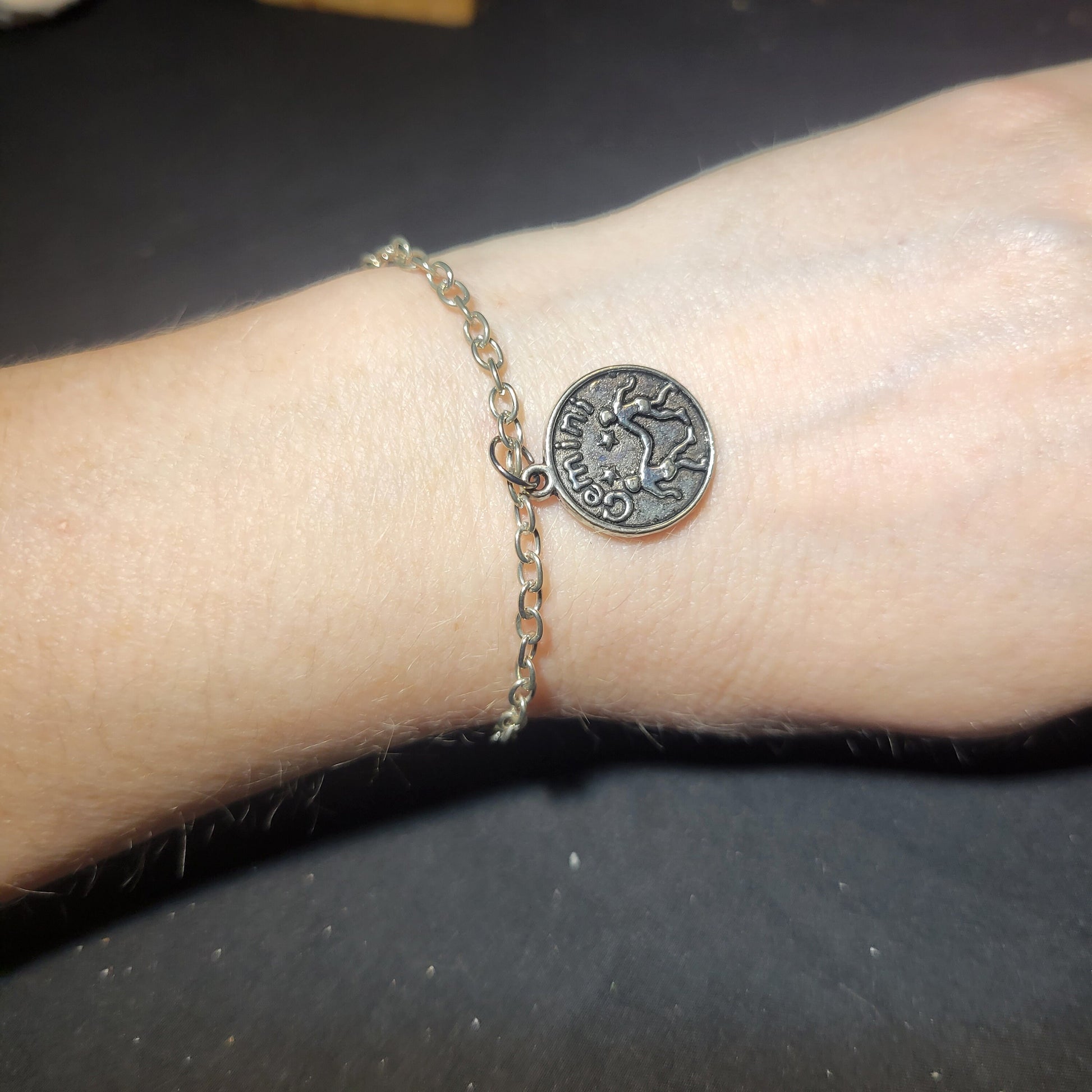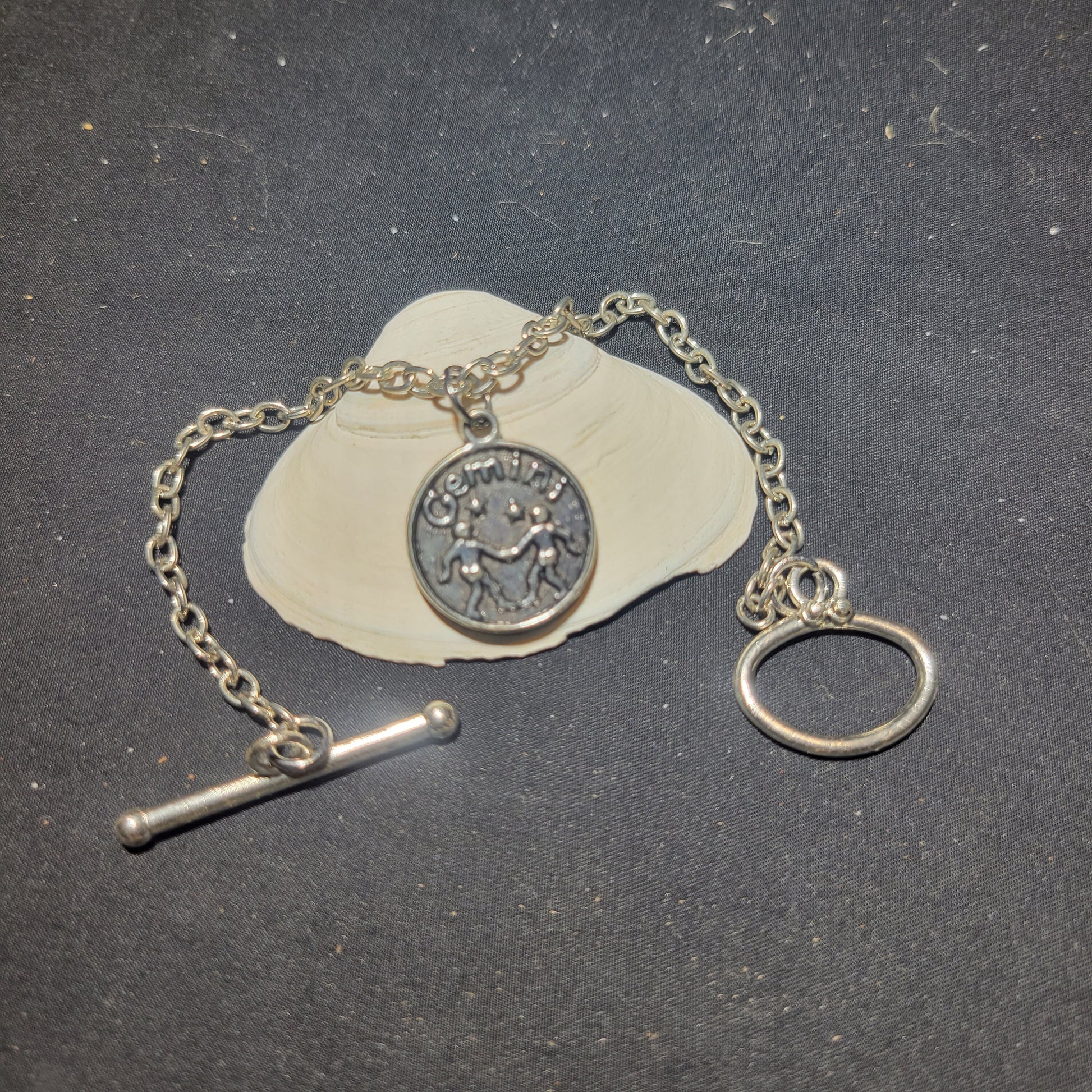 Know a Gemini? Get them this Gemini charm bracelet. One side of the circular charm has the zodiac Gemini symbol, twins, and the other has the rune for Gemini and the word Intelligent. The charm hangs from a round link chain with a toggle clasp closure.