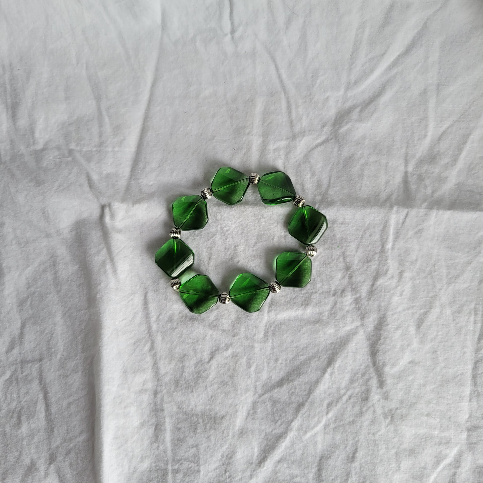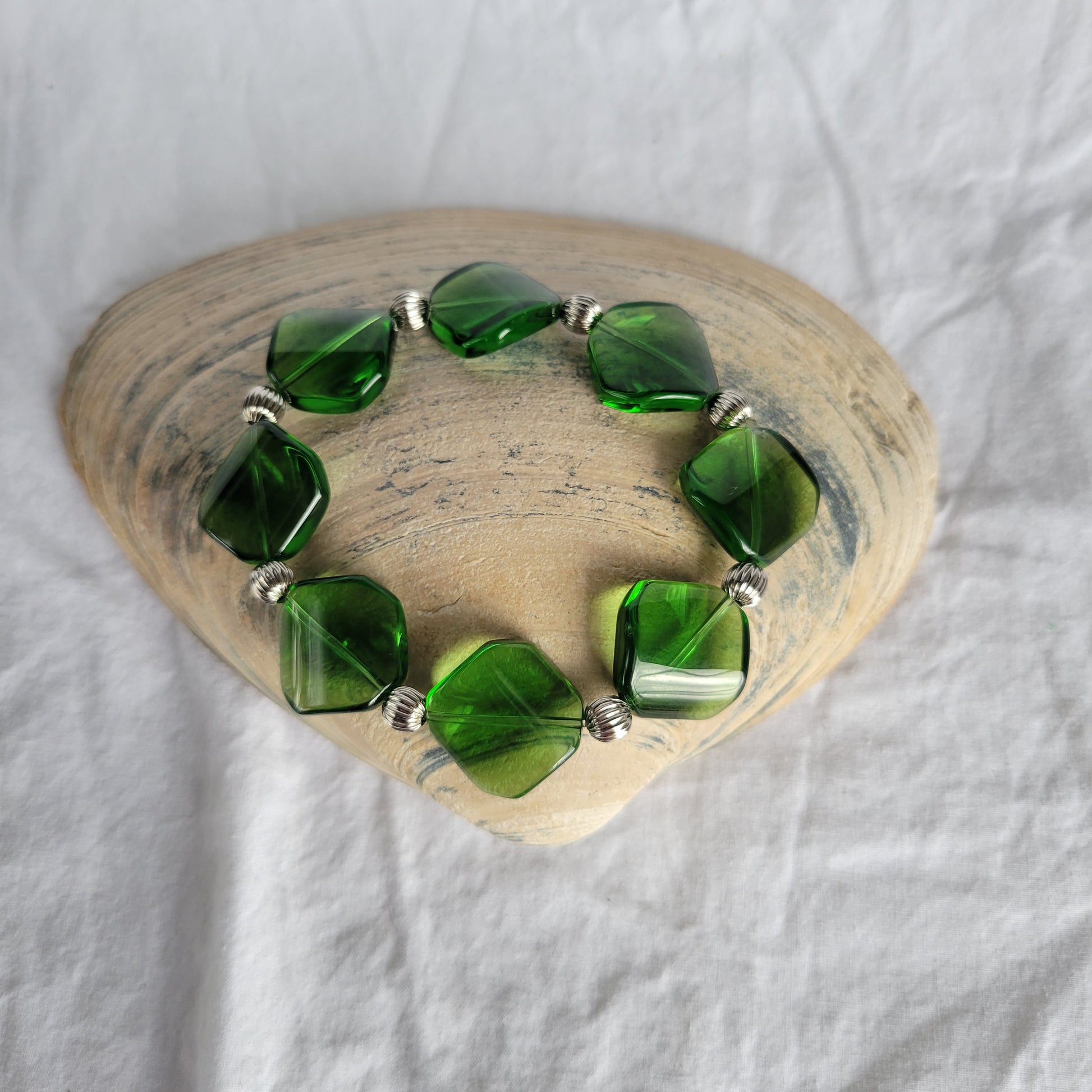 Look stylish and unique with this beautiful Green and Silver Beaded Bracelet! It features wavy green beads, round silver spacers, and a comfortable elastic cord, so you can show off your style with ease and comfort. Get your Green and Silver Beaded Bracelet now and make a fashionable statement for years to come!