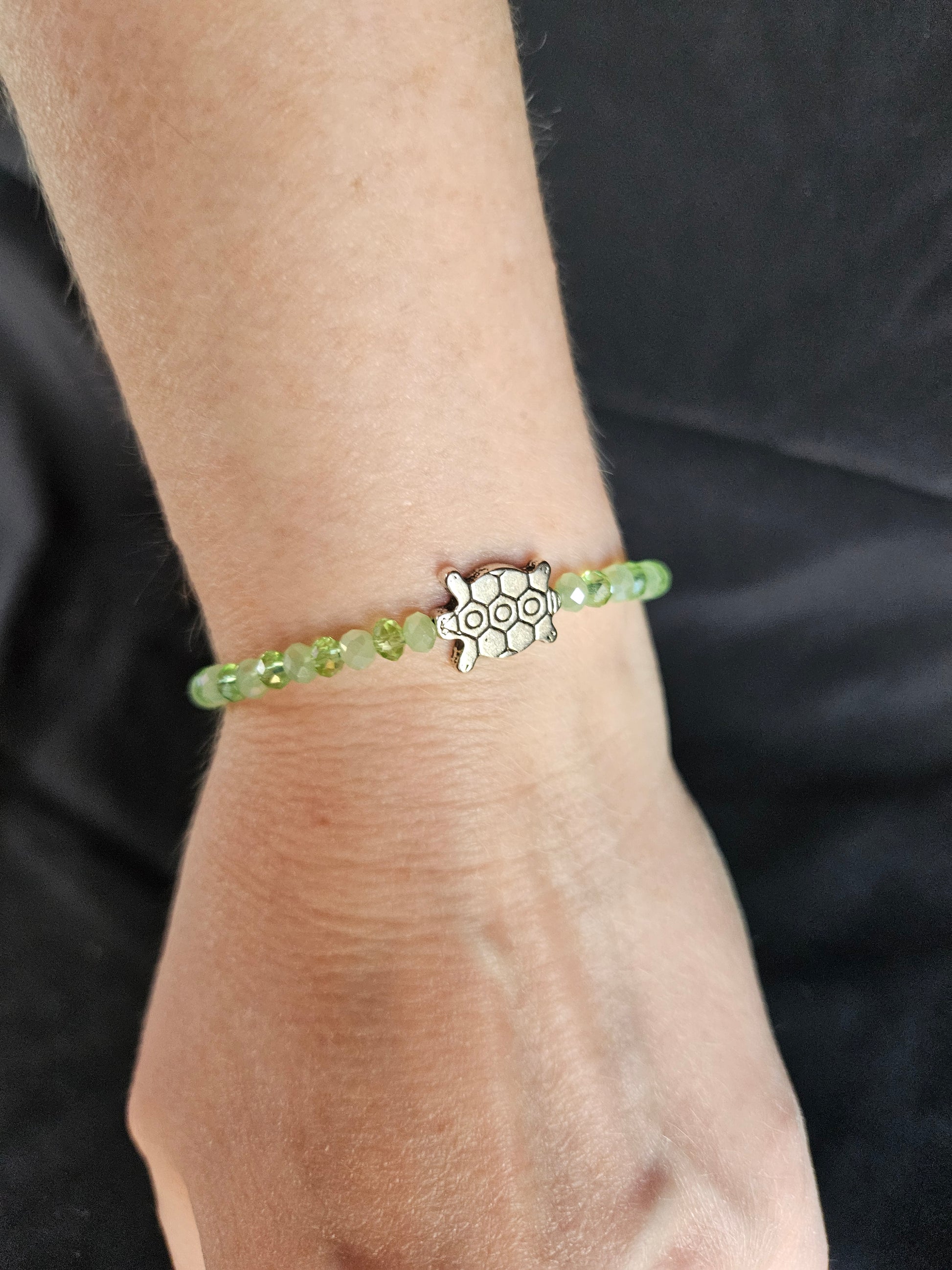This beaded bracelet features two stunning shades of green glass beads and a charming flat turtle charm, all strung together on a stretchy elastic band. The perfect accessory for any nature lover, this bracelet adds a touch of whimsy to any outfit.
