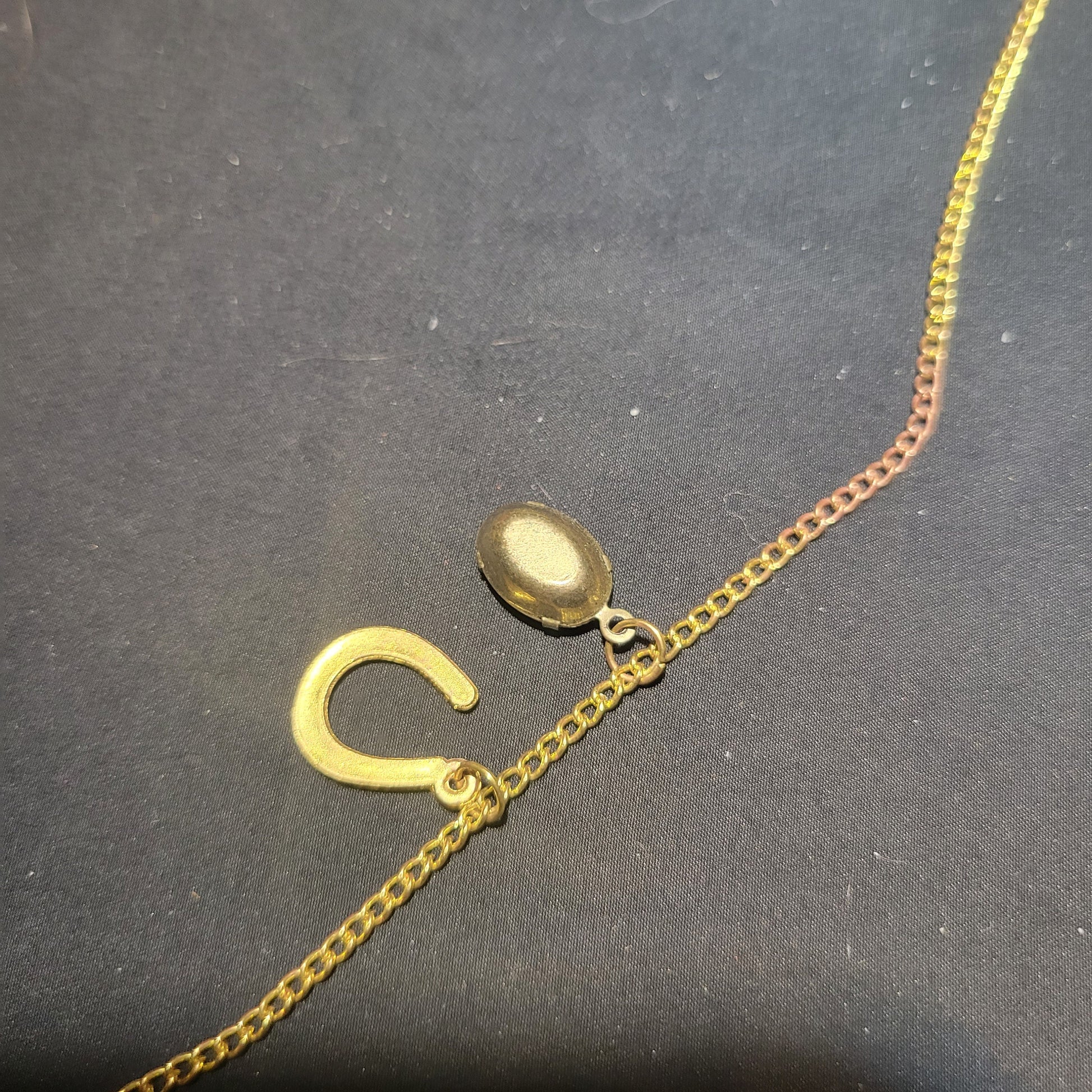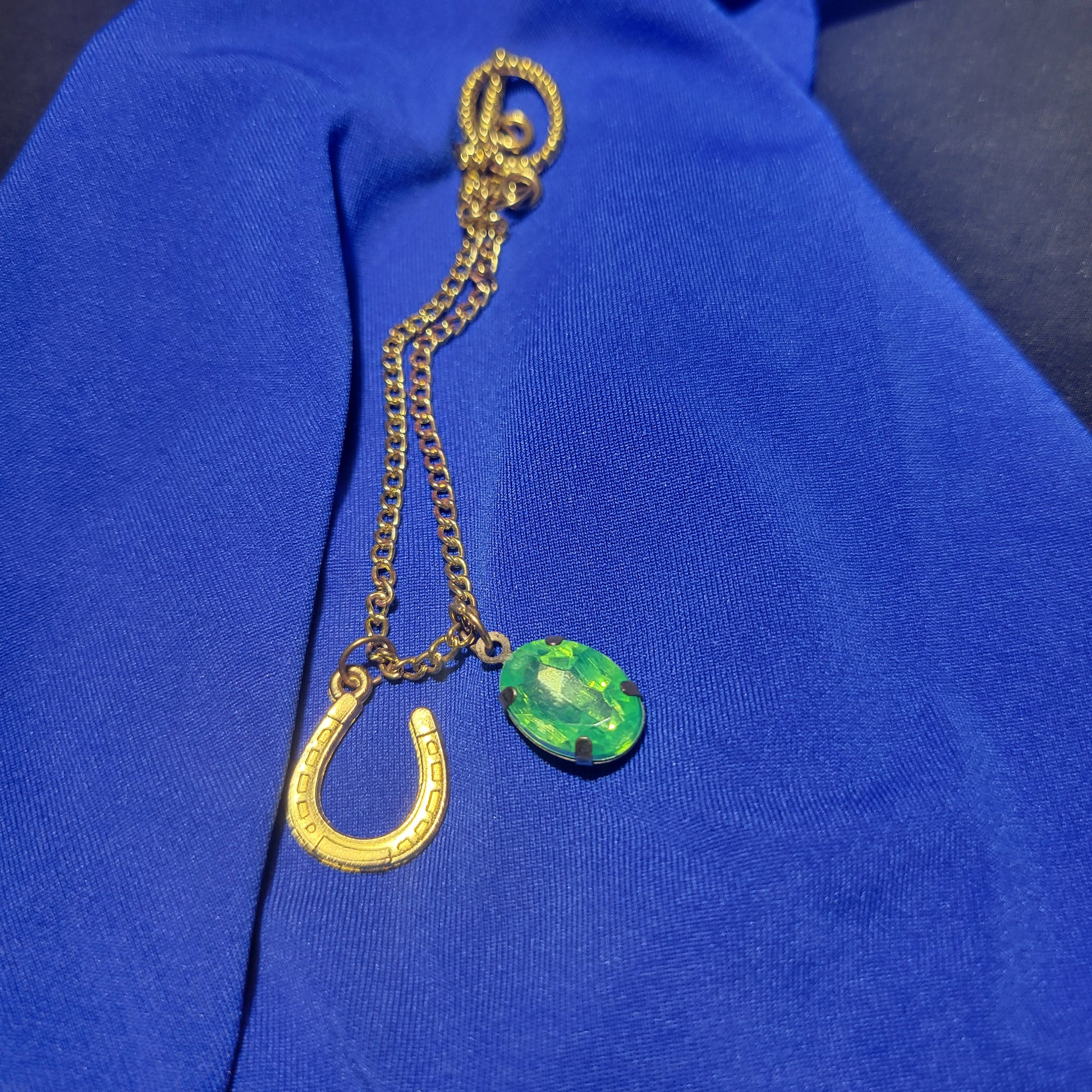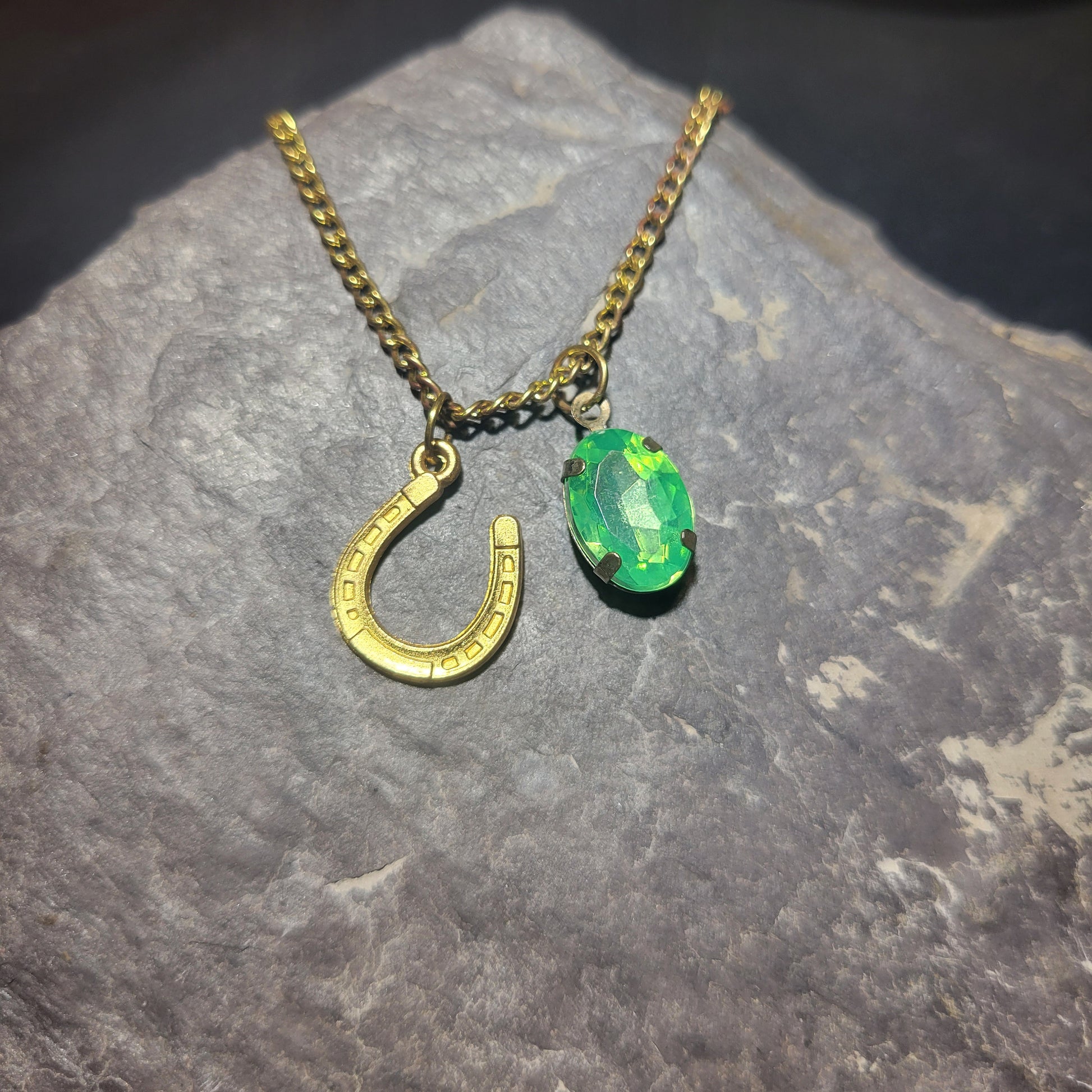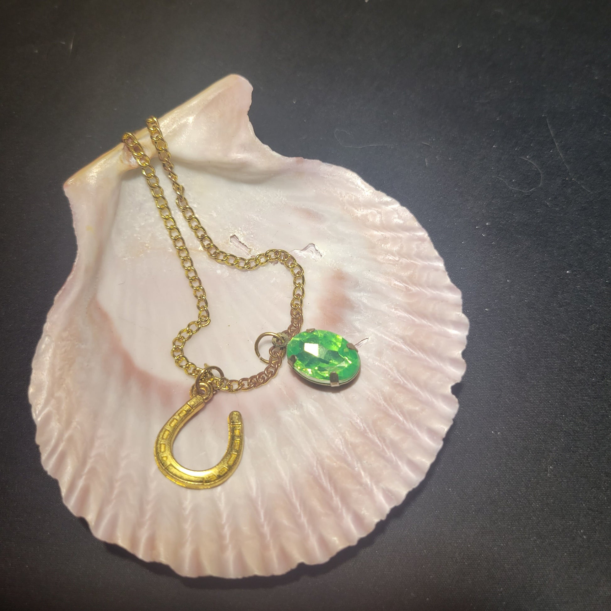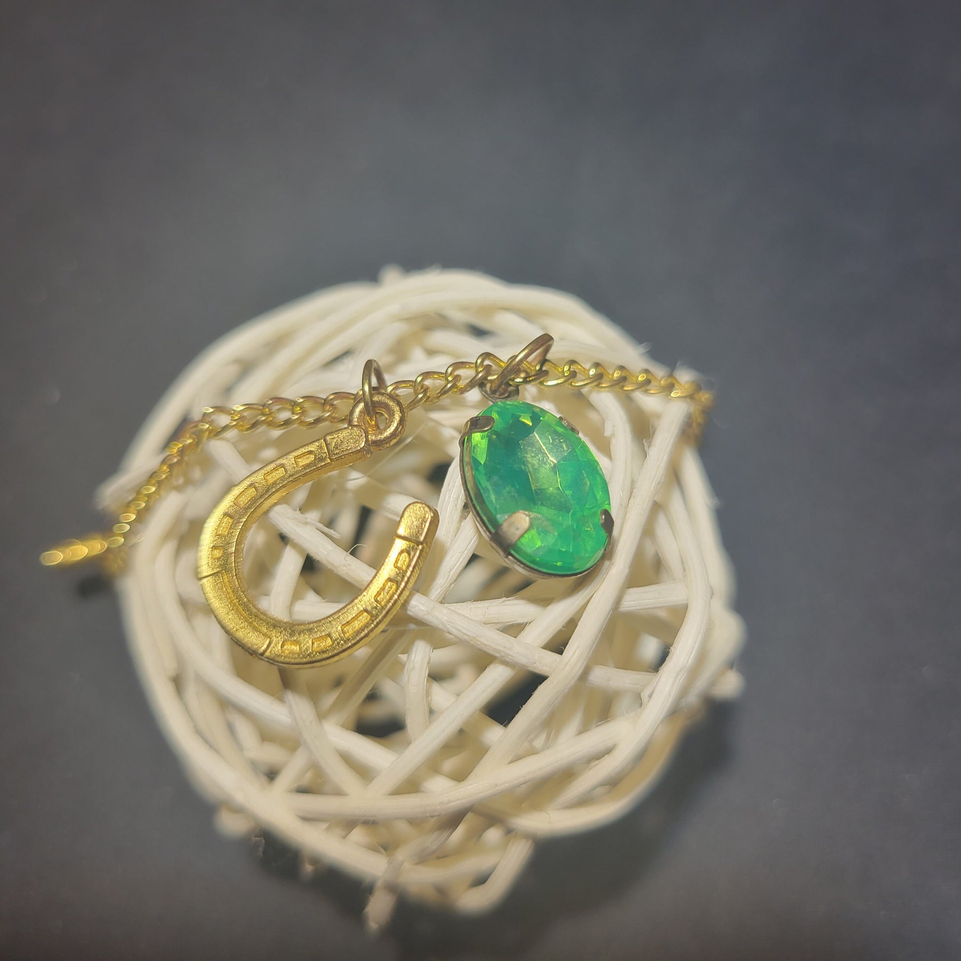 Materials: horseshoe charm, green glass charm, curb chain, toggle clasp