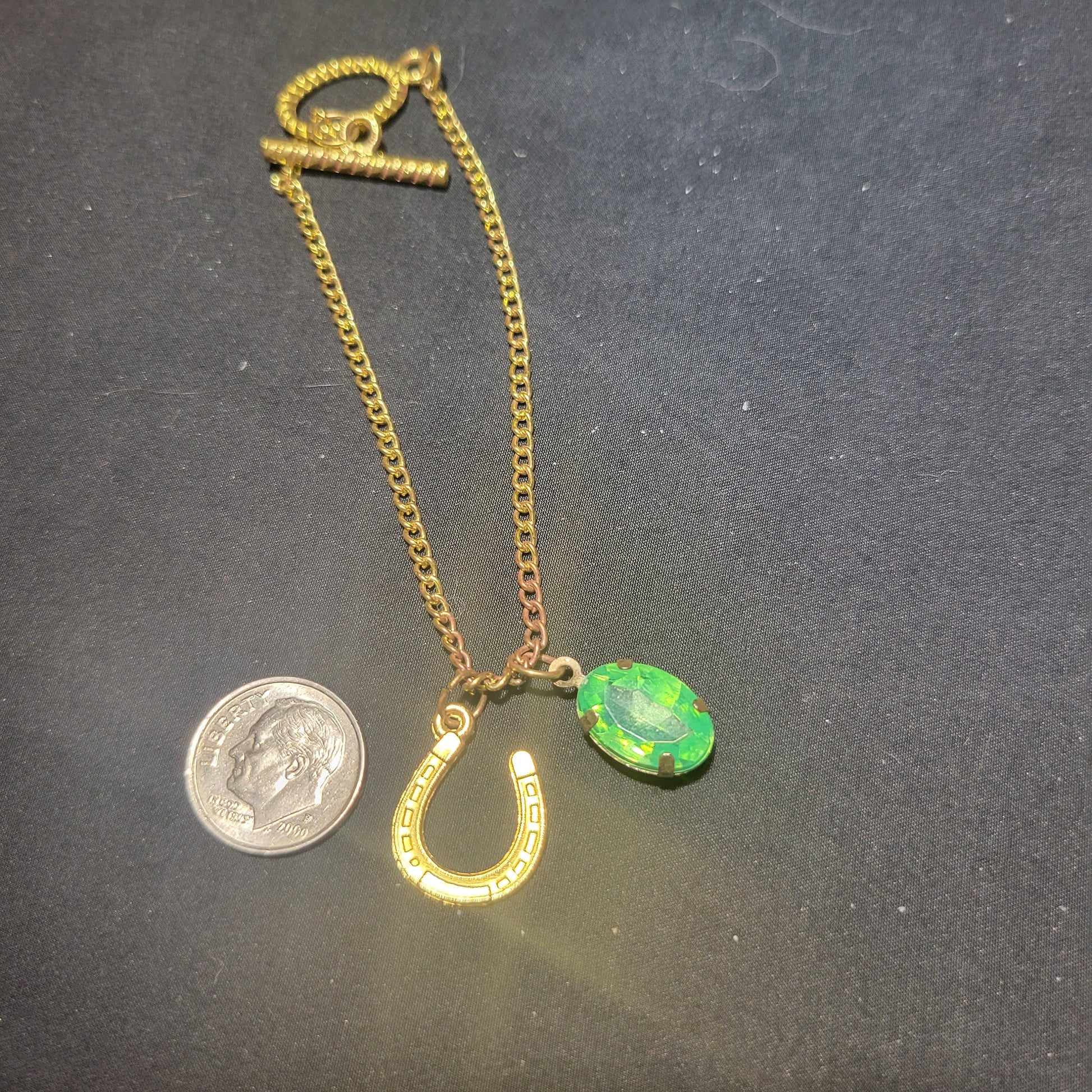 The horseshoe charm on this bracelet is accompanied by a green glass "jewel" and hangs from a gold curb chain with a toggle clasp.