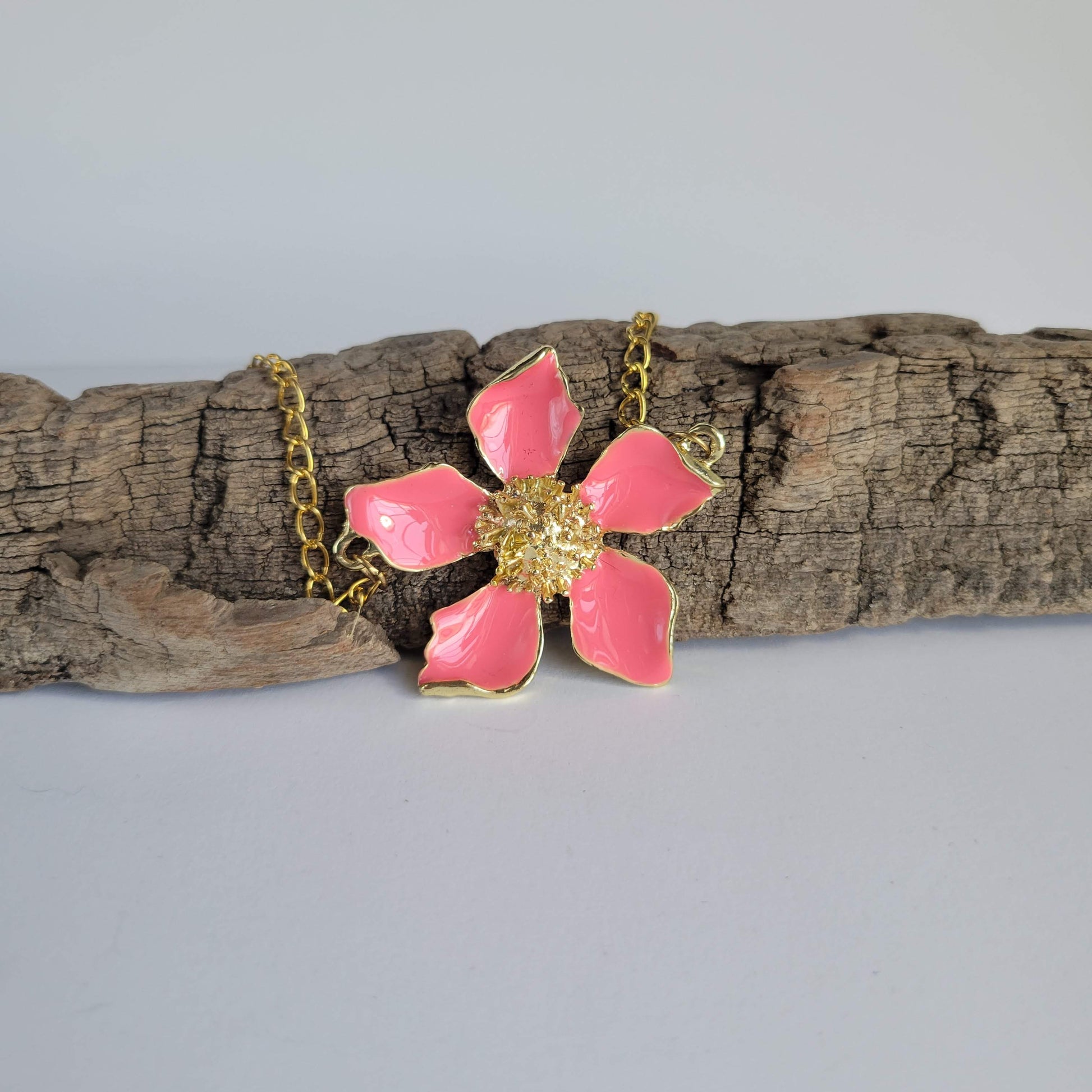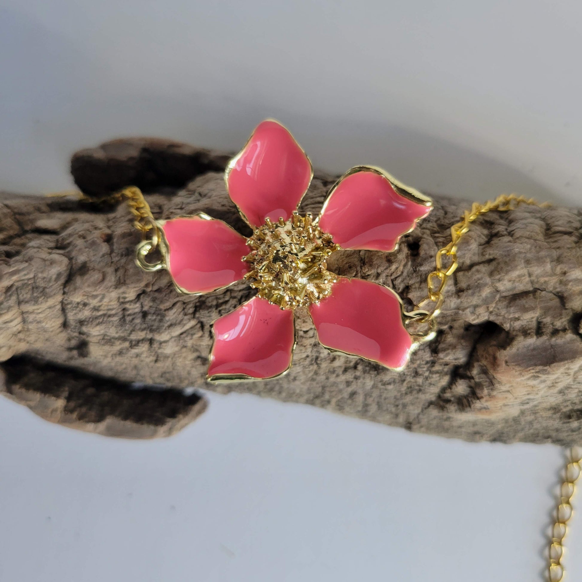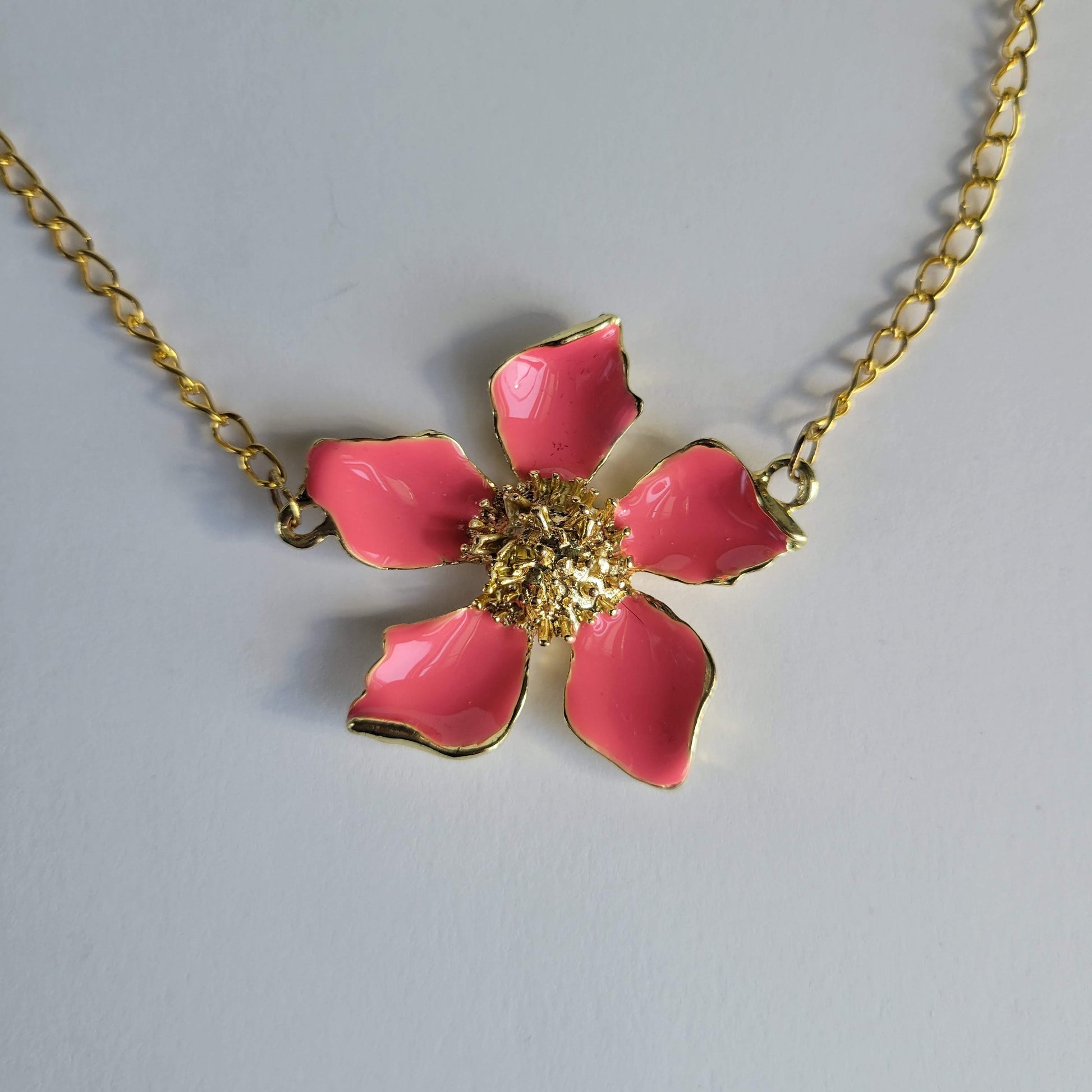 1.5" hot pink flower pendant on a gold chain with hook clasp