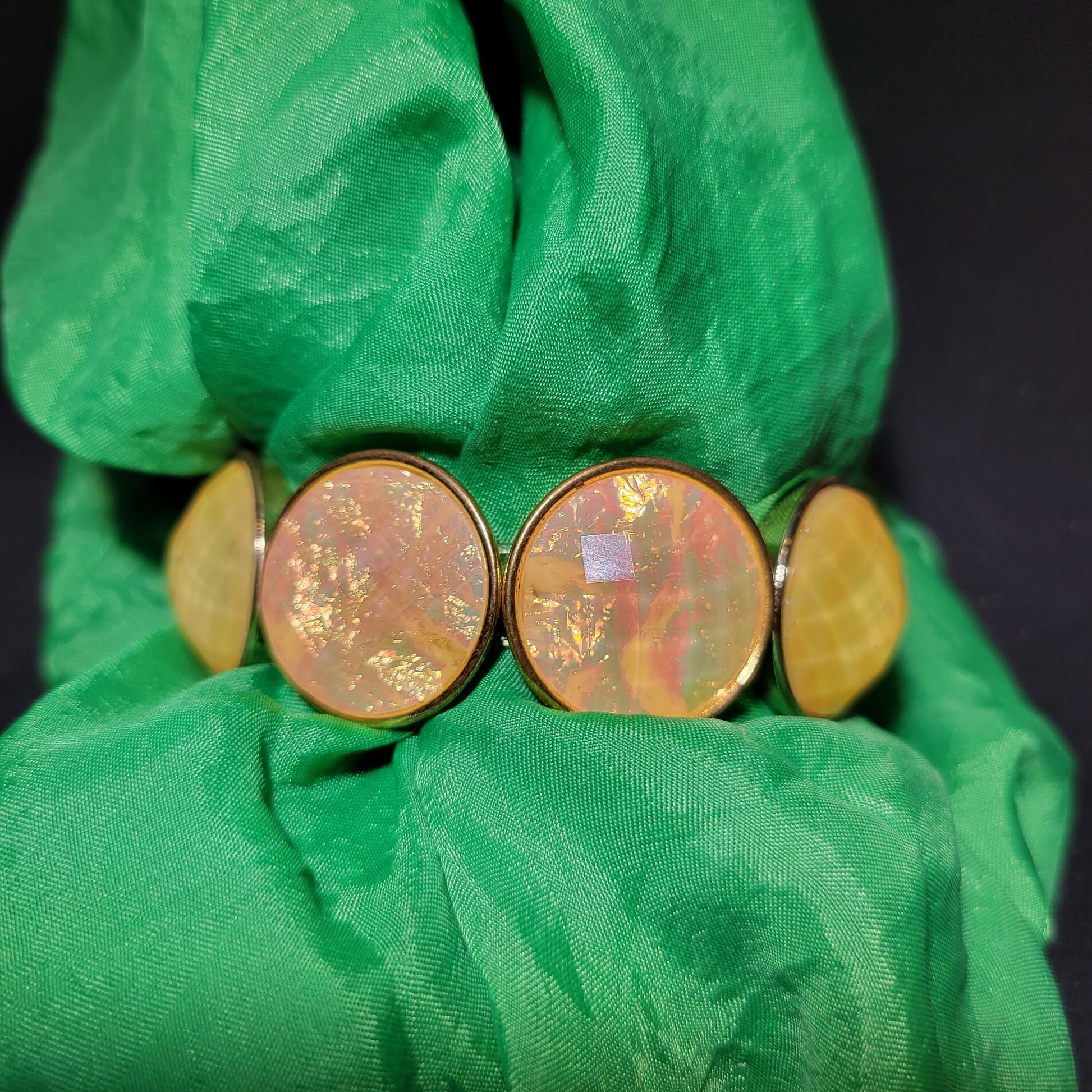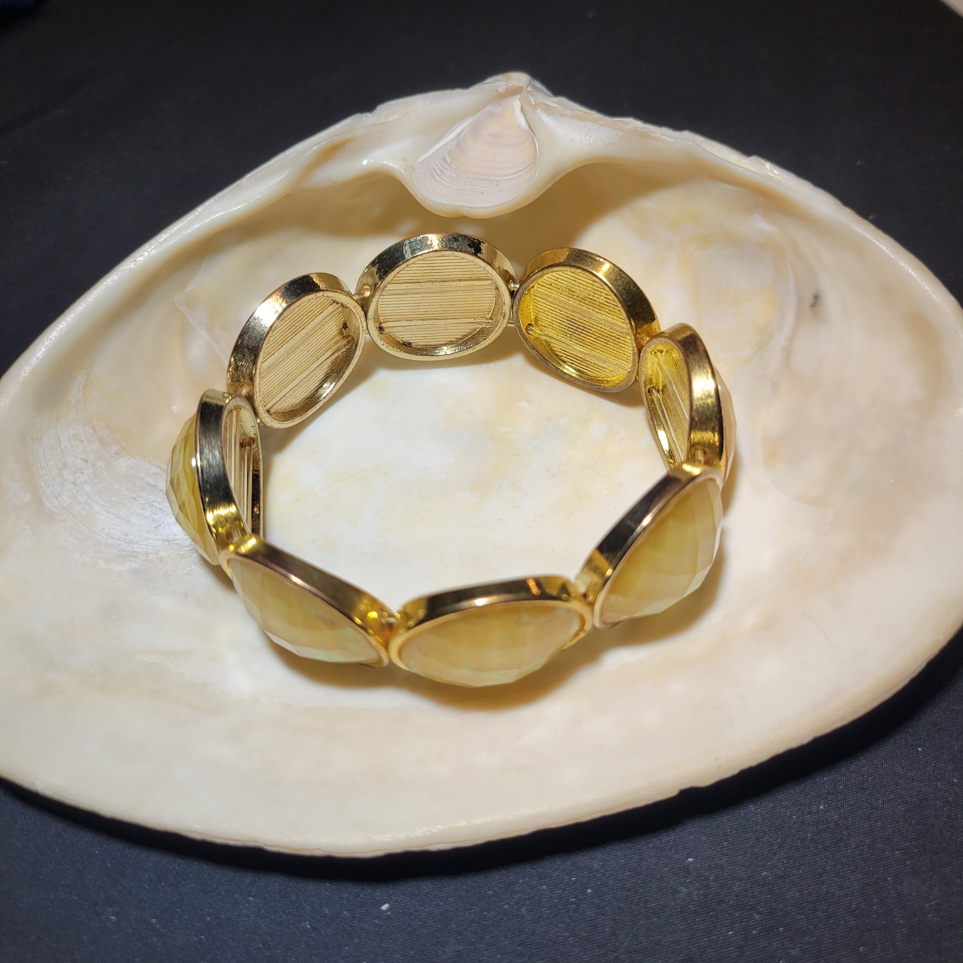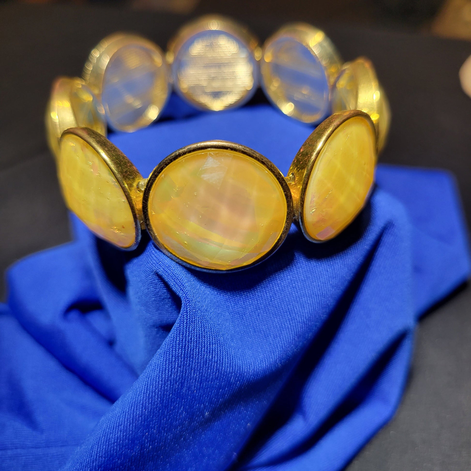 Look stunningly beautiful wearing this yellow, iridescent beaded bracelet. Its round beads and elastic fit will keep you comfortable while showcasing your style. Let your wrist shine with this irresistible accessory!