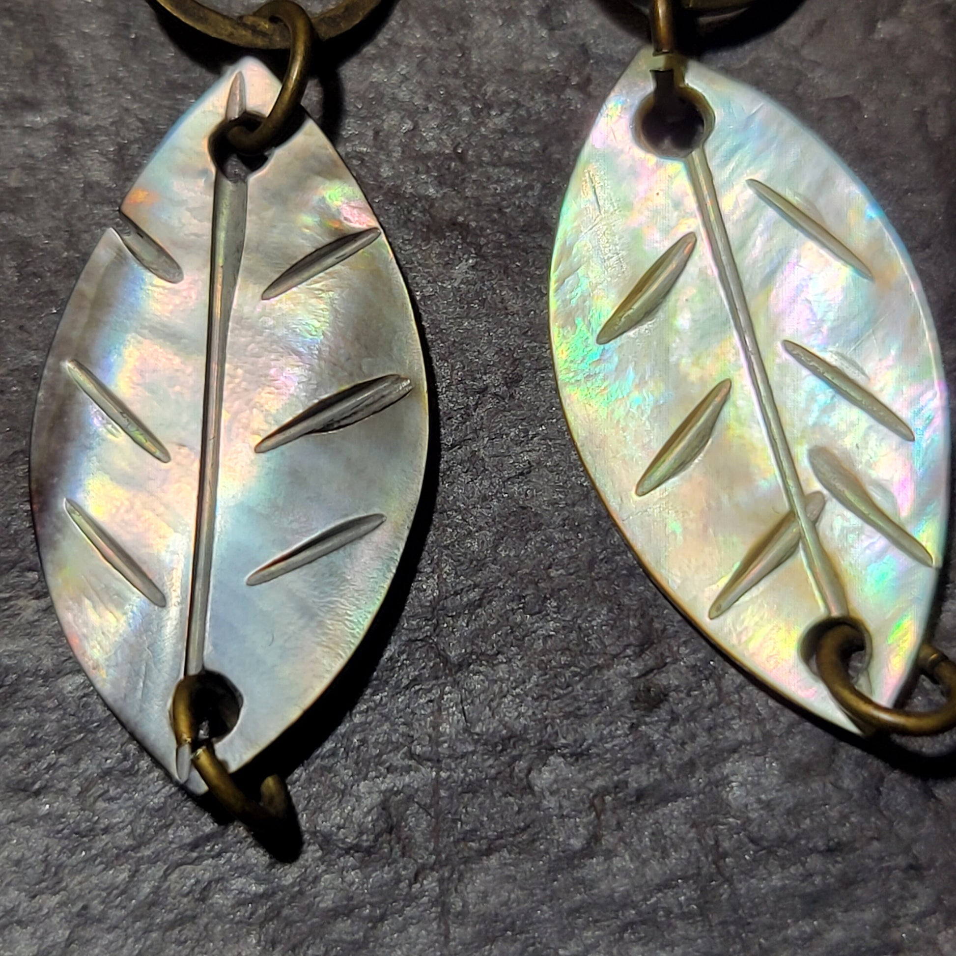 These leaf earrings have an iridescent color so they look like plain leaves in one light and a rainbow in another. The leaves are hanging from antique rings and ear wire and dangle about an inch from your earlobe.Materials: leaf charms, ear wire