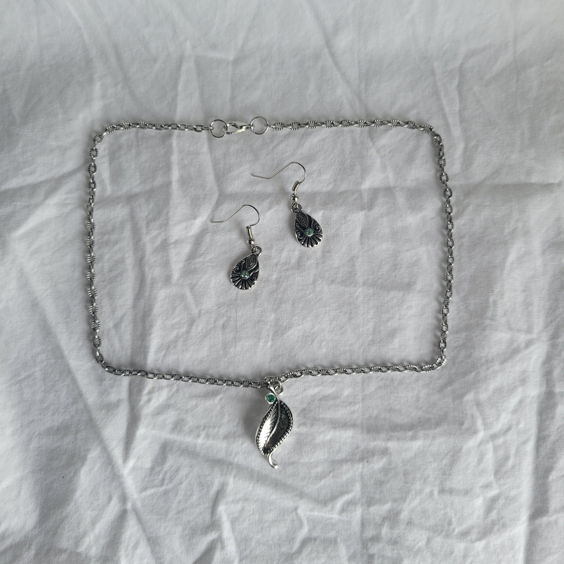 Look stunning and elegant in our Leaf Jewelry Set. Featuring a 1" leaf charm suspended on a 17" chain with teardrop earrings, this piece gives you an inspiring natural look. Perfect for any occasion, you'll be sure to turn heads!