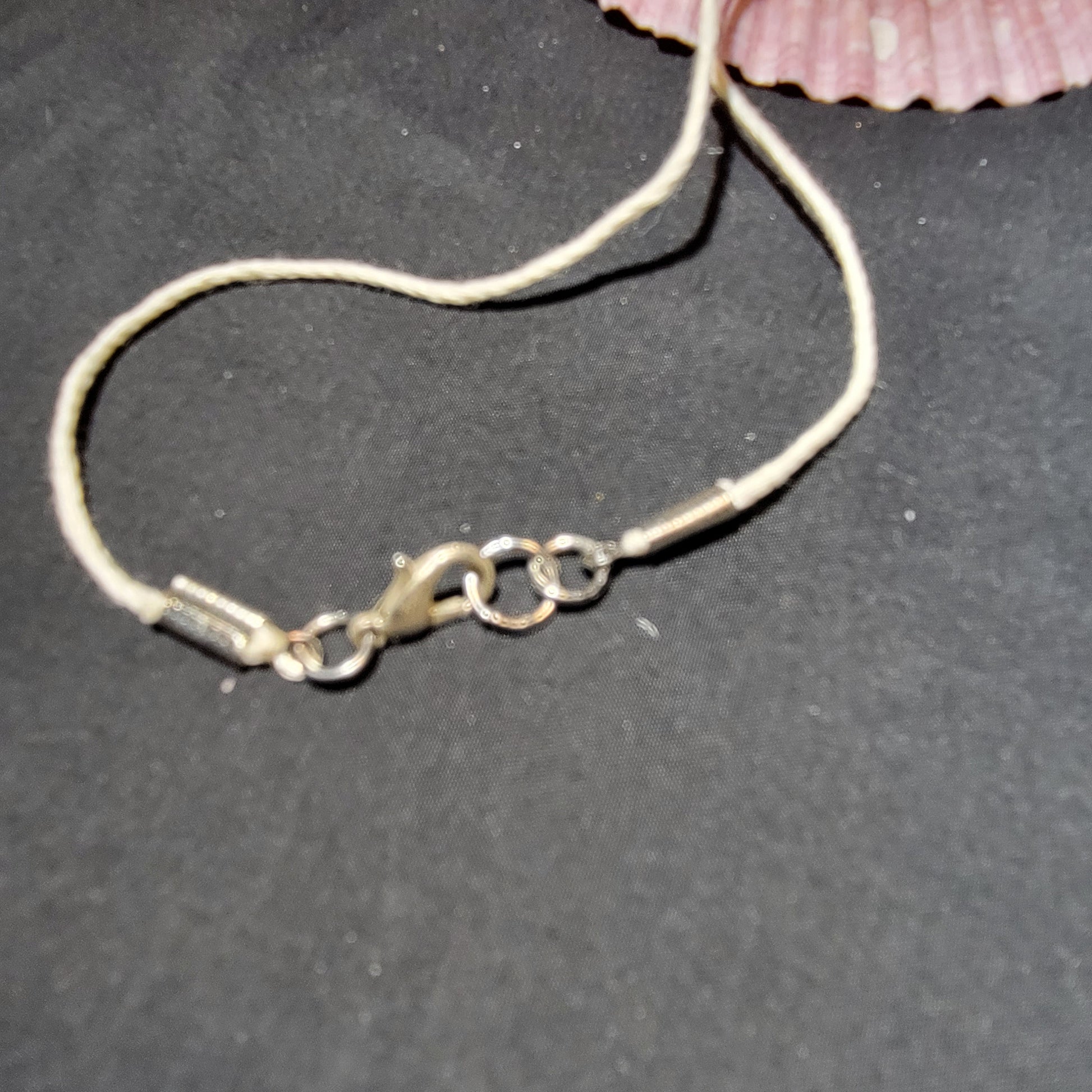 Materials: round leaves and arrows hollow pendant, white cord, crimp ends, jump rings, lobster clasp