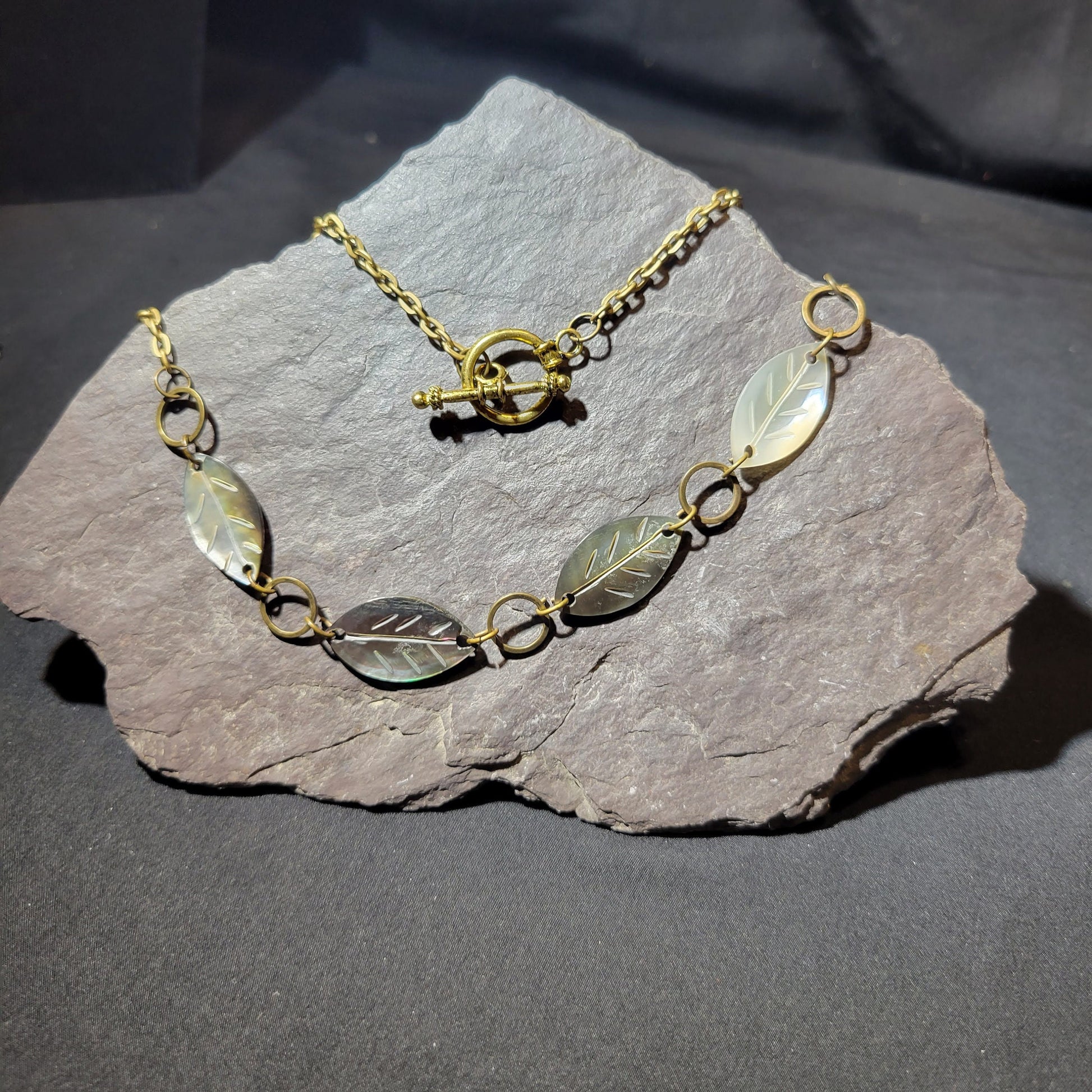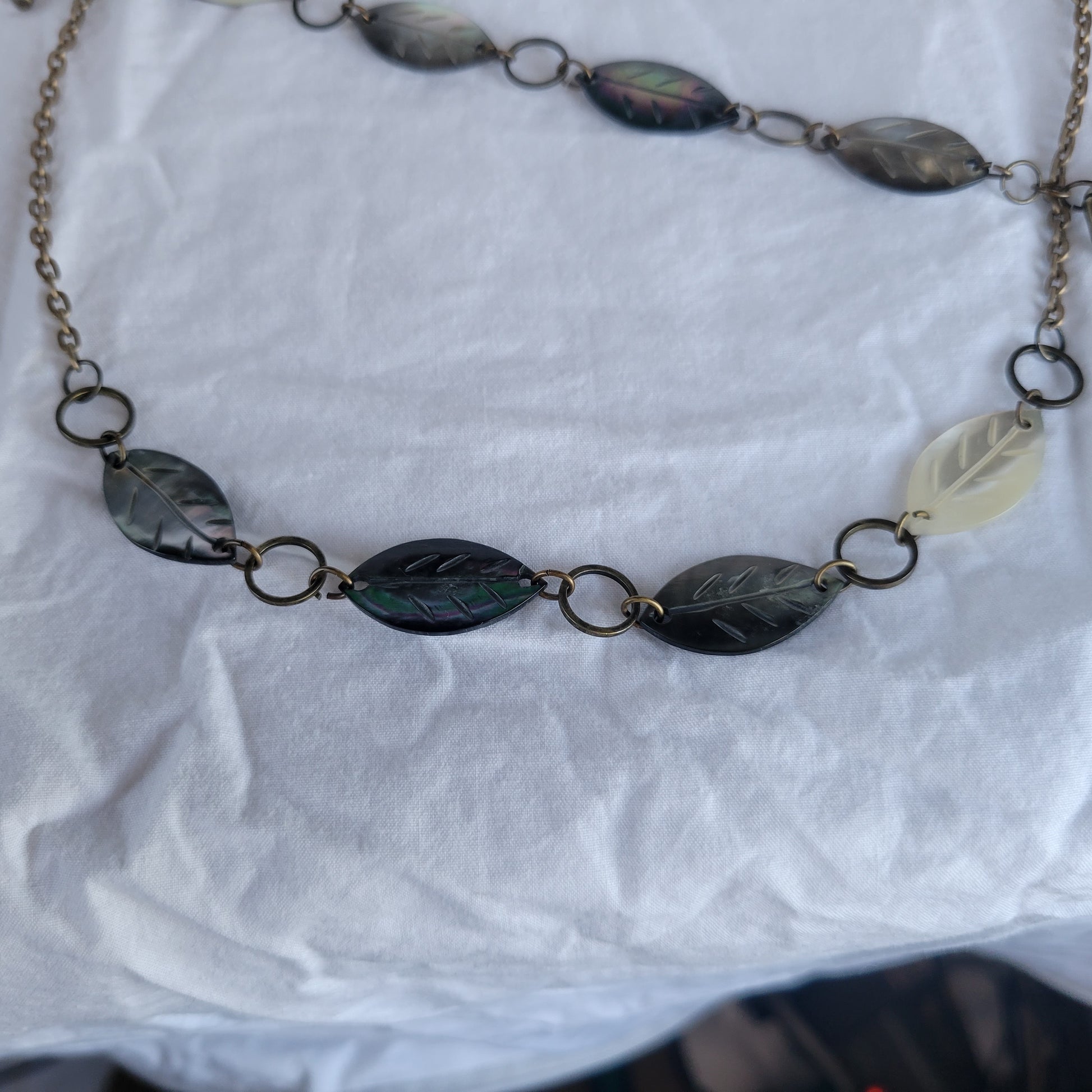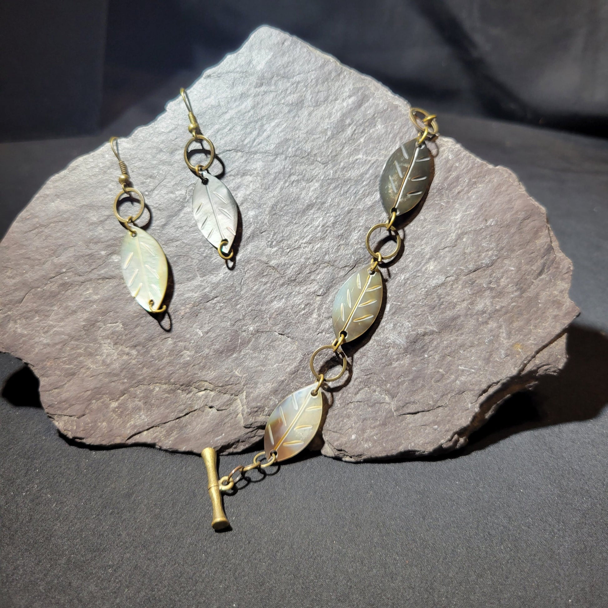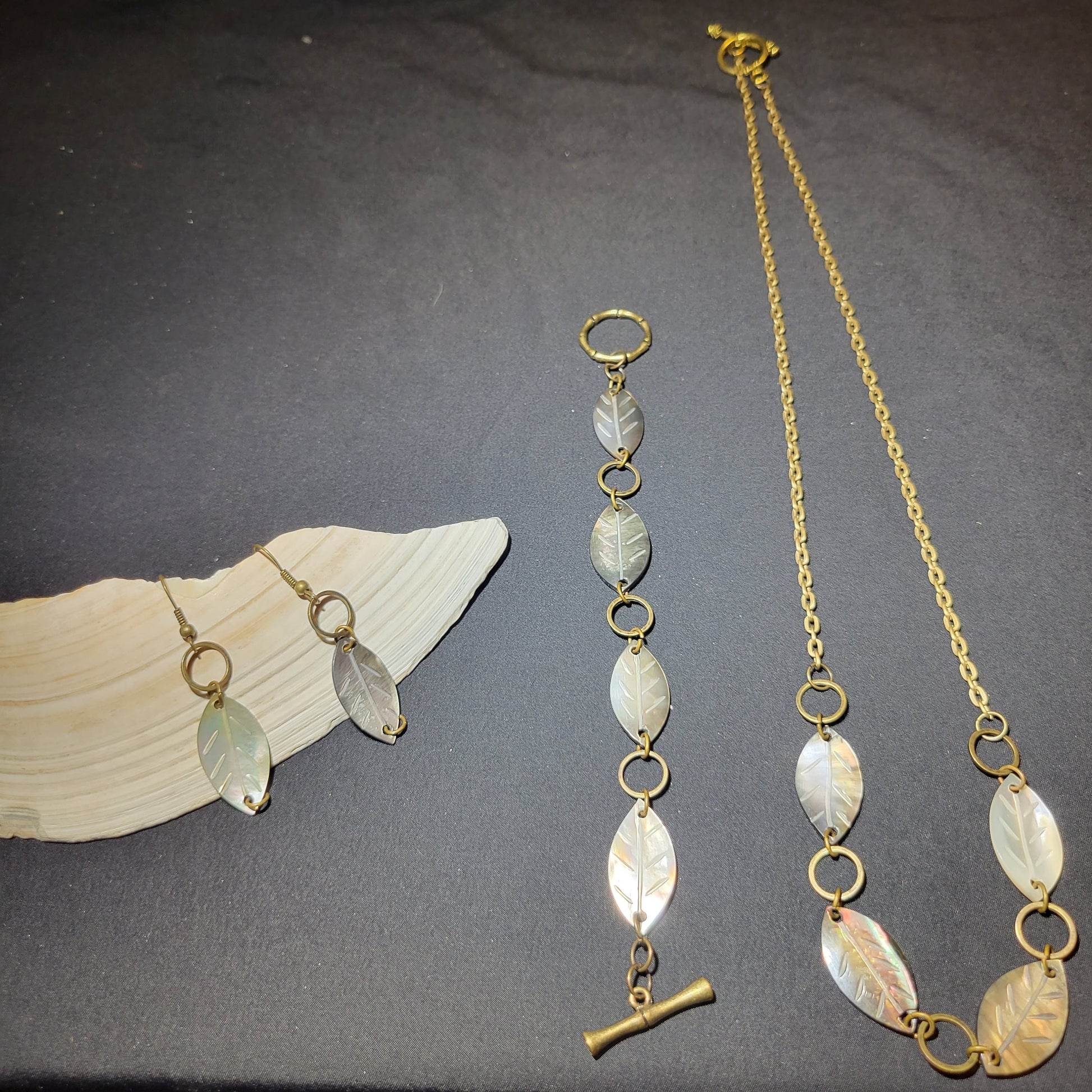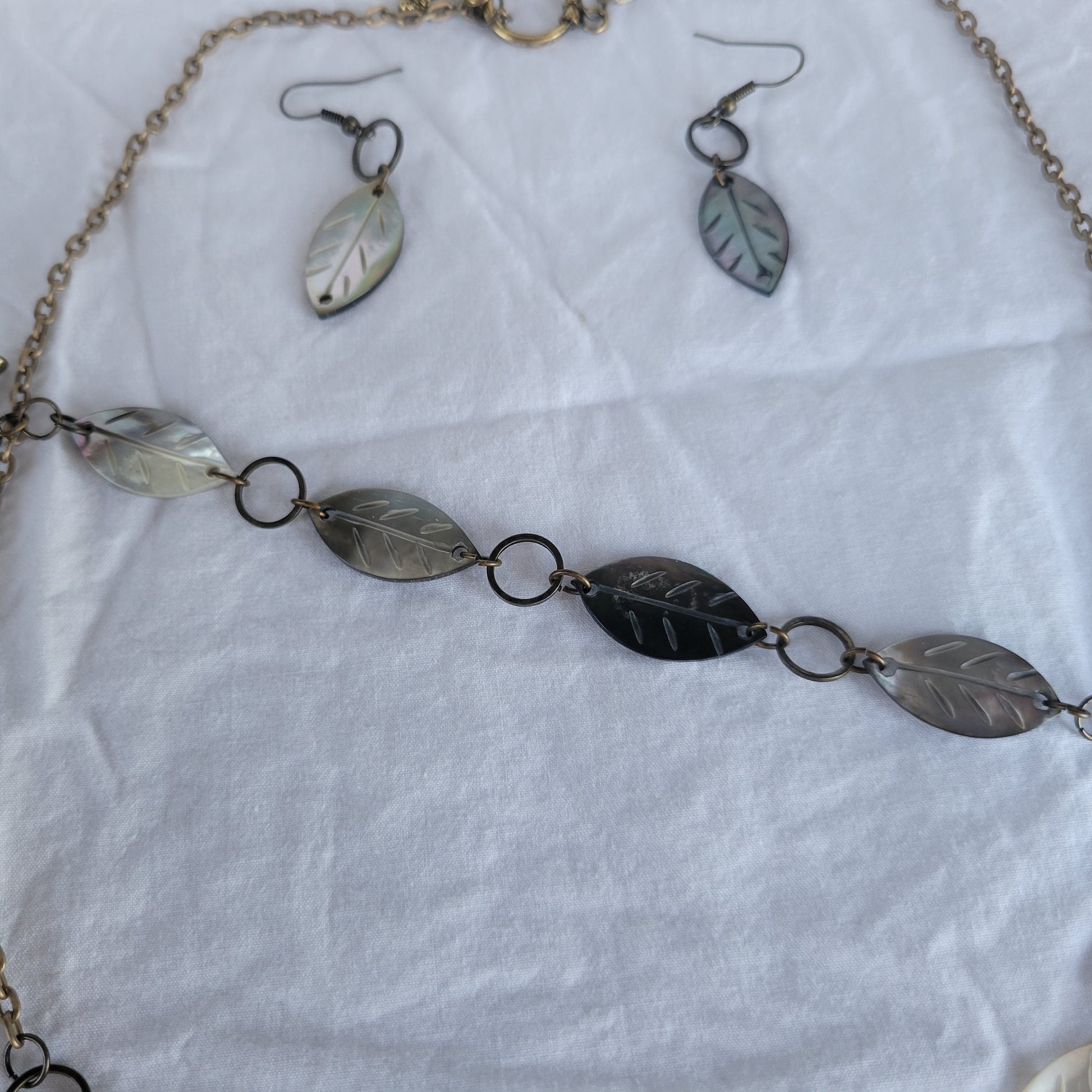 This jewelry set includes iridescent leaf beads on an antique gold chain necklace with a toggle clasp; a bracelet of these leaves with a toggle clasp; and earrings with leaves dangling from earring hooks.Materials: iridescent leave beads, jump rings, toggle clasps, earring hooks