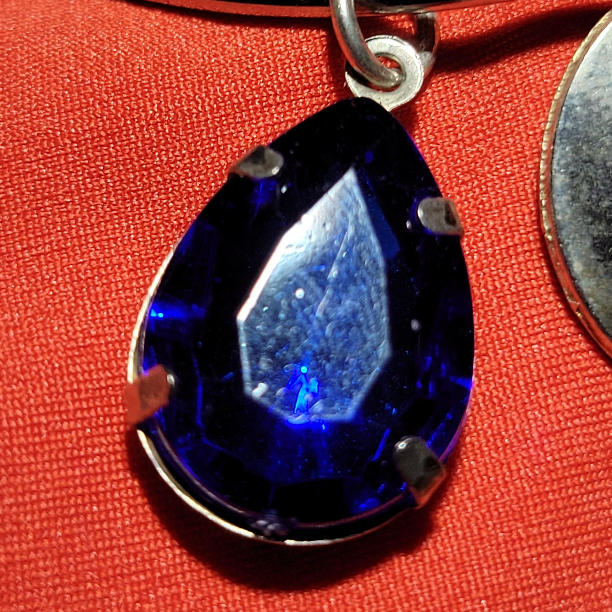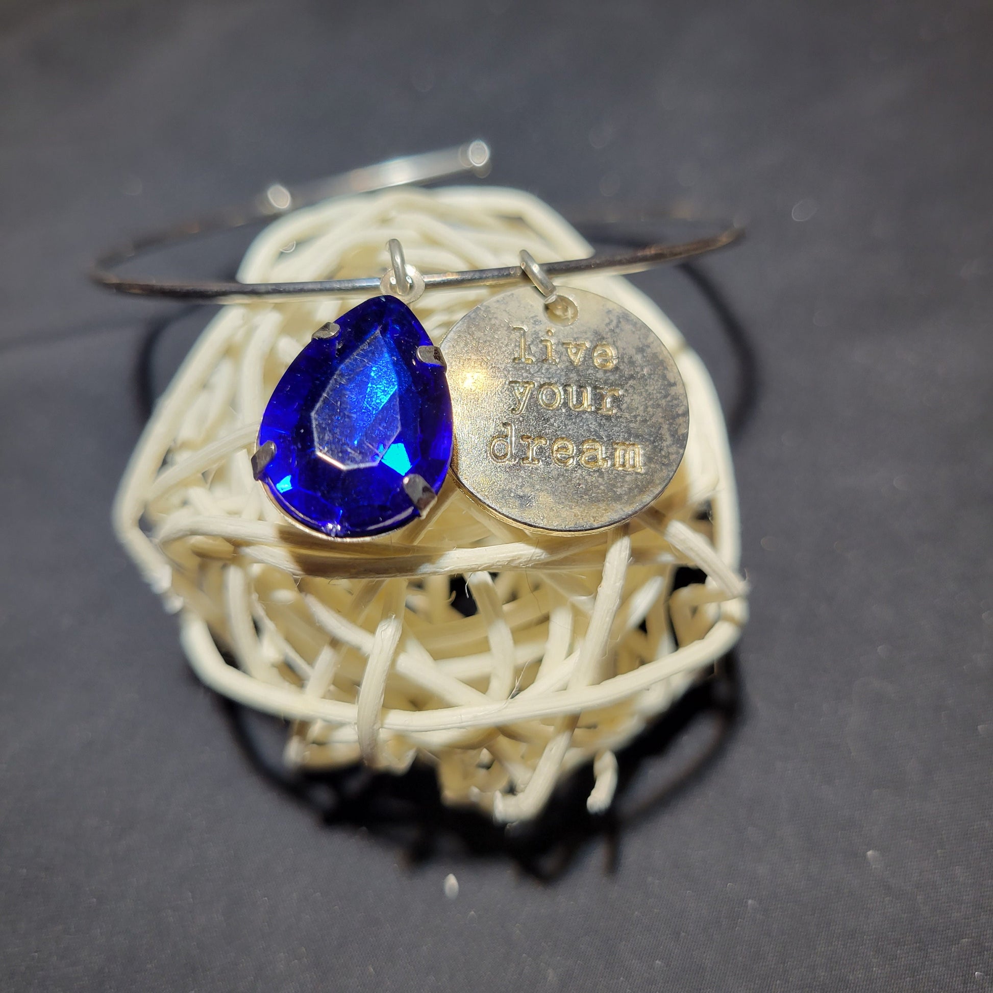 This slightly adjustable bracelet holds two charms you can wear together or separately. One is a charm stamped with Live Your Dream and the other is a dark blue glass teardrop.Materials: blue glass teardrop, metal plate with words, rigid bracelet frame