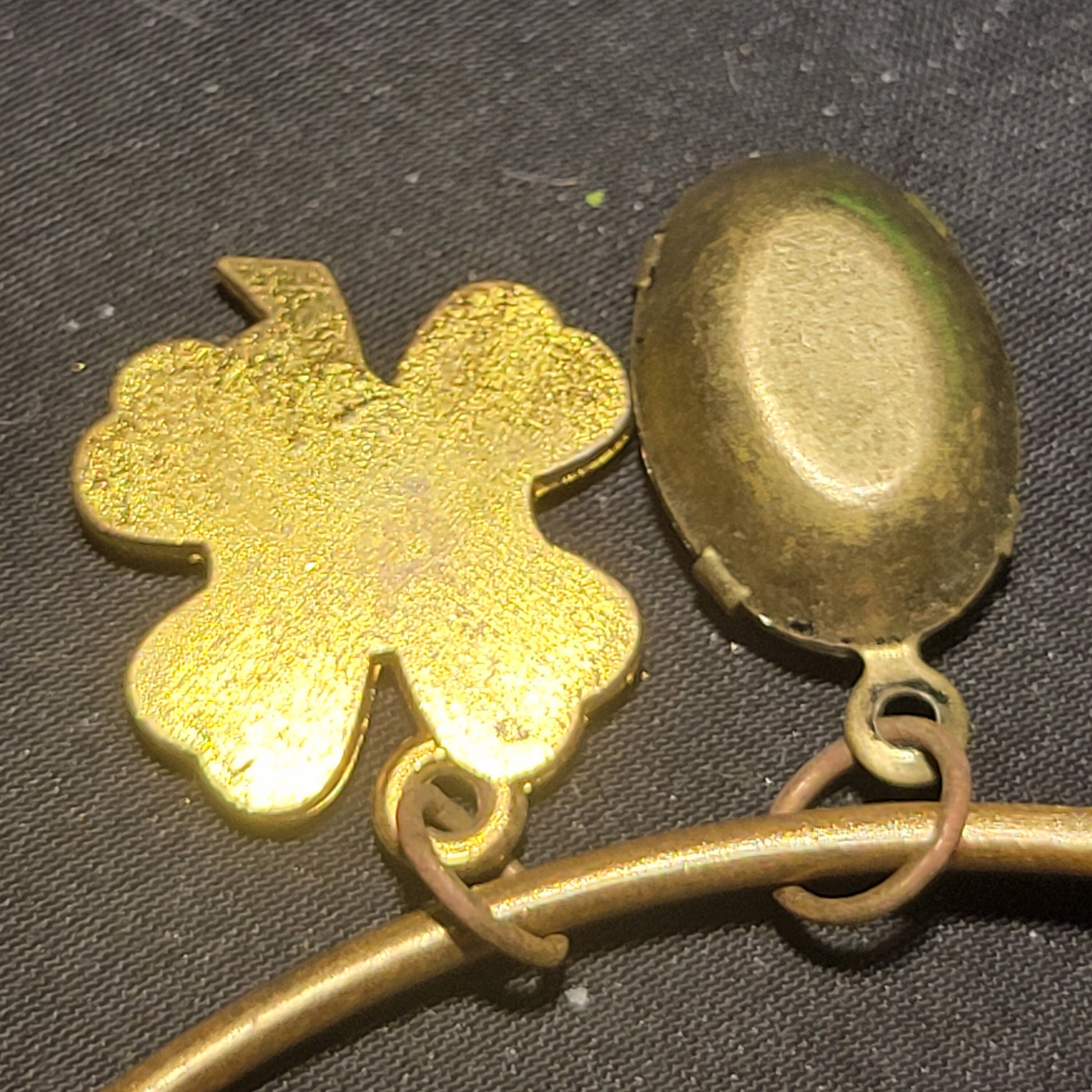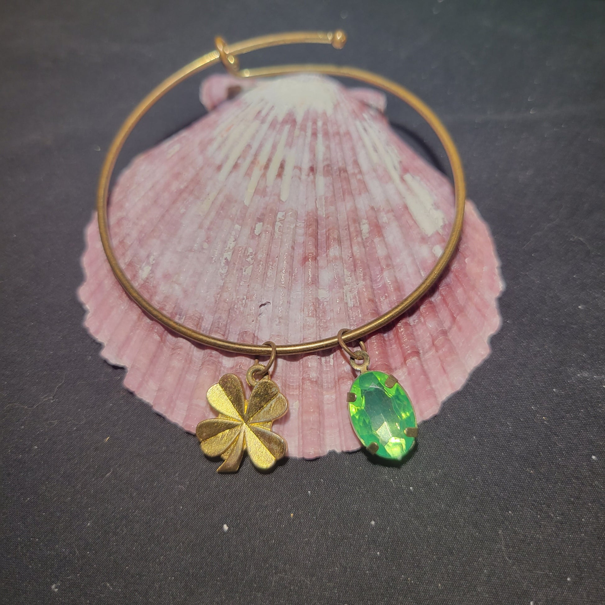 This rigid bracelet with an expandable closure contains a gold 4-leaf clover charm and a complementary green glass gem charm. It can fit most wrists due to the type of closure it has.Materials: 4-leaf clover charm, green glass charm, rigid bracelet
