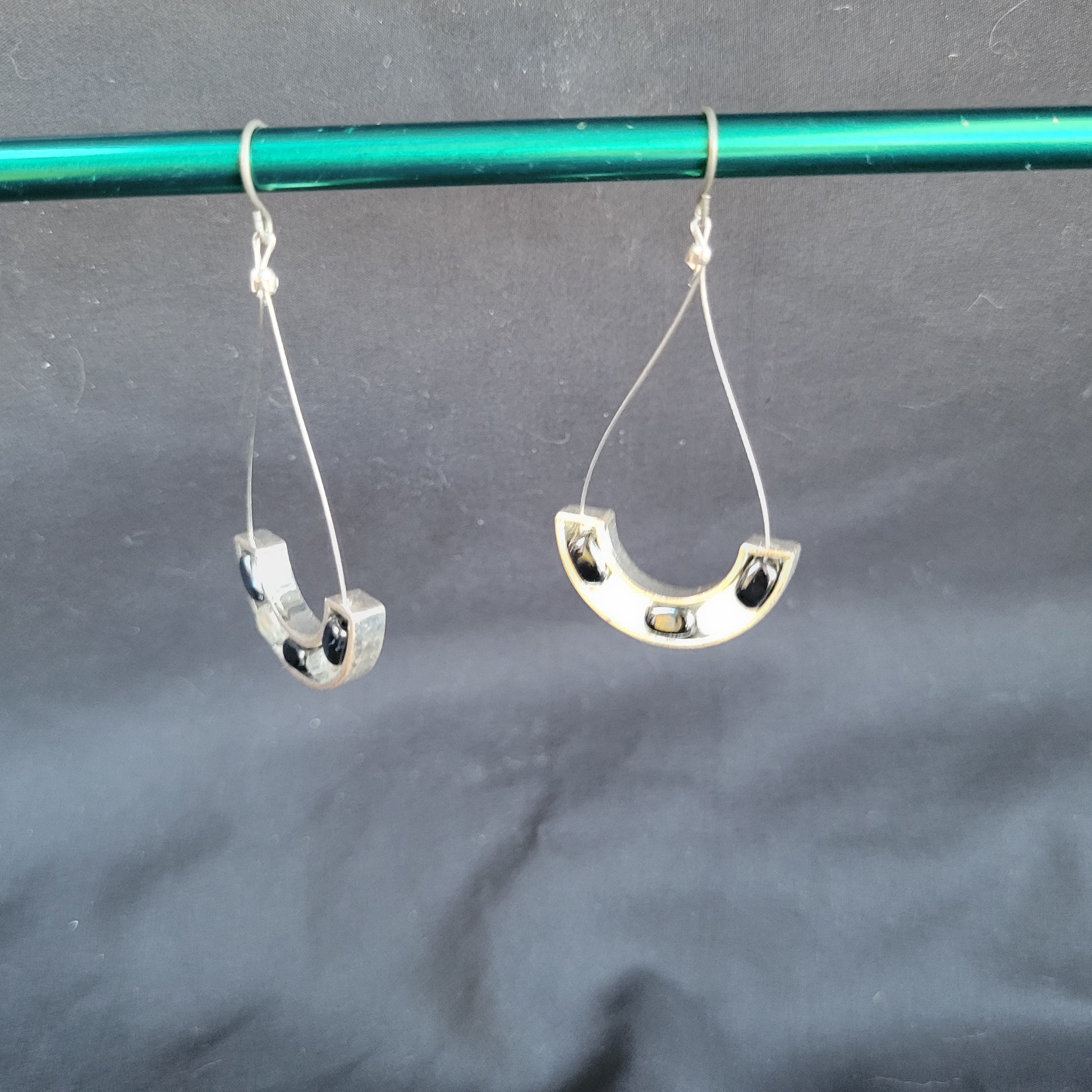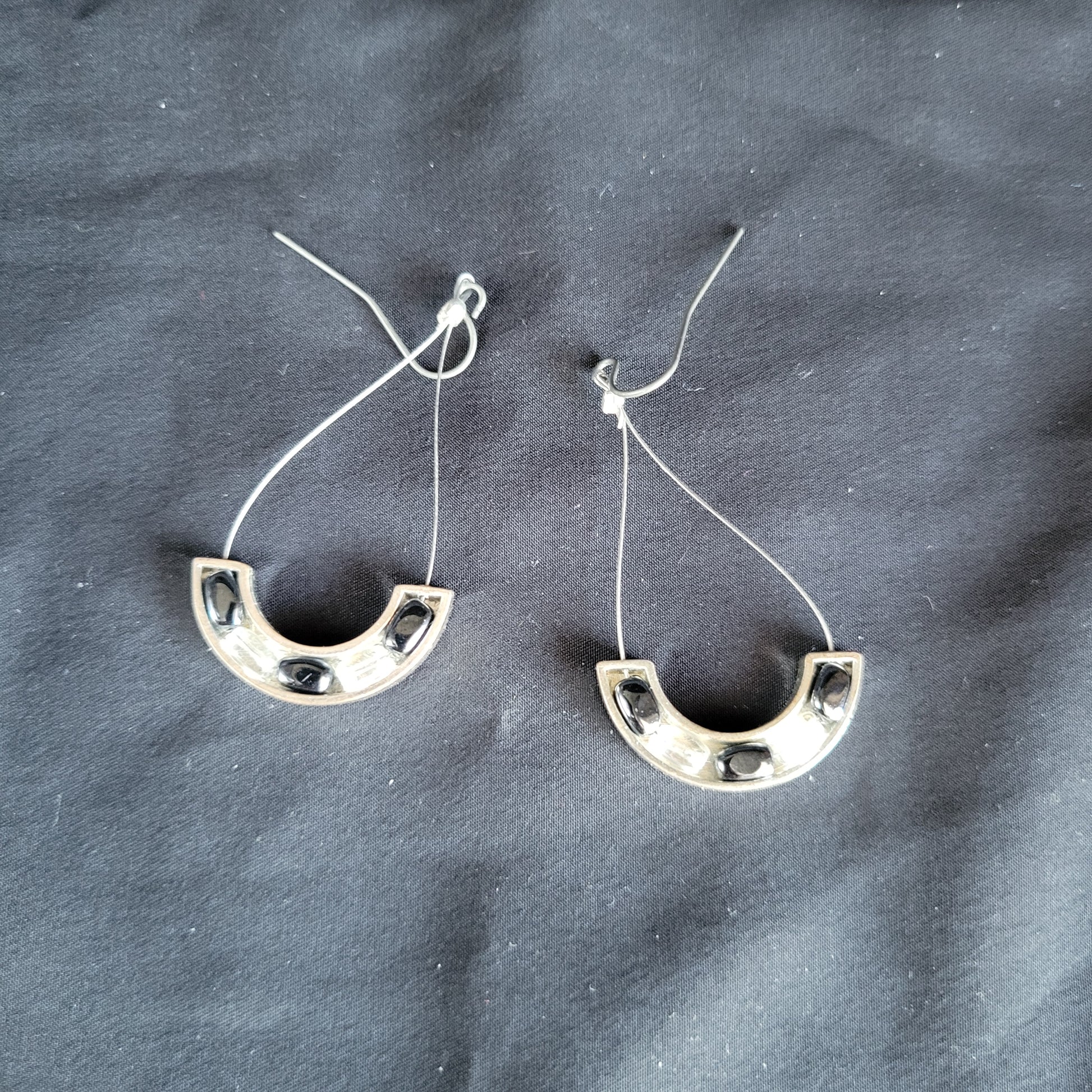 Introducing our exquisite Metal Crescent on Wire Teardrop Earrings. Crafted with delicate hematite and clear oval beads, they effortlessly dangle from a sleek hollow metal crescent. Adorned with matte gunmetal hooks, these earrings are perfect for adding a touch of sophistication to any outfit. Elevate your style with these luxurious and exclusive earrings.
