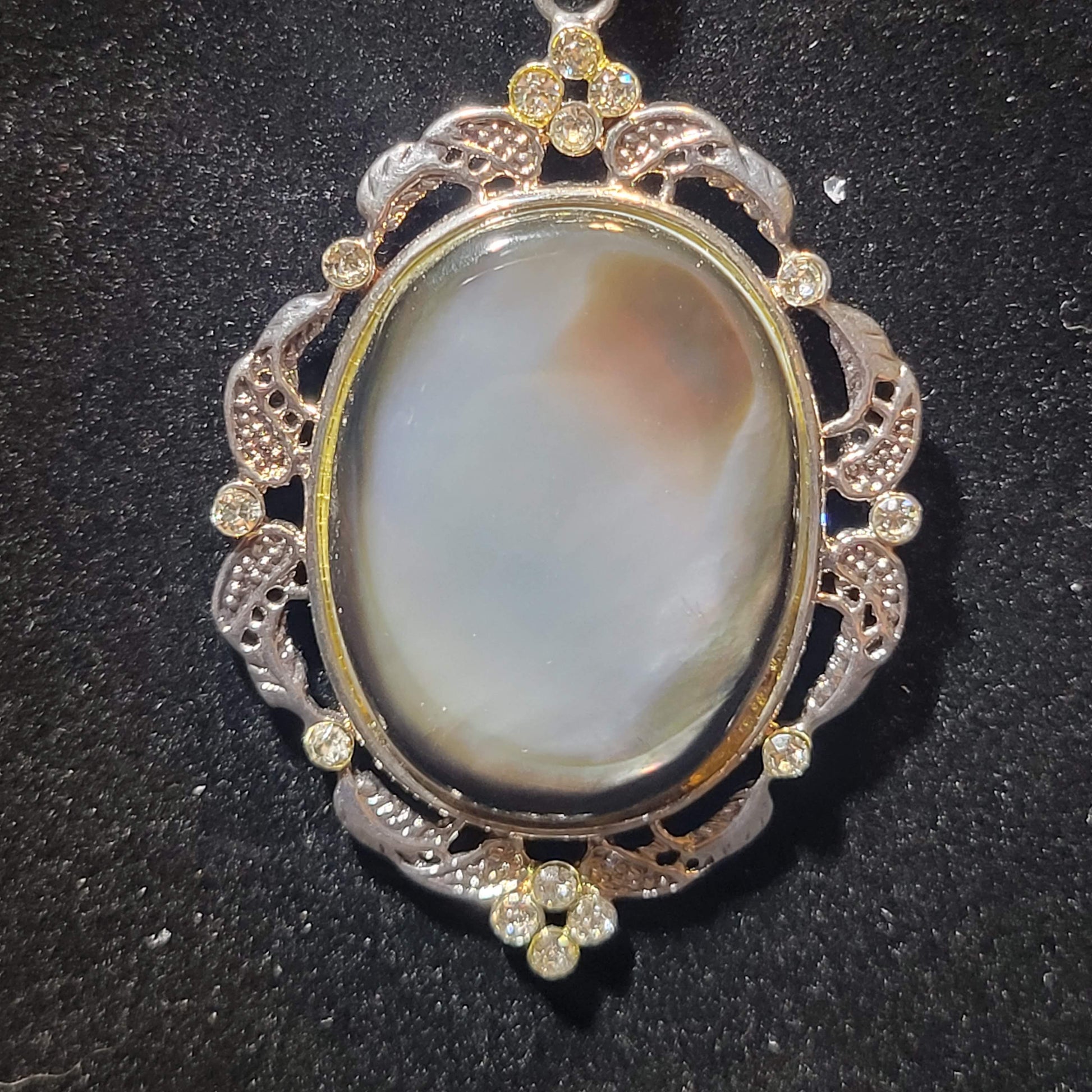 This silver onyx shell pendant with a decorative frame will remind you of the evil stepmother's magic mirror. With silver-plated filigree and solid round beads, this may become your fairest necklace of all.
