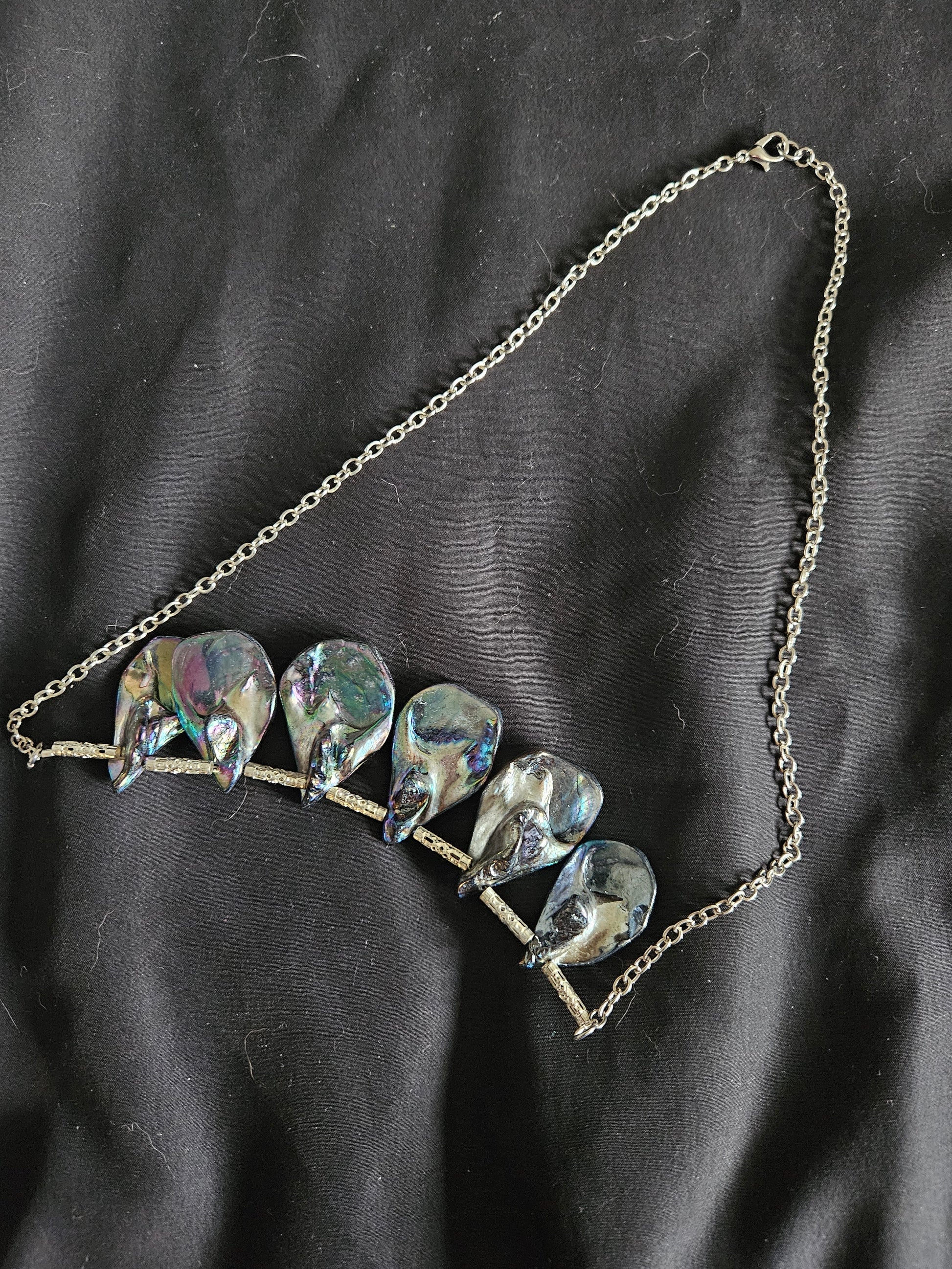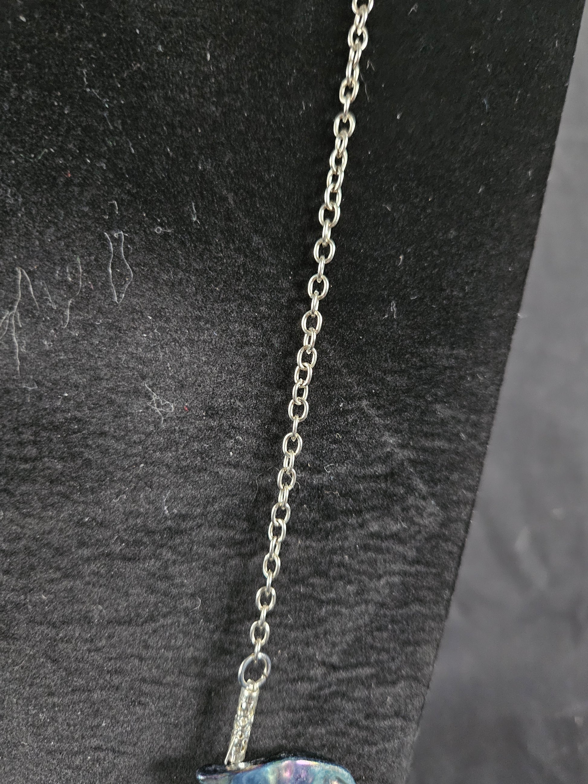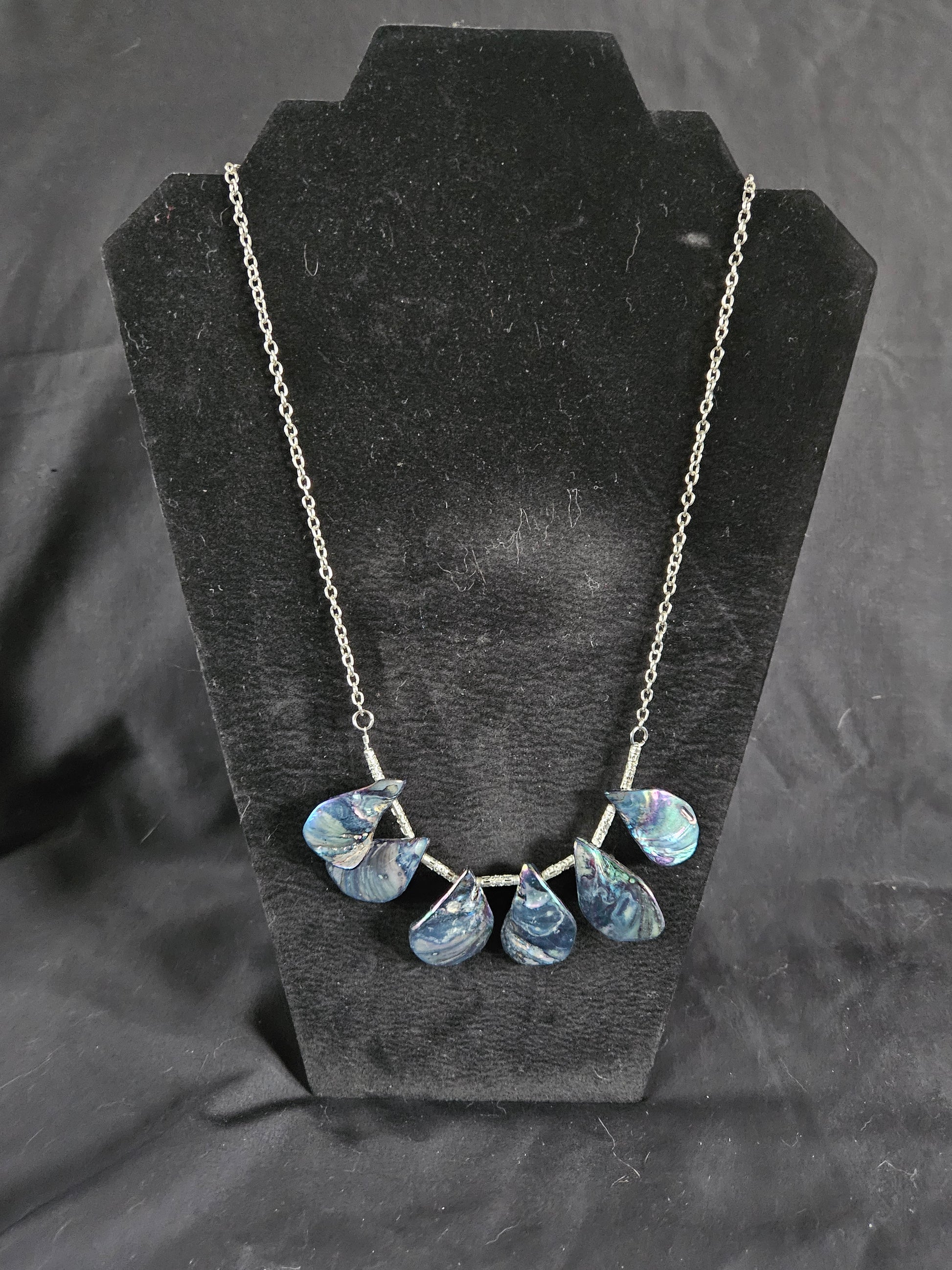 Let your bold style shine with this edgy Muscle Shell Beaded Necklace. Crafted from striking blue shell teardrops and filigree silver tubed, this bold necklace is sure to turn heads! Show off your unique style today.