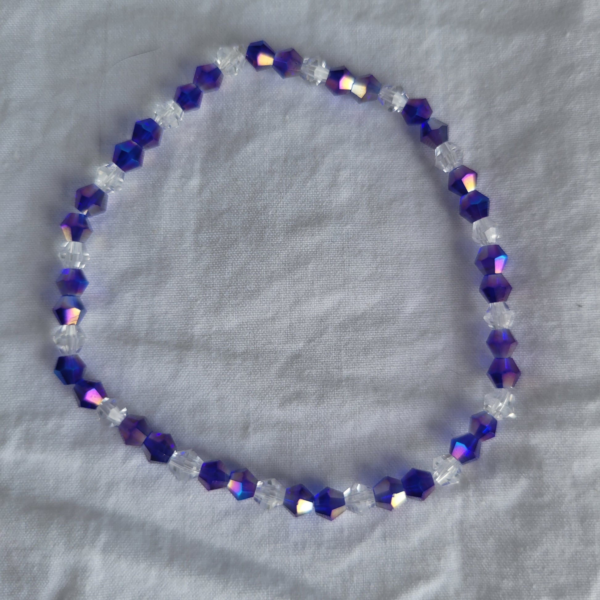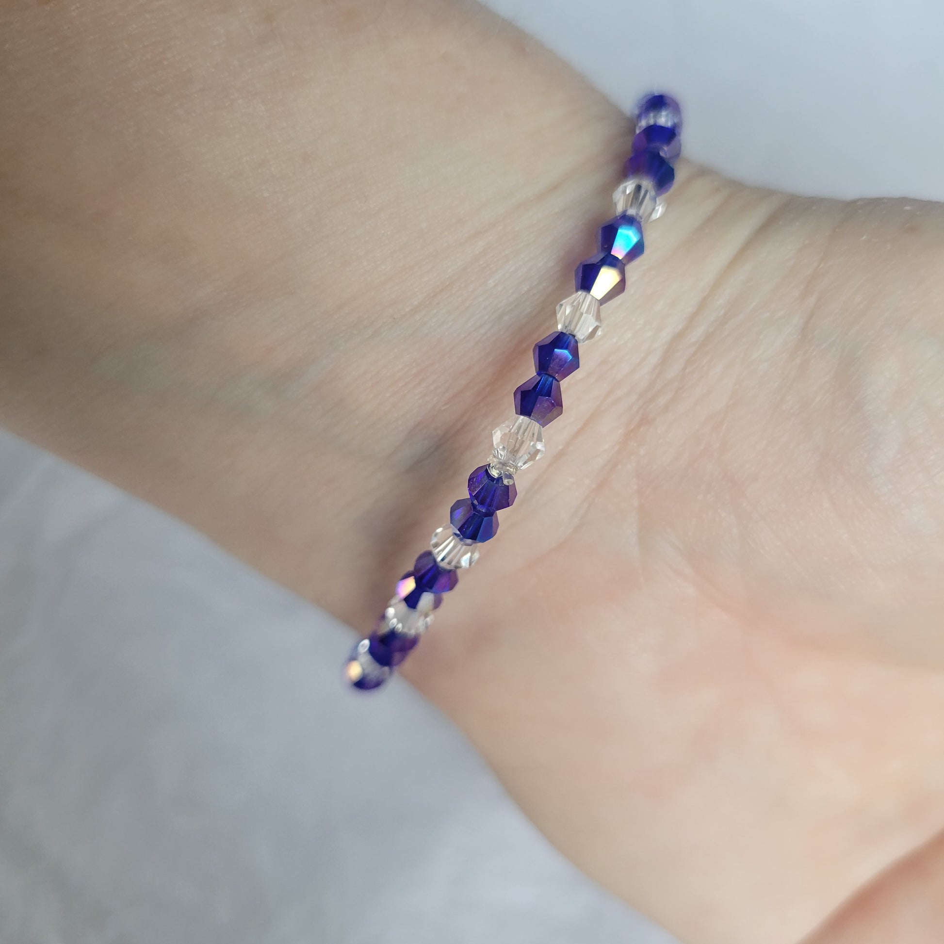 Adorn your wrists with this eye-catching bracelet! Featuring purple and clear bicone beads strung on elastic, this bracelet is the perfect accessory for any ensemble. Its shimmering, colorful beads will make you stand out from the crowd and add a splash of vibrant color to your wardrobe.