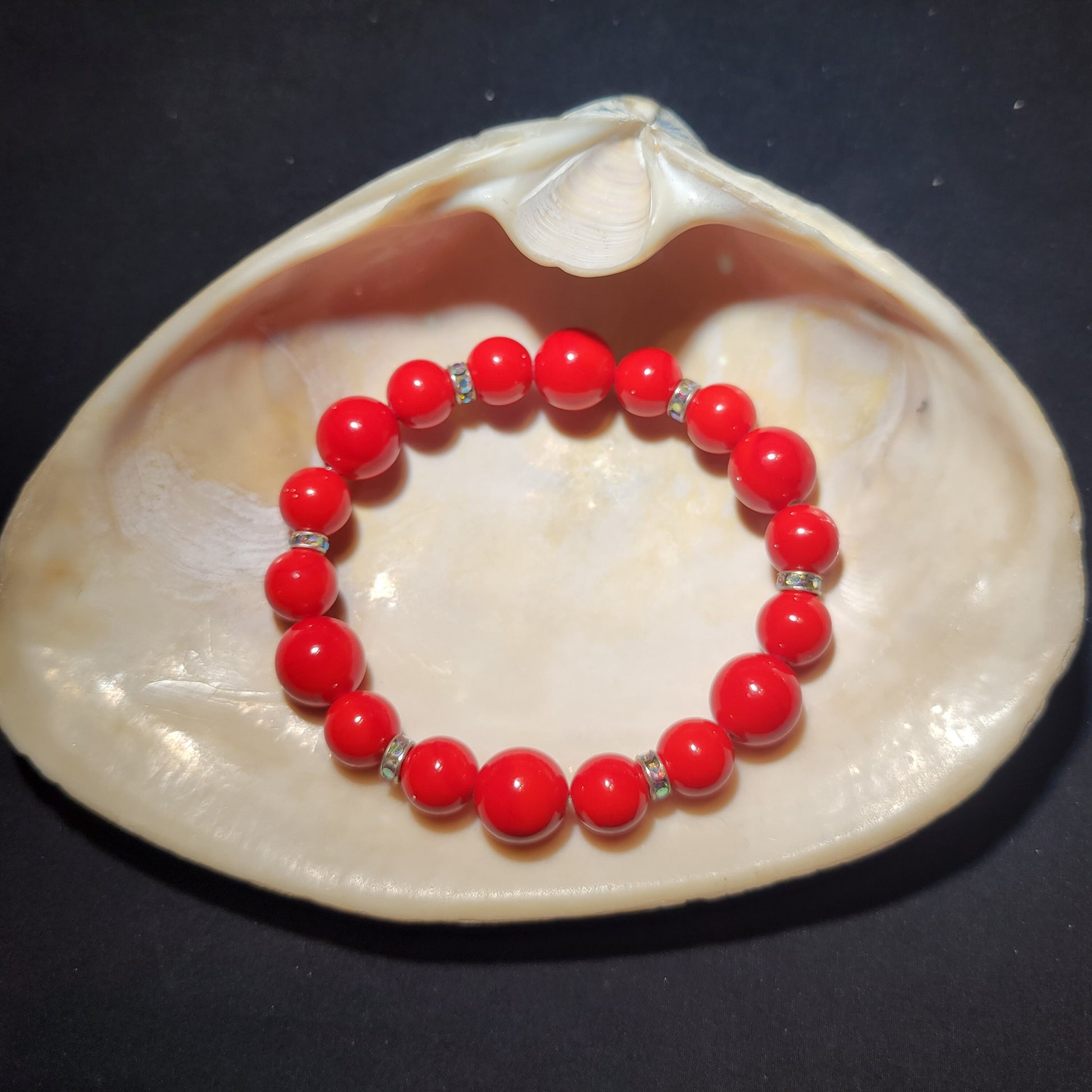 This stretch beaded bracelet features two sizes of round red beads and crystal rondelles which adds sparkle to this vibrant-colored piece of jewelry.Materials: red round beads, crystal rondelles, elastic string