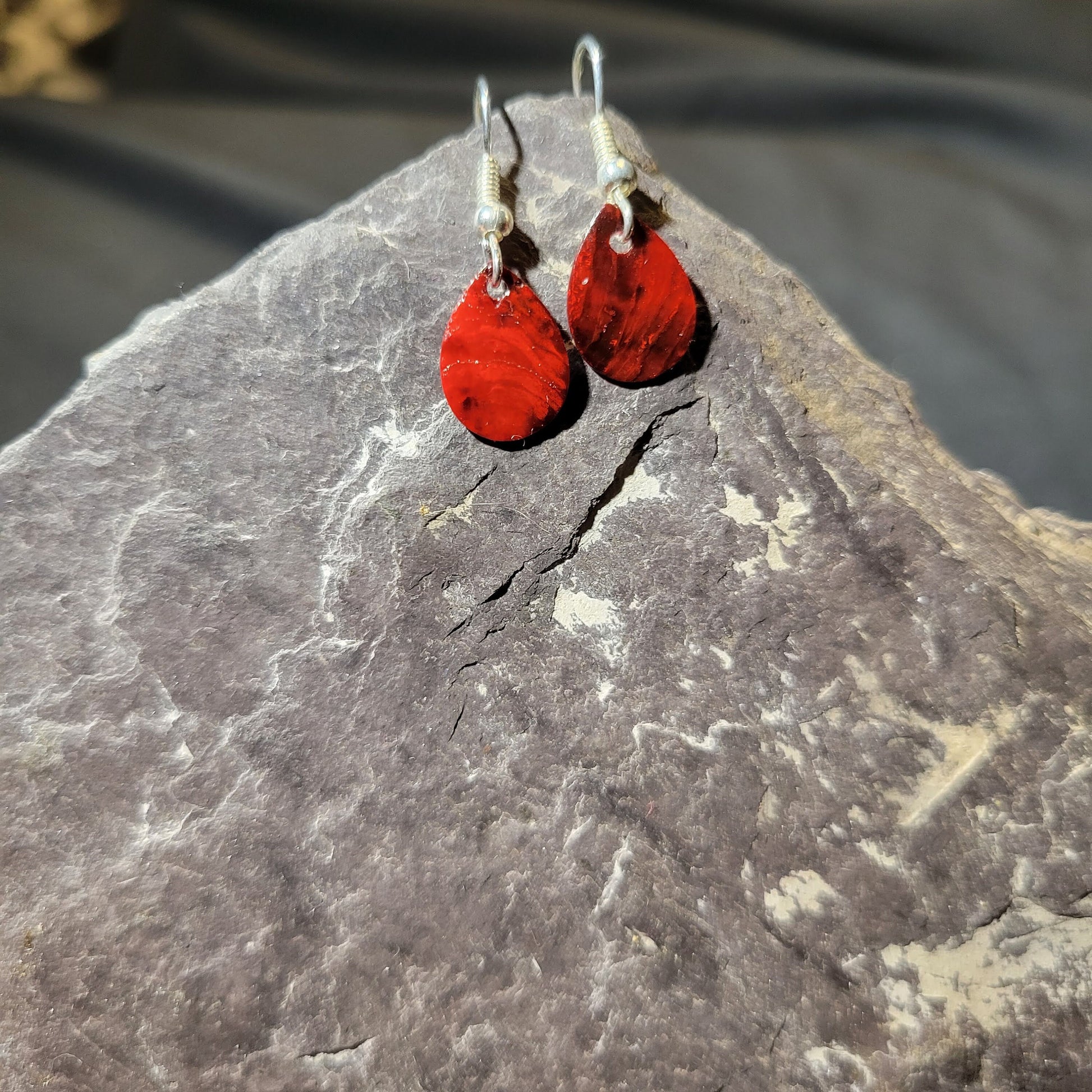 Red teardrop made of dyed shell just under 1" dangling from silver hook earrings. One of my favorite materials to use is shell. These red shell slices in a teardrop shape are lightweight and vibrant.