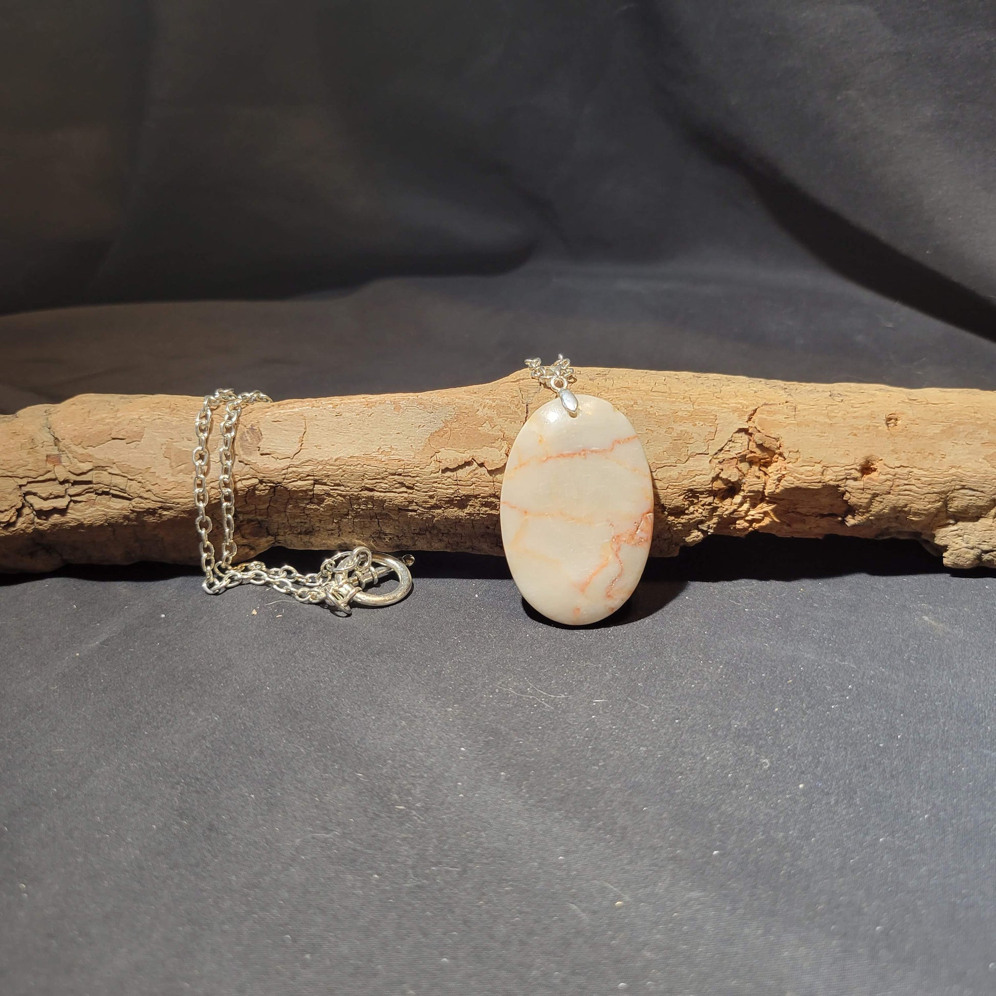 This pendant necklace has a 2-inch oval redline marble pendant with a silver bale hanging from a 27.5-inch silver chain that closes with a toggle clasp.Materials: redline marble pendant, cable chain, toggle clasp, jump rings