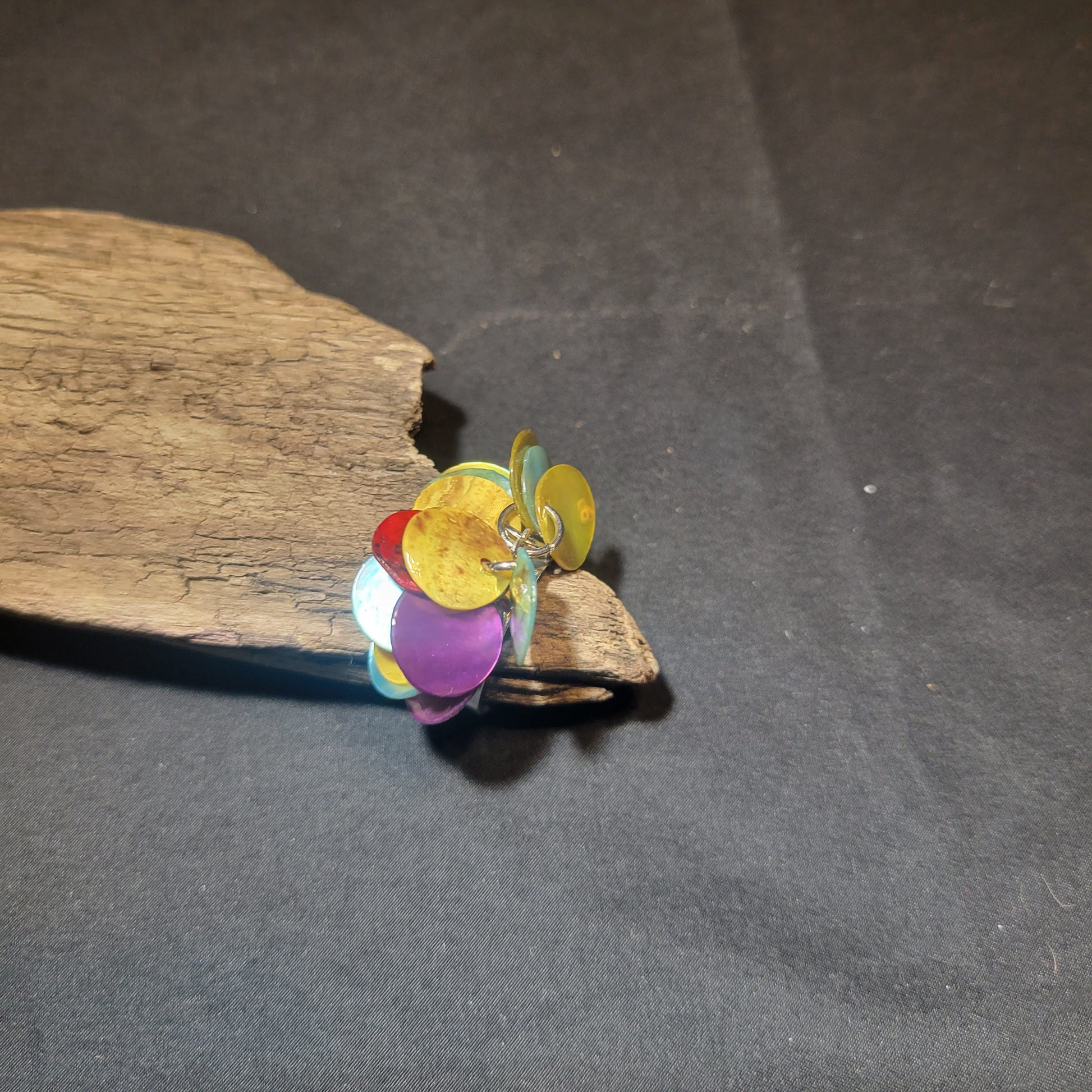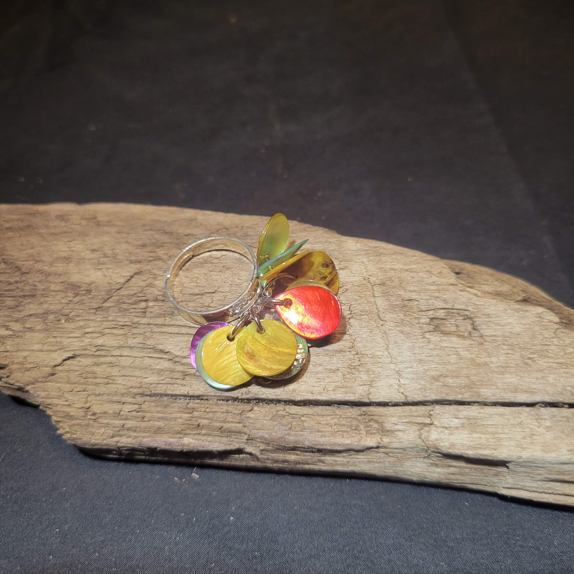 This adjustable statement ring has a variety of round discs of dyed shells attached to one row of connectors. It moves when you move. If you want to bring the beach with you wherever you go, this is the ring for you. It goes with any outfit since the shells are all different colors.