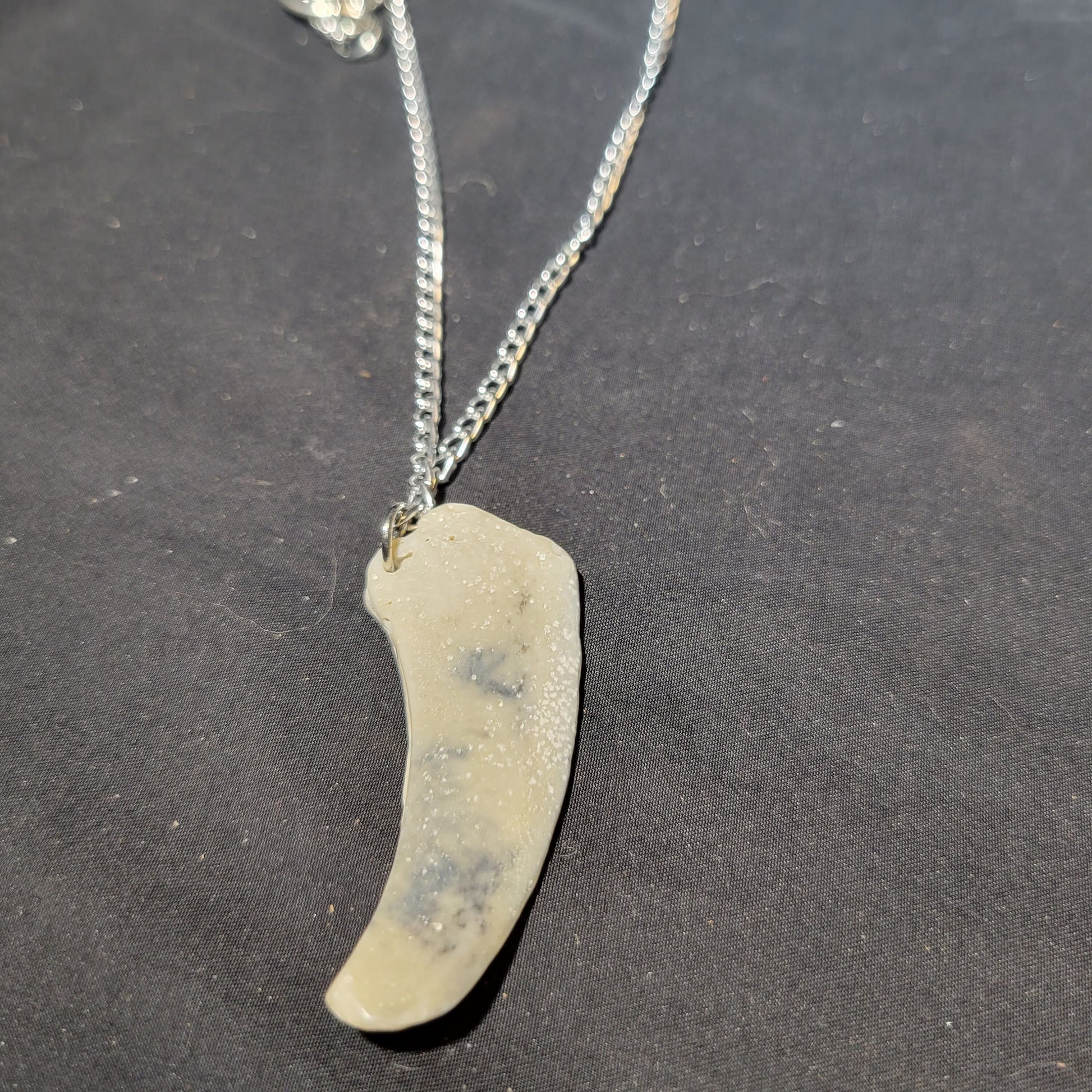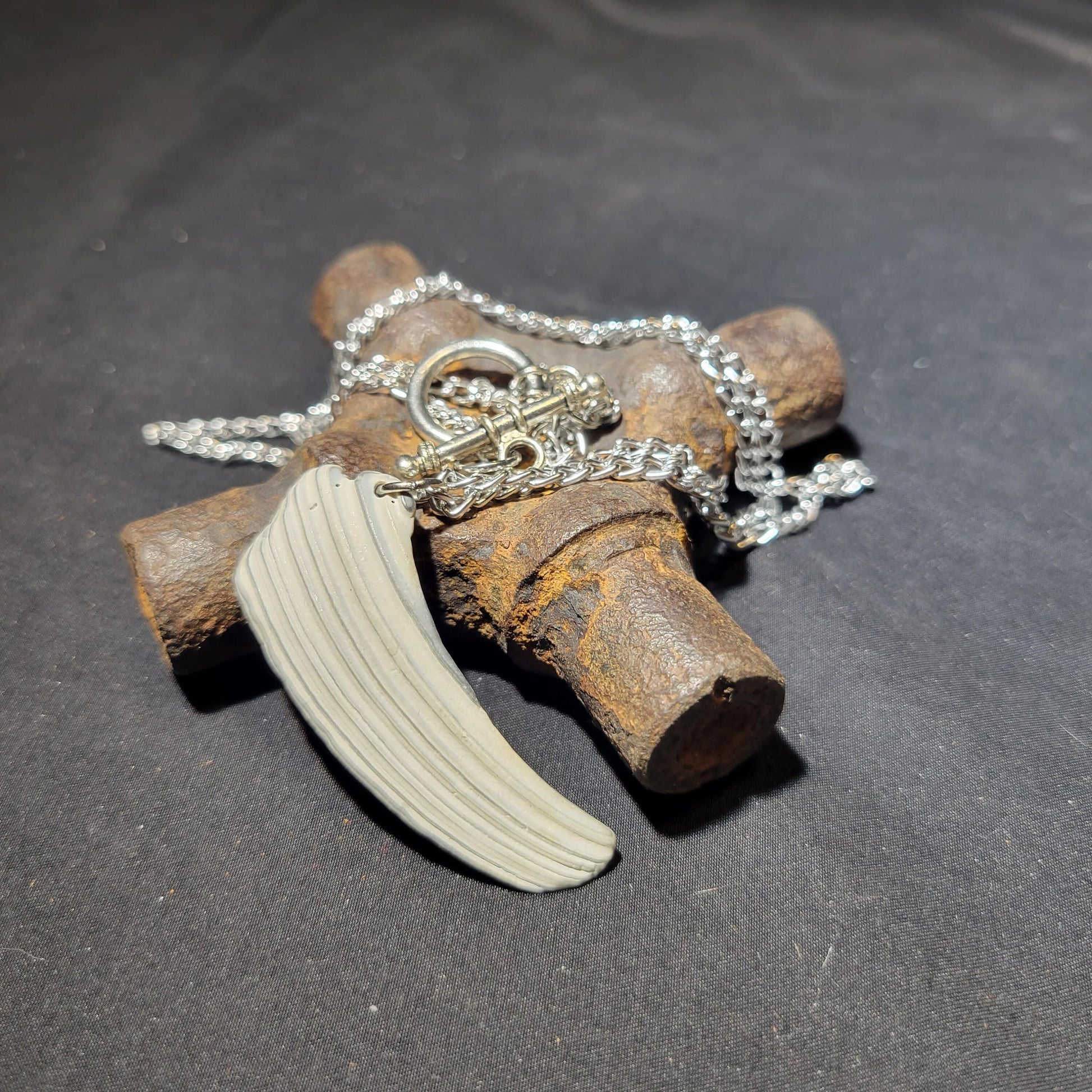The pendant of this necklace is an actual shell fragment from the Jersey Shore that is about 2 inches long. It hangs from a 27.5-inch silver chain with a toggle clasp.Materials: Shell