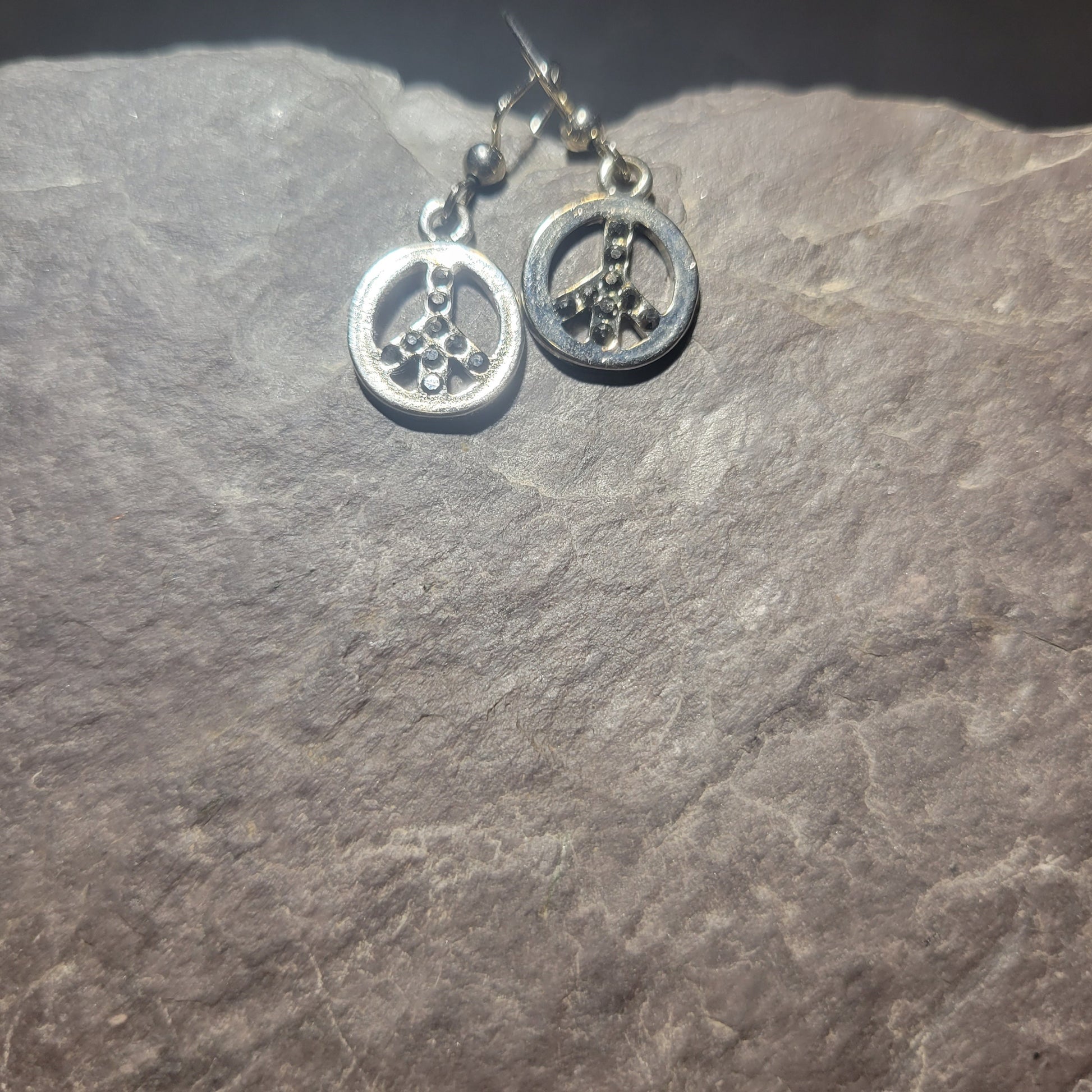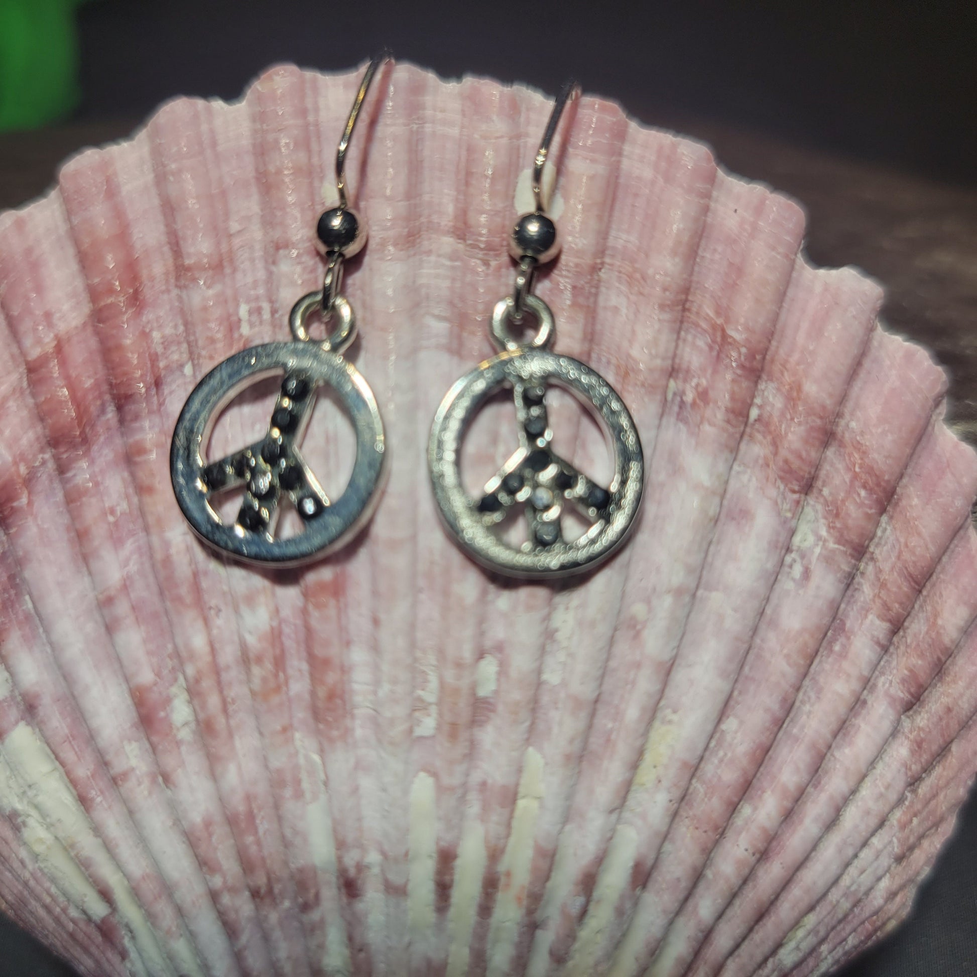 They are small but have a mighty message of peace to all. The peace sign charm is about half an inch and has crystals on the inner lines of the symbol making it sparkle as it hangs from your ear.Materials: peace charms, ear wire